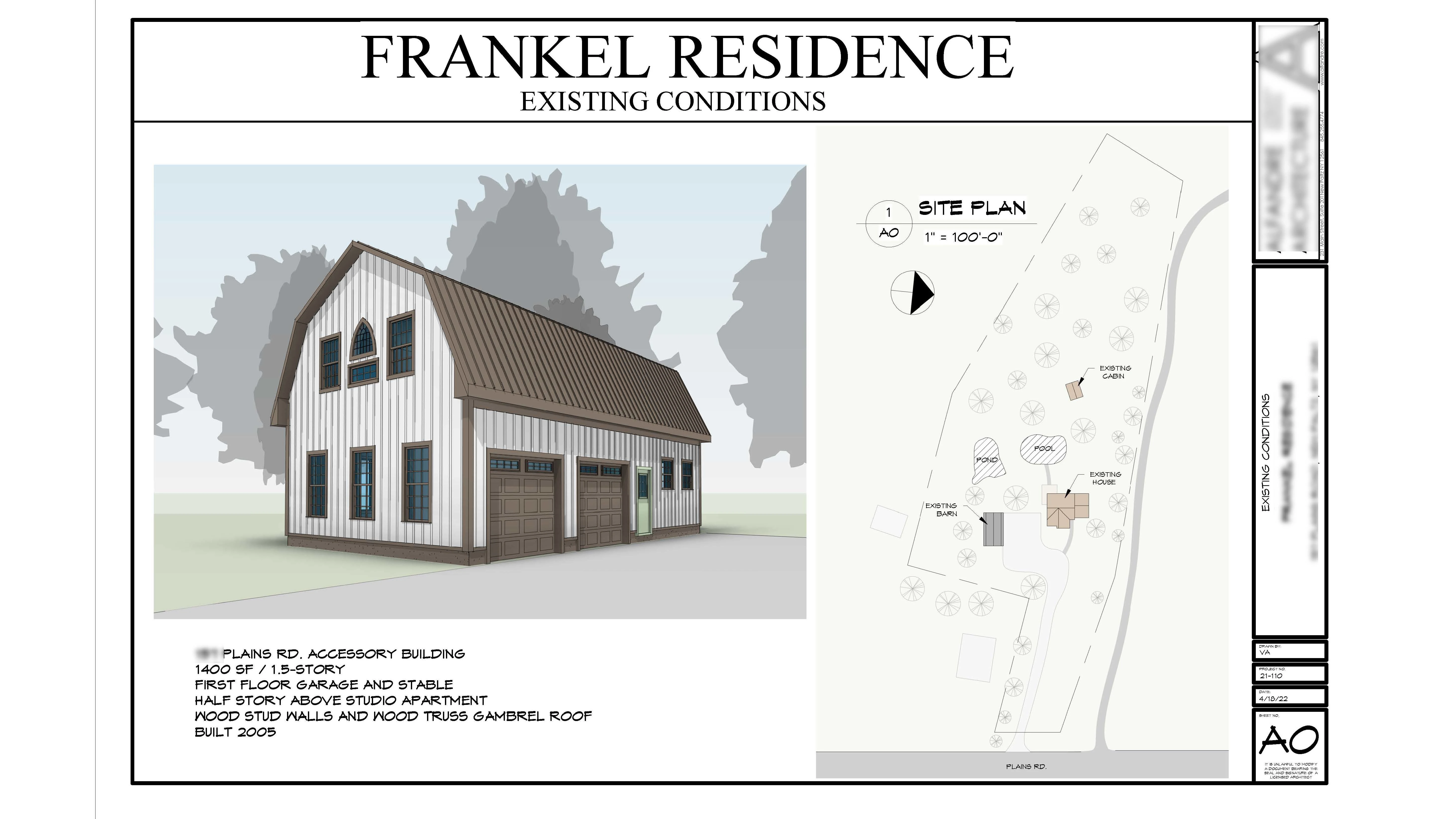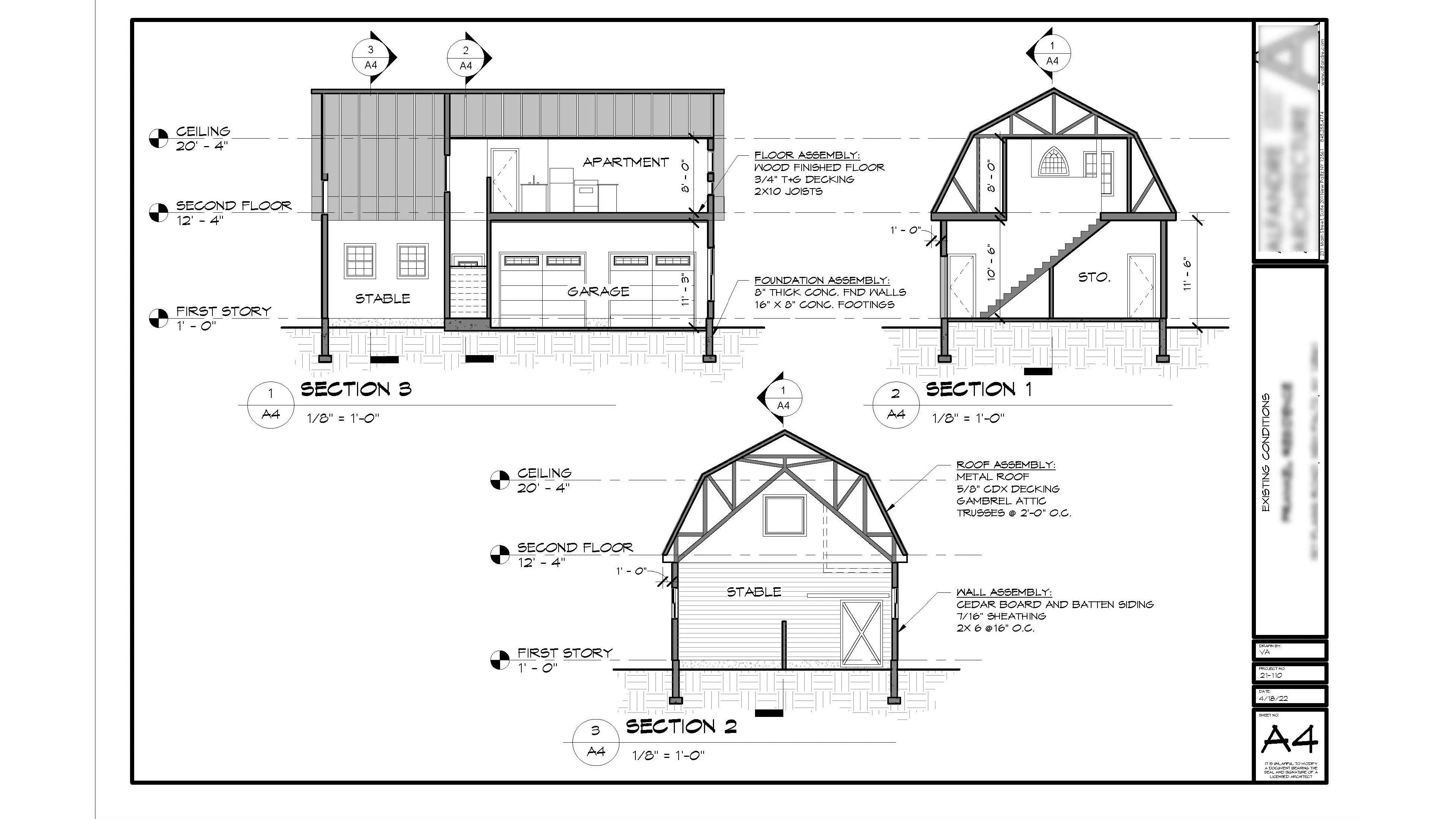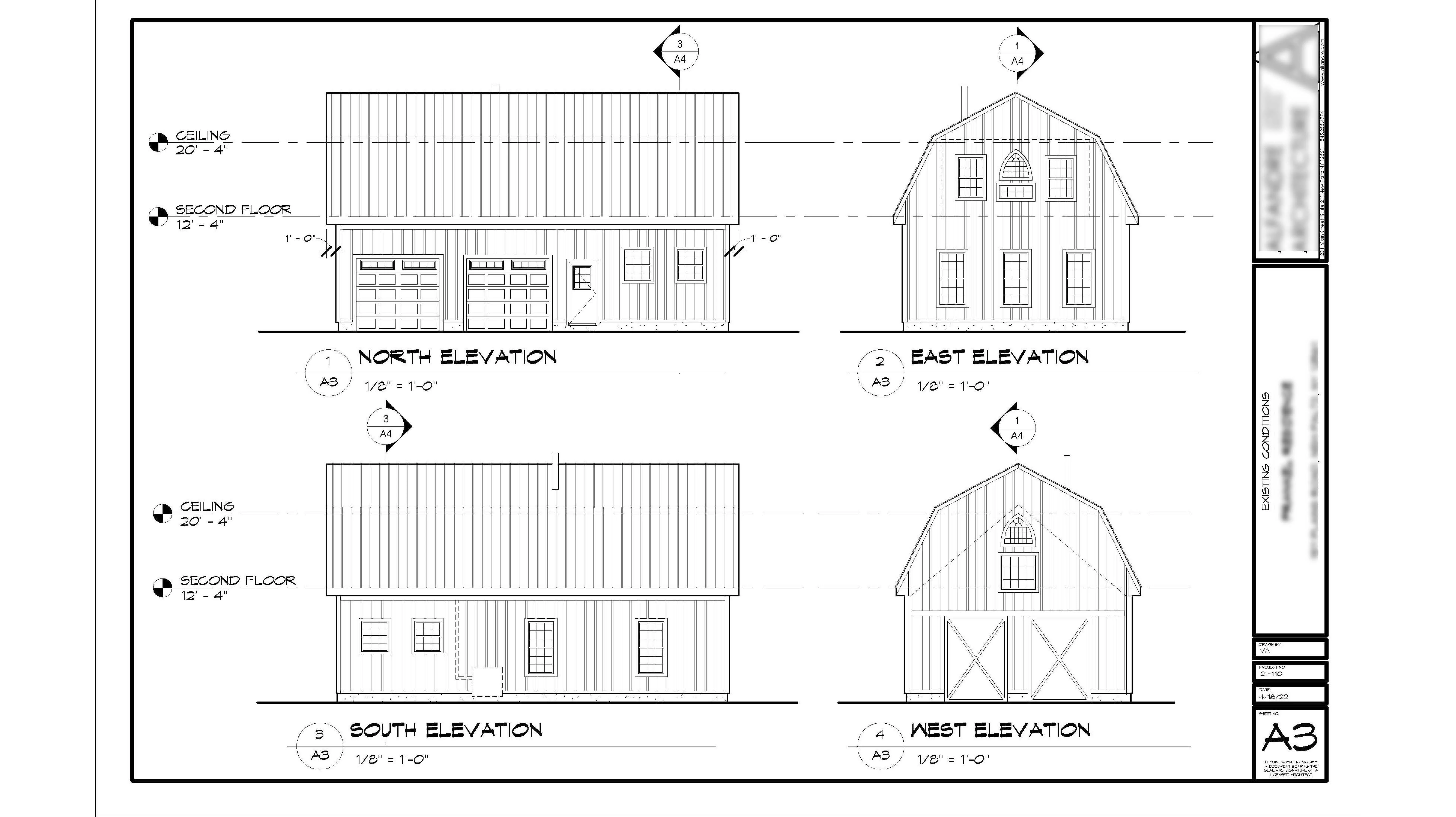 Complete design set: title page w/ rendering, floor plans, elevations, and building sections, all completed using client photos, sketches, and measurements.