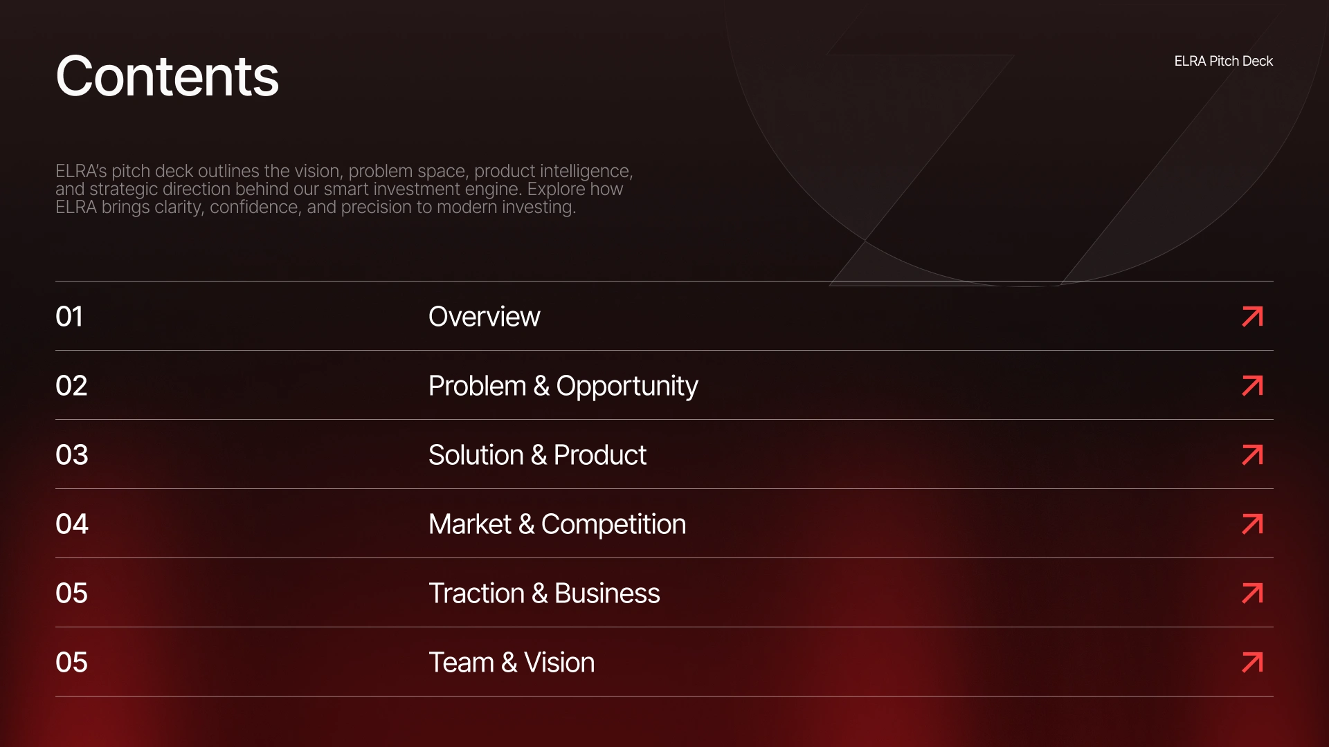 Elra is built for clarity and confidence — a pitch deck that helps smart investments speak louder than buzzwords.