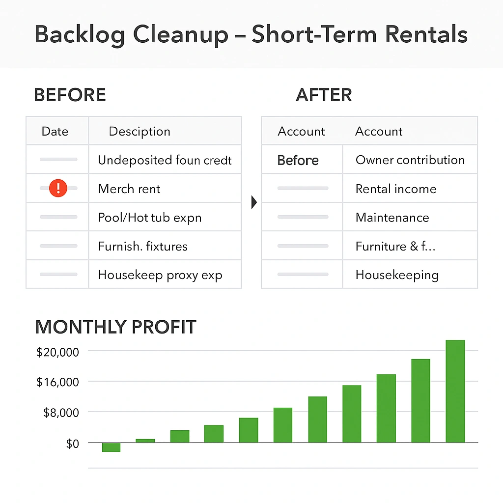 Cleared a year of uncategorized Airbnb transactions, fixed income mapping, and rebuilt P&L. Result: owner saw a $24 K annual profit swing.