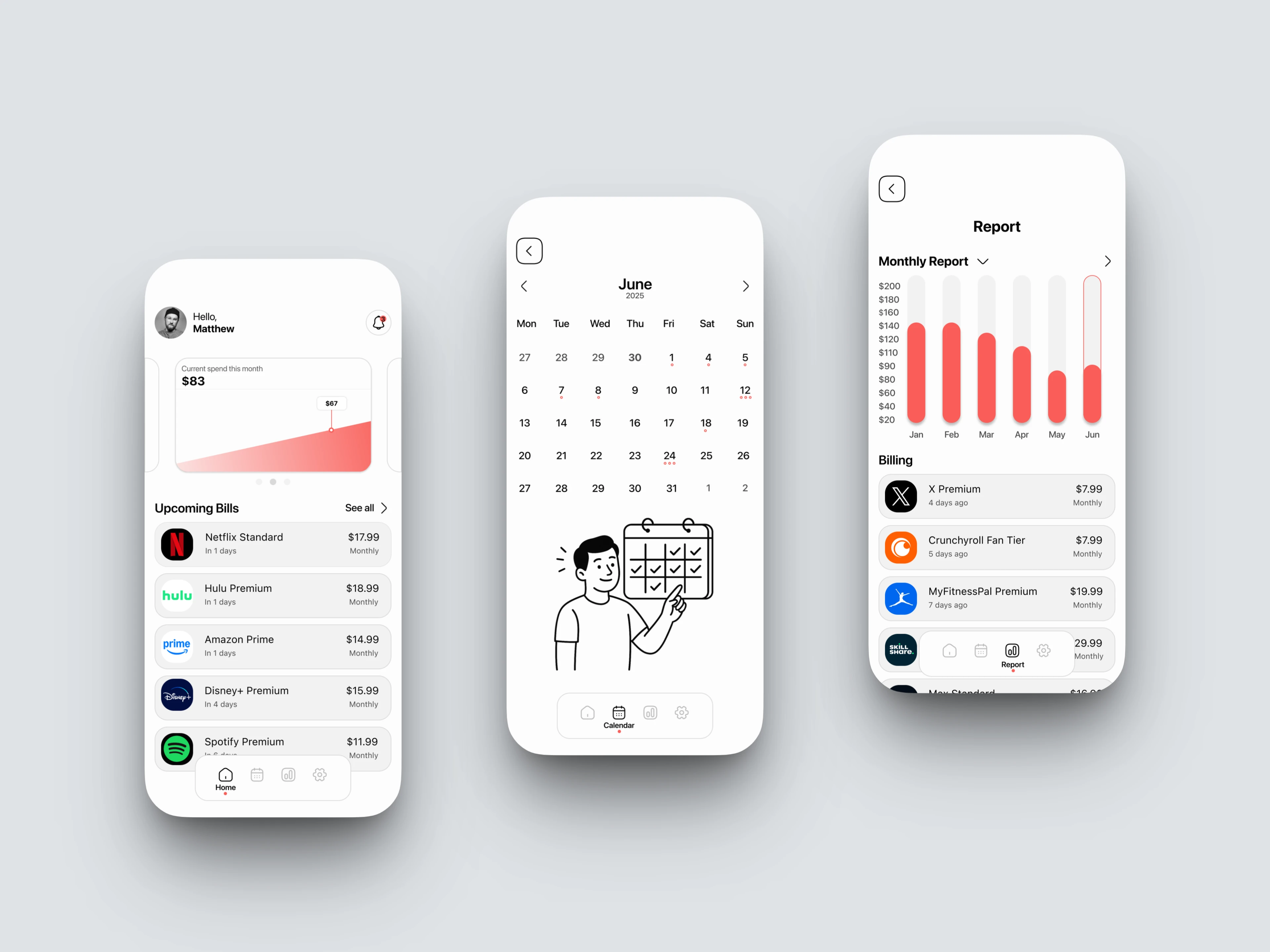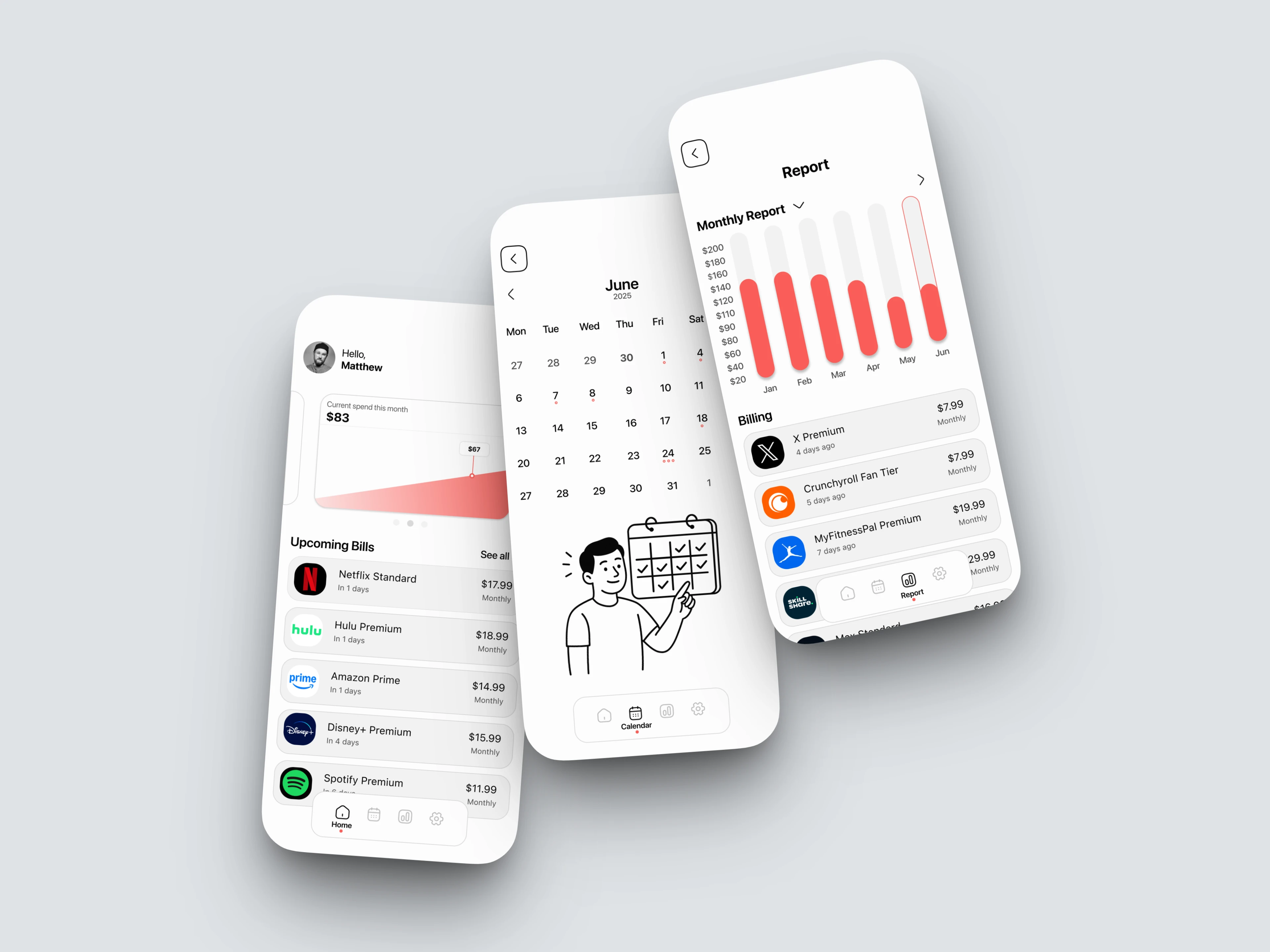 Billie is a sleek, user-first subscription manager designed to help people stay on top of recurring expenses without the stress. Inspired by modern DTC experiences, I focused on making cancellations intuitive, usage insights visual, and renewals less predatory.