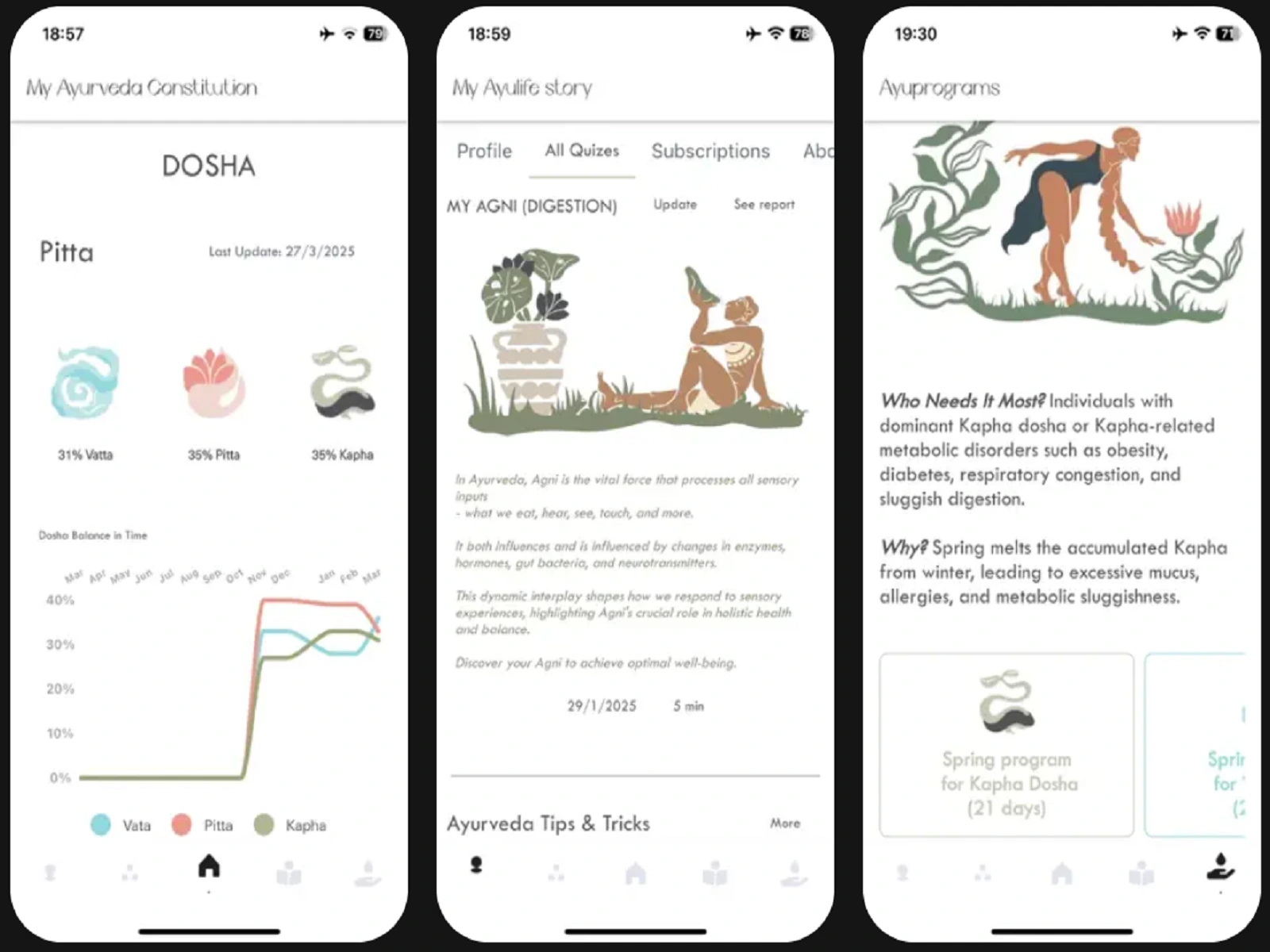 - Understand Your Dosha: Gain insights into your mind-body constitution on physical, mental, and physiological levels. Track how your Dosha shifts over time and why. You may find your dominant Dosha differs in specific areas.