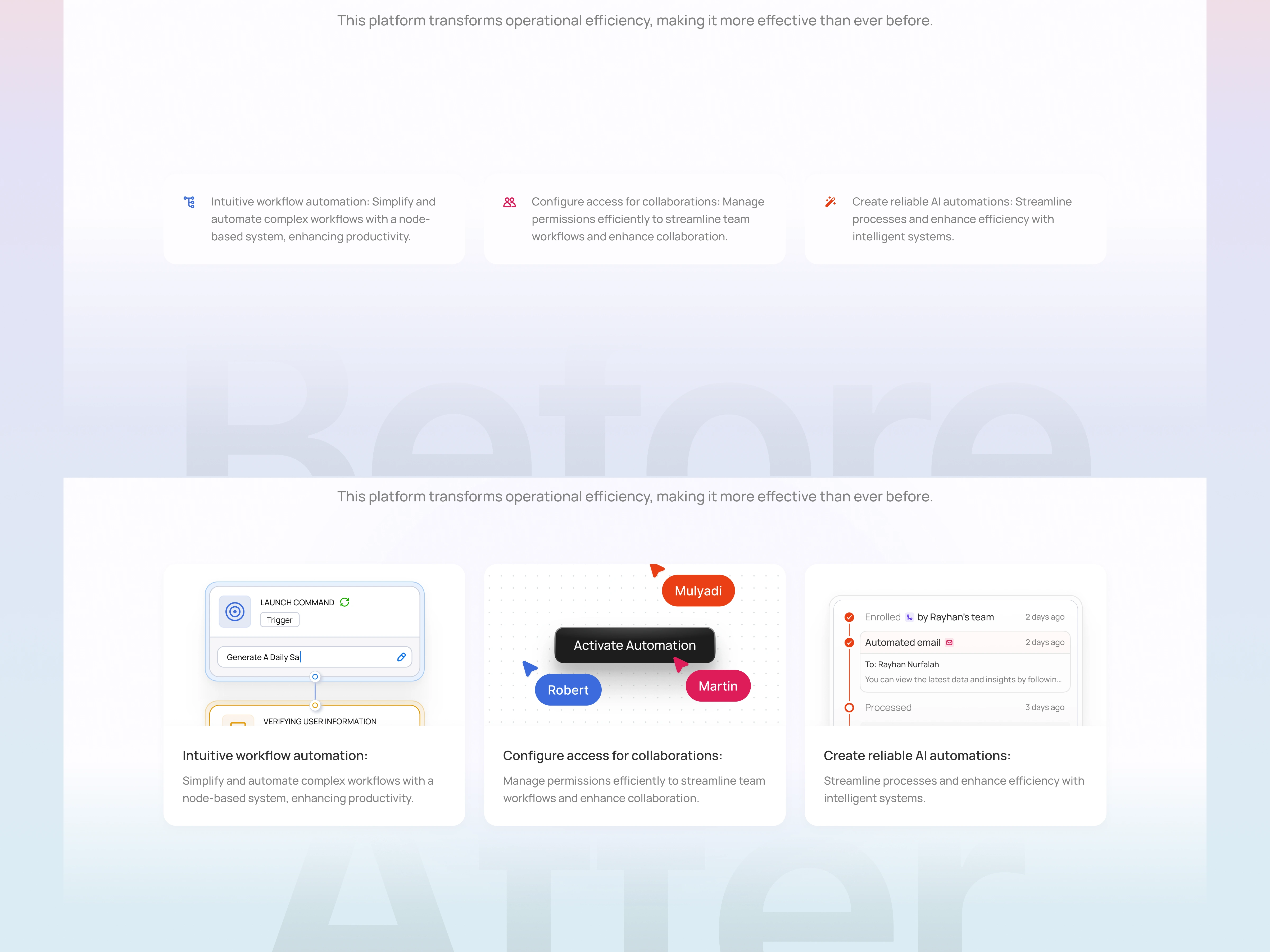 By combining a strong visual hierarchy with storytelling-driven UI previews, the design improves user comprehension and reduces friction during first-touch onboarding. The result is a landing page that feels modern, trustworthy, and aligned with the expectations of teams searching for efficient automation solutions. It provides a clear path from discovery to action—ultimately improving conversion and engagement.