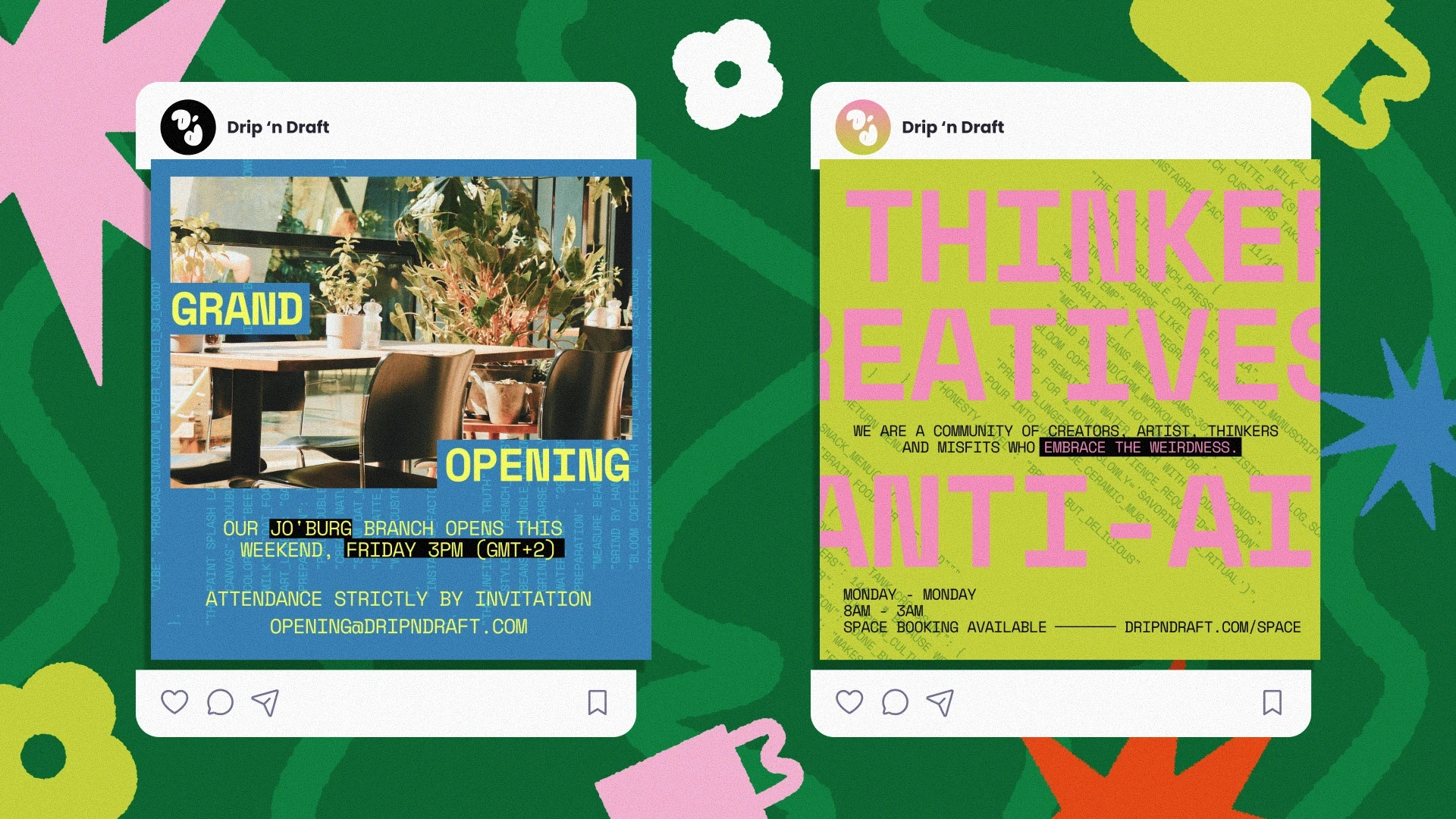 Drip n' Draft is a coffee place and coworking community for creatives, thinkers and artists.