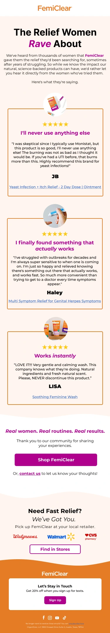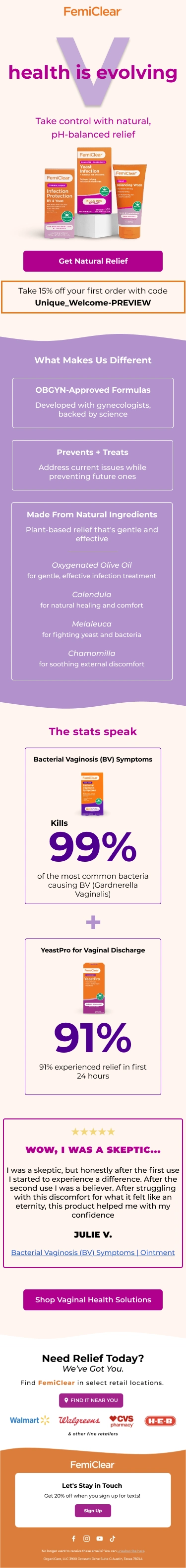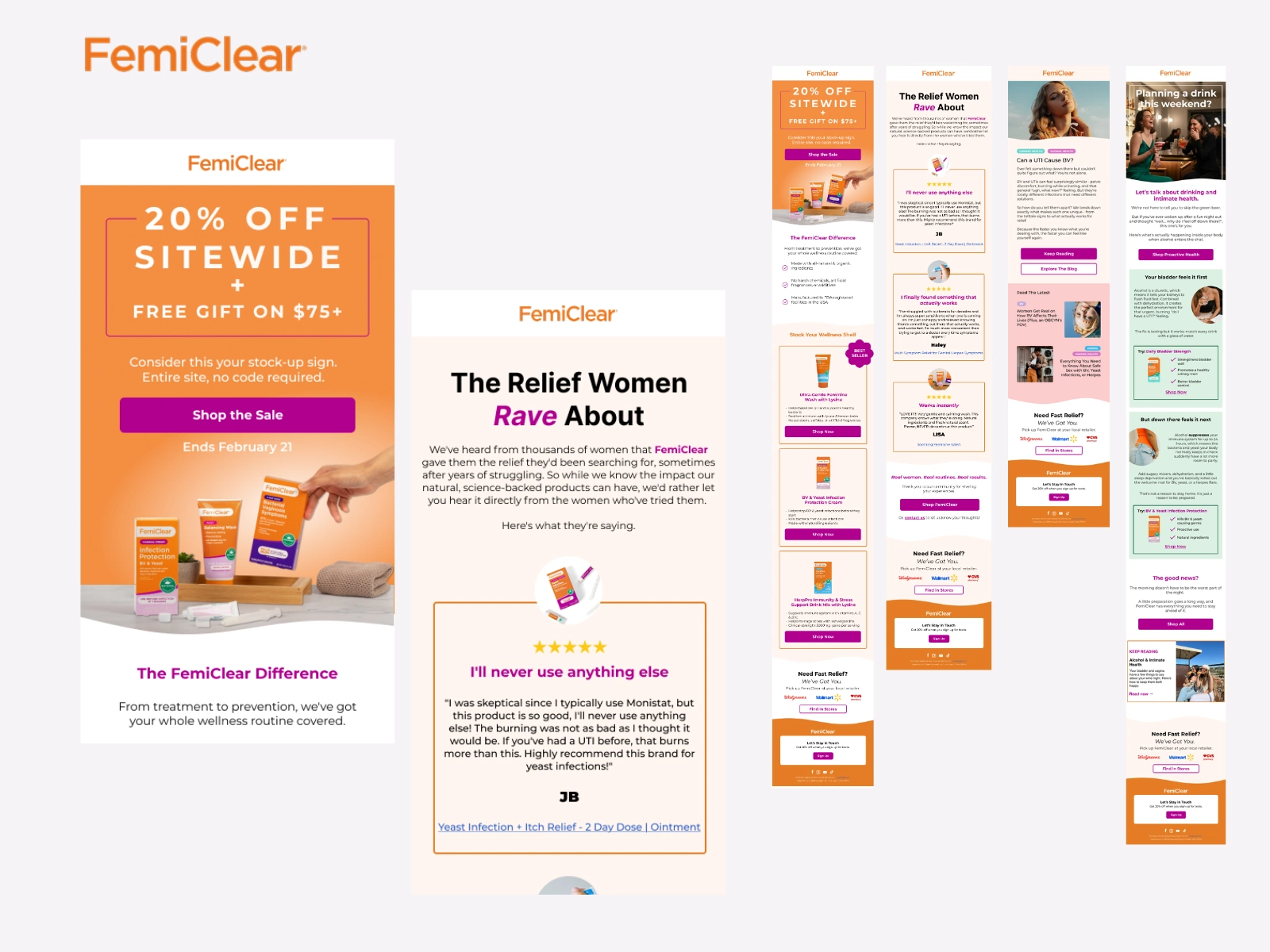 FemiClear is a women's health & wellness brand operating both D2C and through retail partners. Through strategic flows and campaigns, I'm able to help their email program generate 20%+ of their ecommerce revenue and drive higher LTV by gaining customer trust.