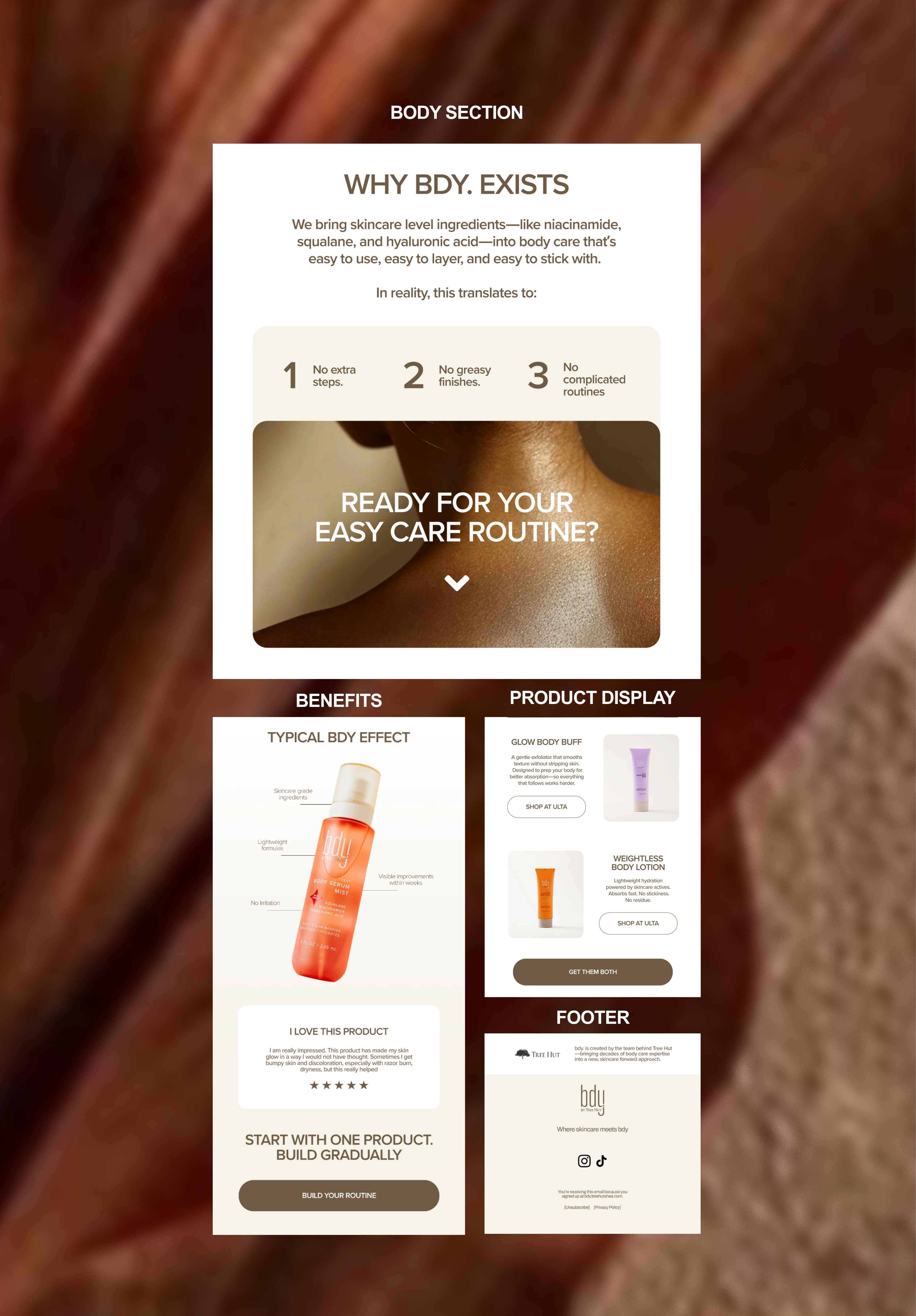 Overview: Designed a conversion-oriented campaign email positioning BDY by Tree Hut as skincare-level body care. The goal was to strengthen brand differentiation, highlight hero products, and drive retail action without overwhelming the subscriber.