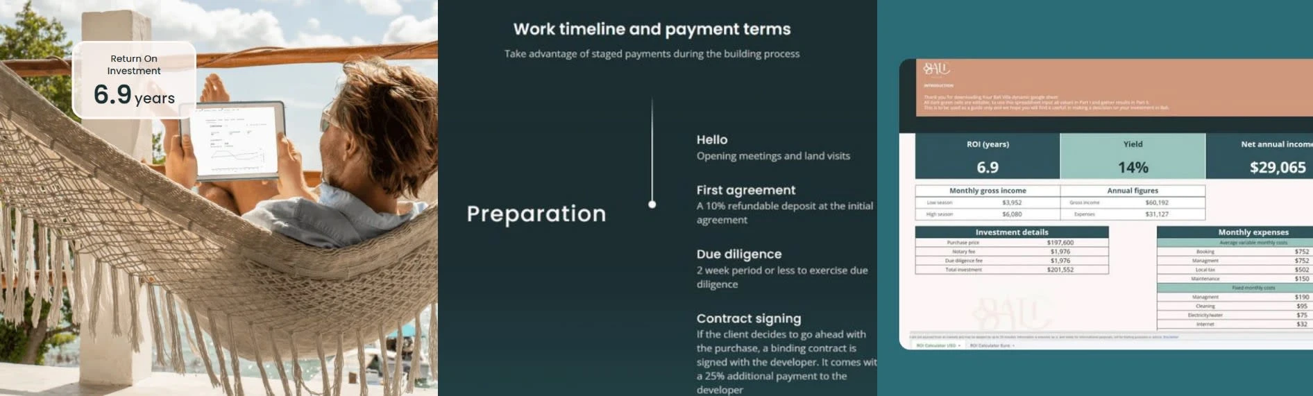 On their website, we took potential buyers on a journey—from dreaming about Bali living to crunching numbers on ROI using our interactive downloadable calculator and navigating local red tape with clear payment plans. These tools made decision-making a breeze while highlighting Uluwatu's strategic growth since the 1920s, showing why it's the prime investment spot in Bali.