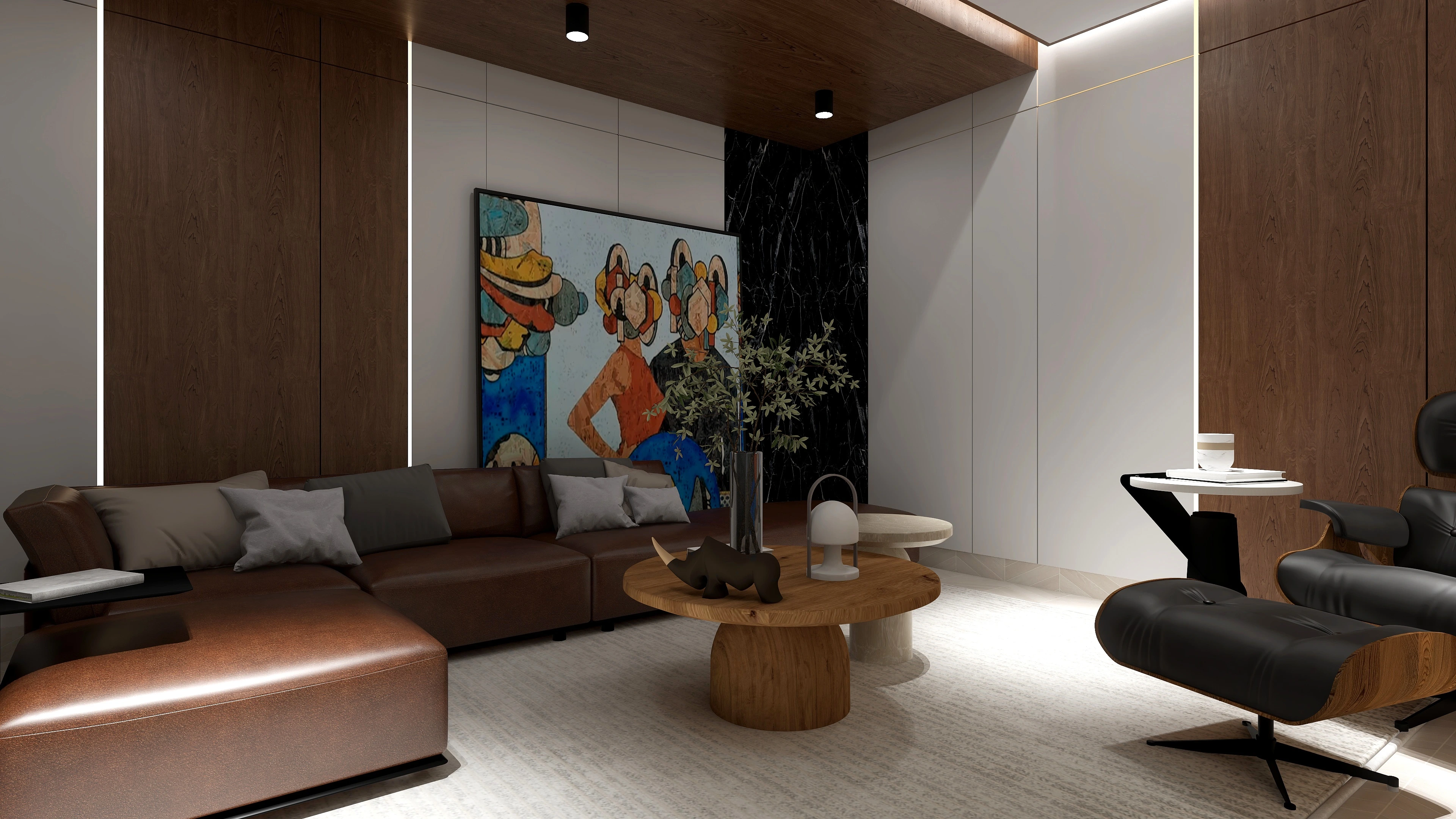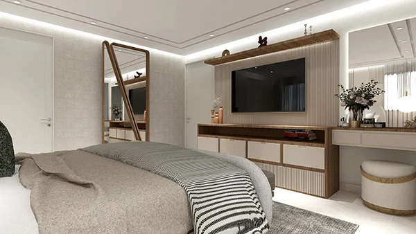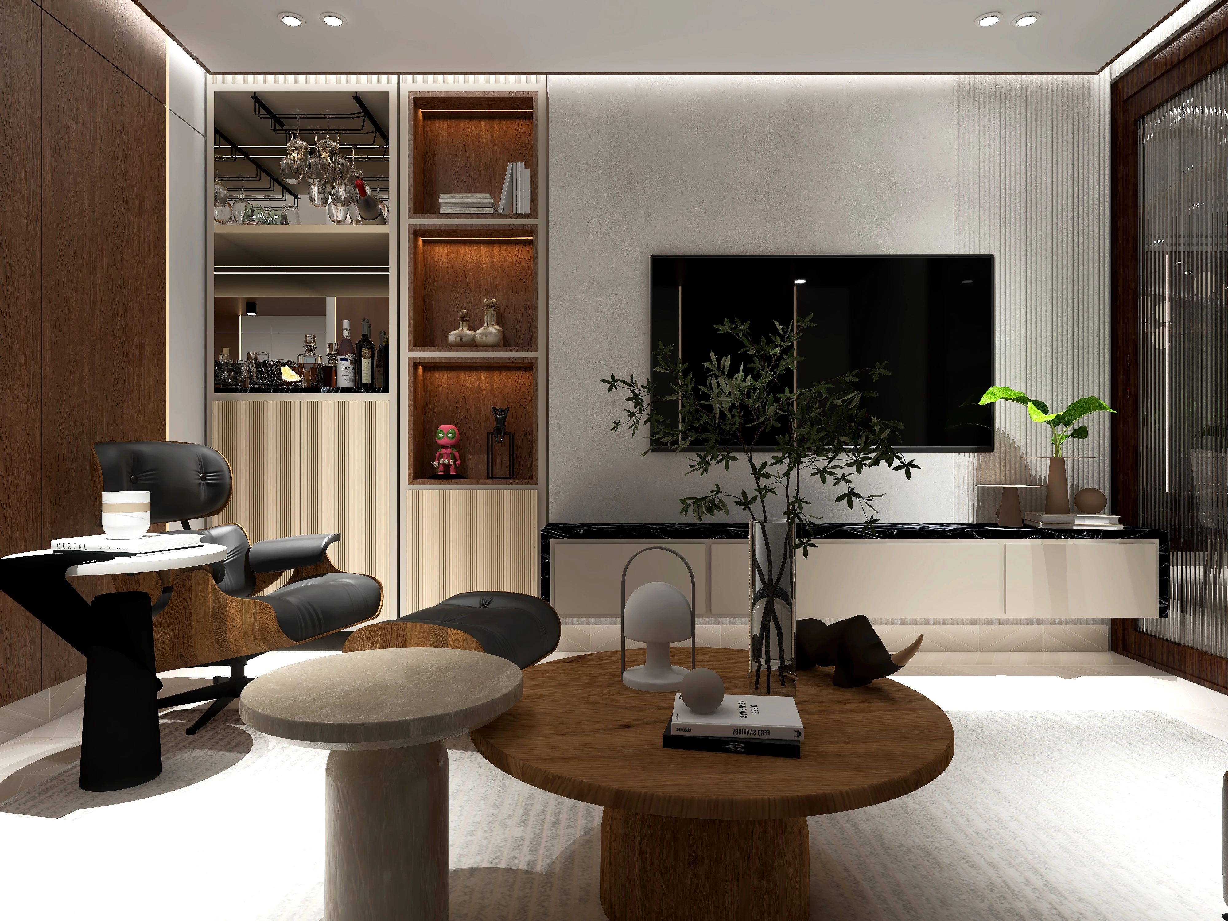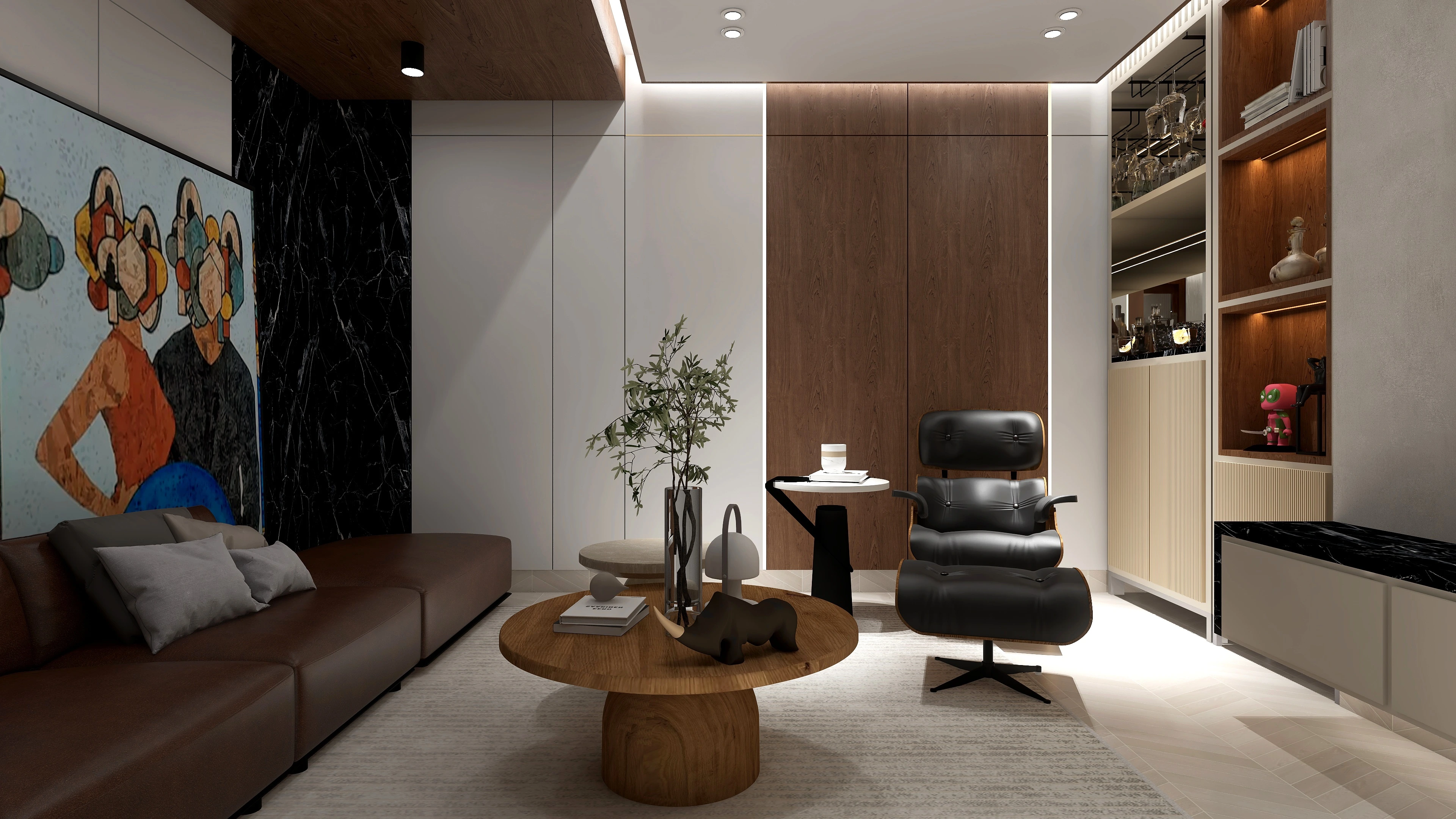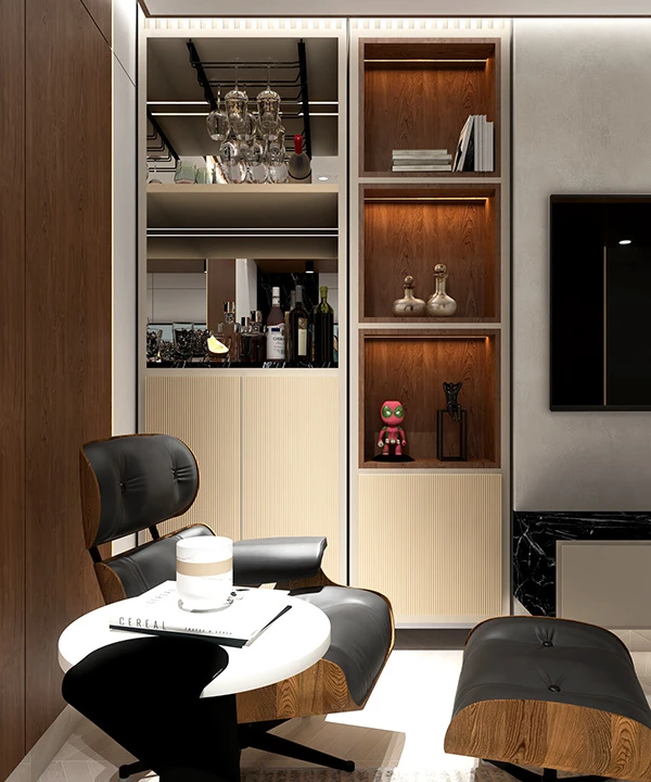 En este apartamento que se trabajó en varias áreas especificas, se queria recrear un espacio limpio y adaptado para un joven. El uso de materiales como madera, vidrio y mármol son muy resltadas y el uso de tonos prolijos y oscuros también. Las demás areas del video fueron trabajadas con la colaboración de otras diseñadoras.
