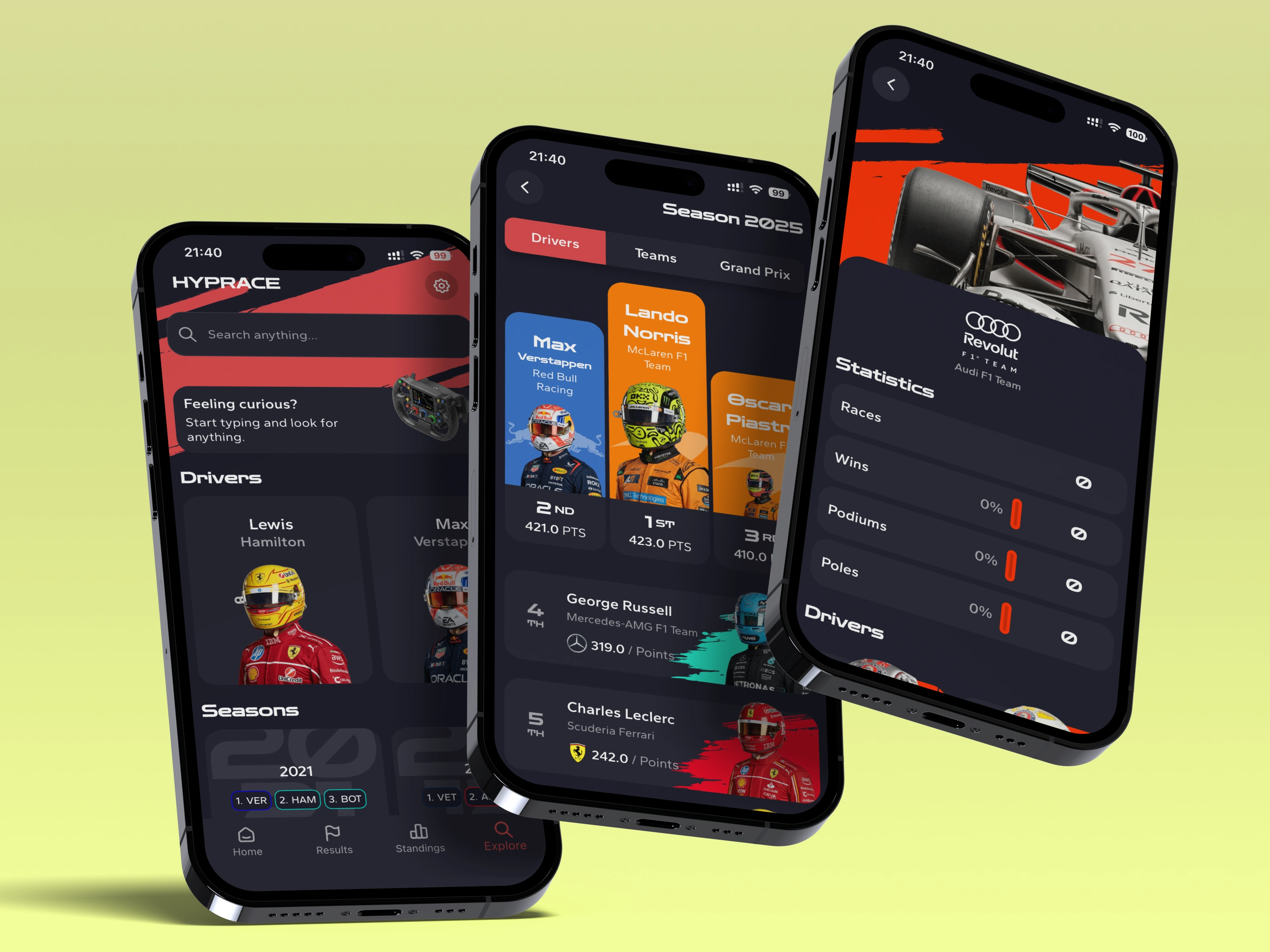 Using FlutterFlow, I constructed reusable UI components, cards for driver profiles, tab bars for navigating between drivers, teams, and Grand Prix events with animated tracks. These components were assembled into a fluid, intuitive flow that lets users move from a driver’s career overview to a specific race result with a