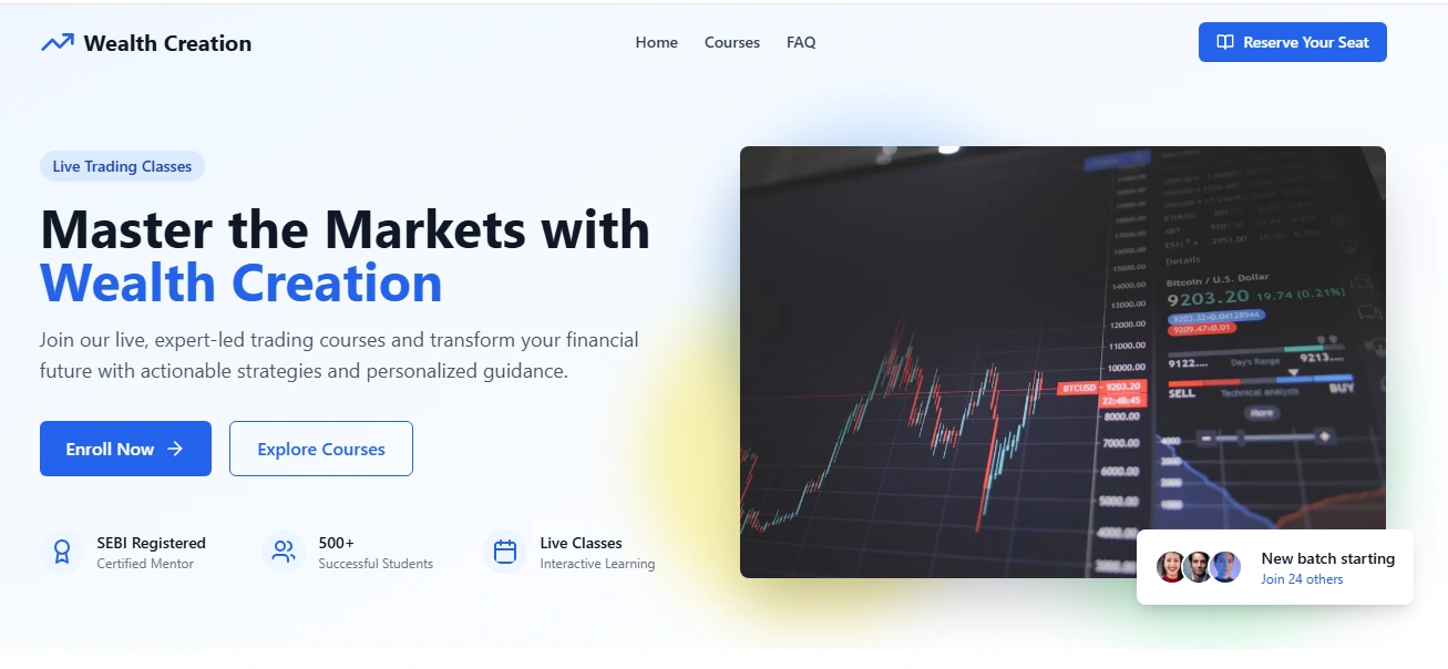 Modern, conversion-focused landing page for a trading coaching platform. Clean, trust-building design highlighting courses, strategies & mentorship.