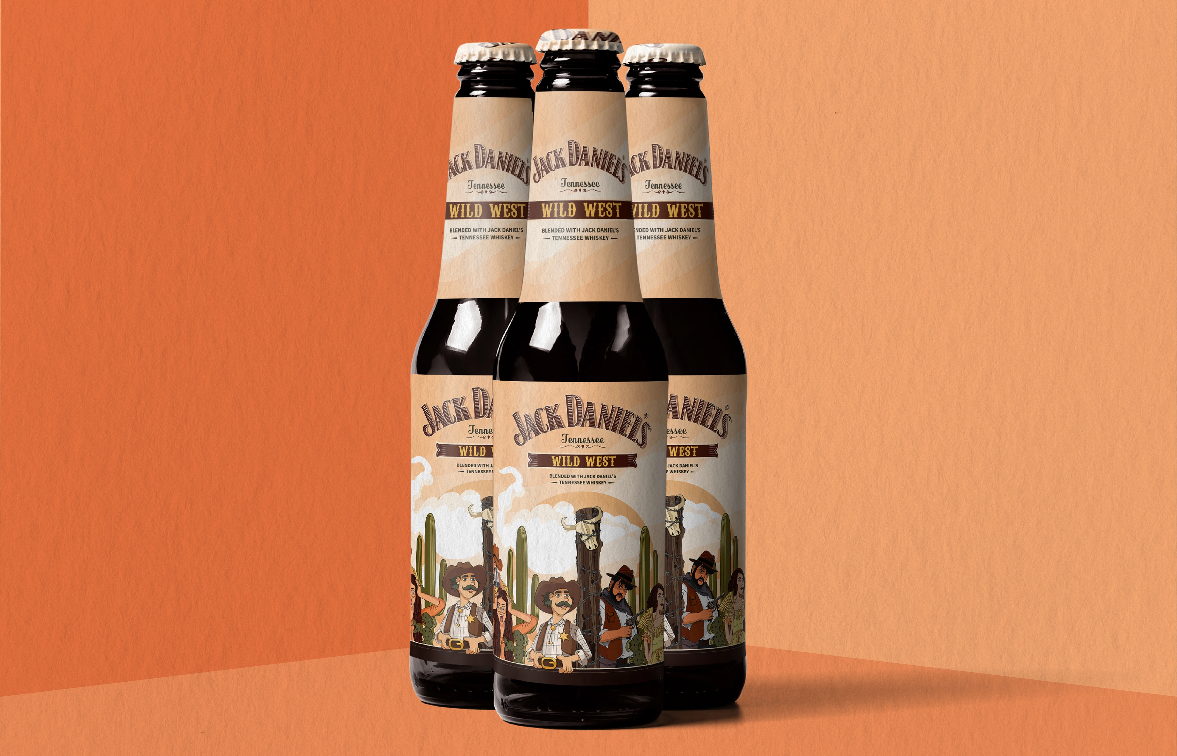 Imagine a Wild West showdown: a cop and a thug face off, surrounded by gritty scenery. To the right, a woman smokes while musicians strum and sing. On the left, a bounty hunter aims at a screaming girl, and another musician smokes a pipe. When the label wraps around, the musicians meet, completing the scene. Big clouds and wavy patterns tie it all together in a dusty, adventurous vibe.