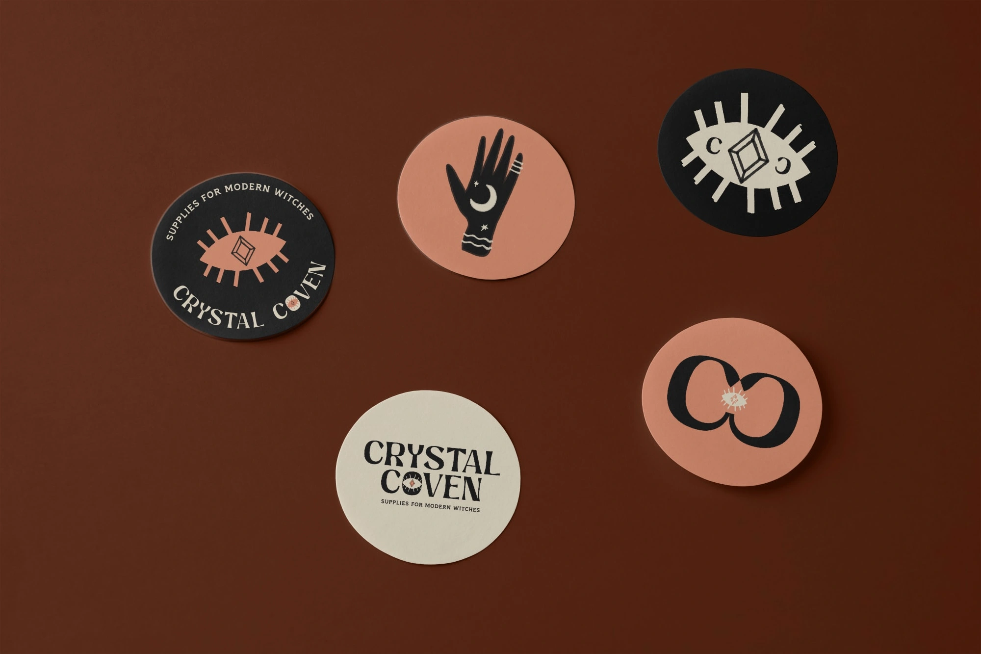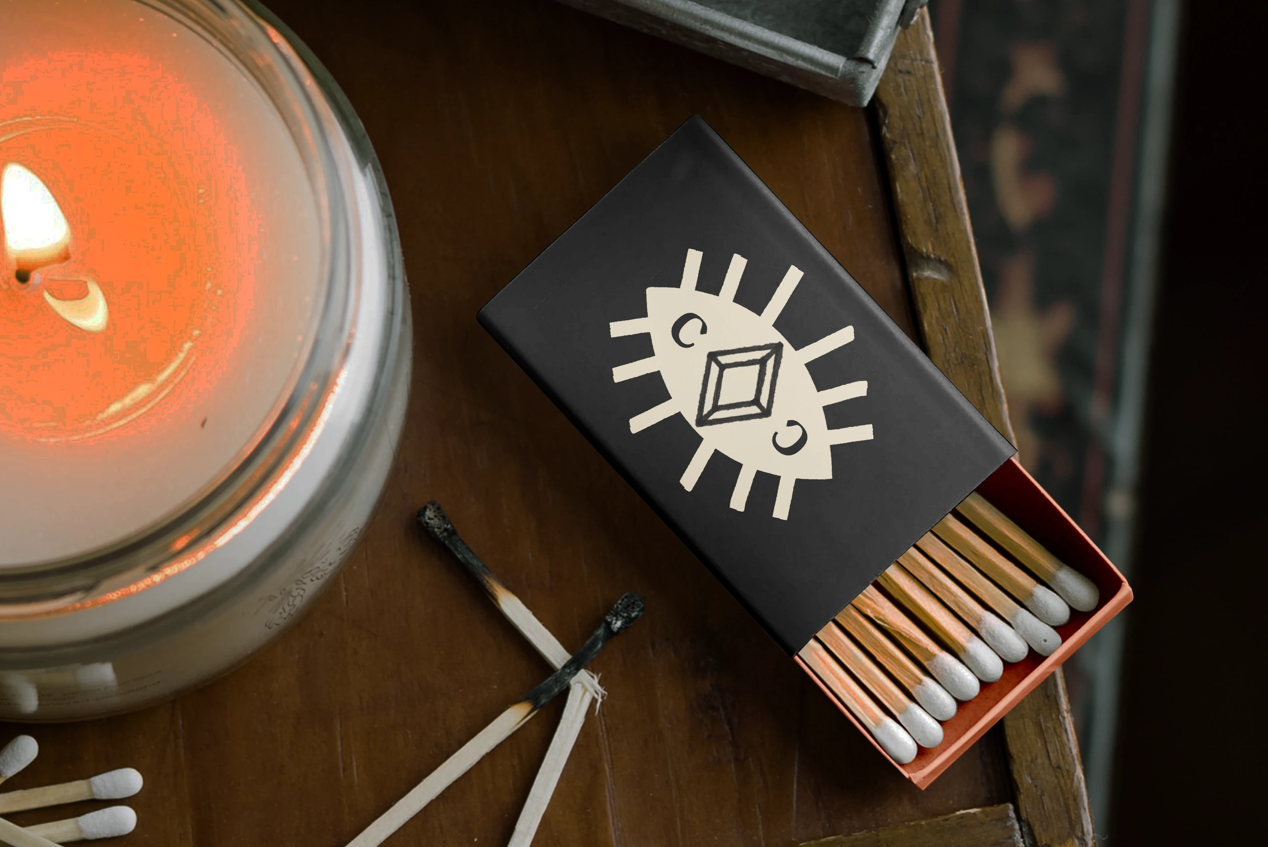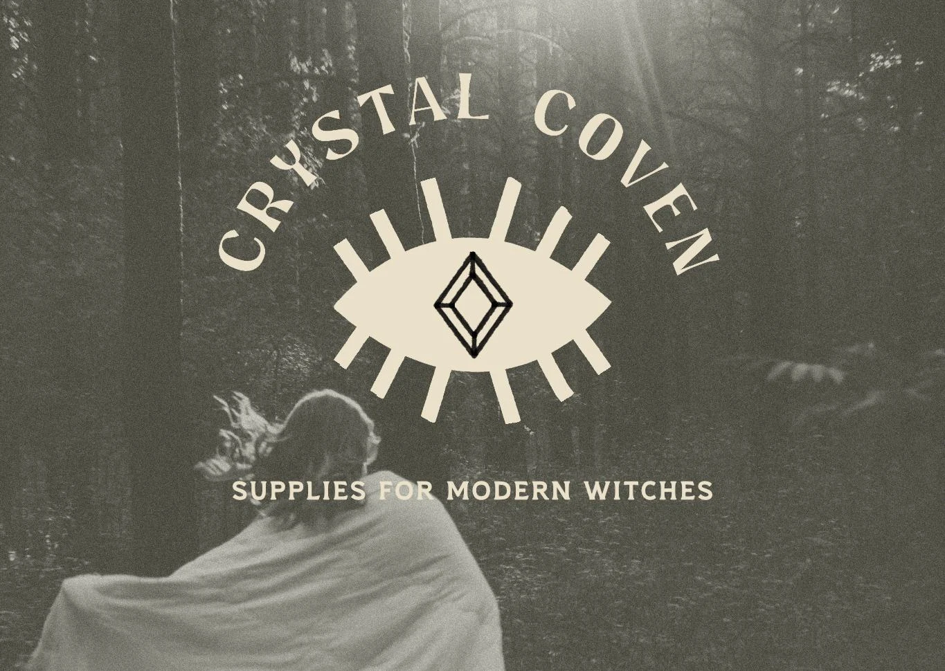 The main logo is based on vintage book covers, evoking the idea of a grimoire or spellbook. The eye is based on the evil eye talisman made to protect the wearer against any evil directed at them.