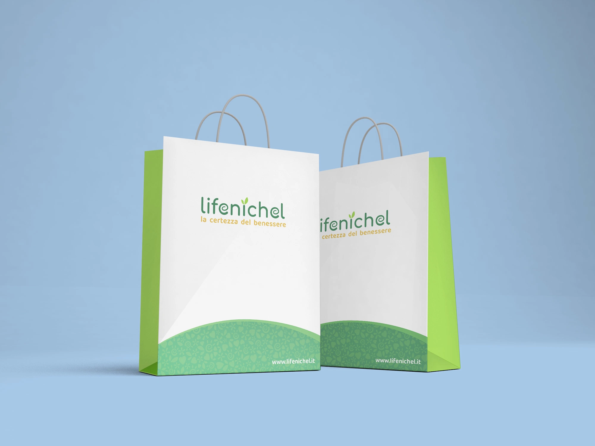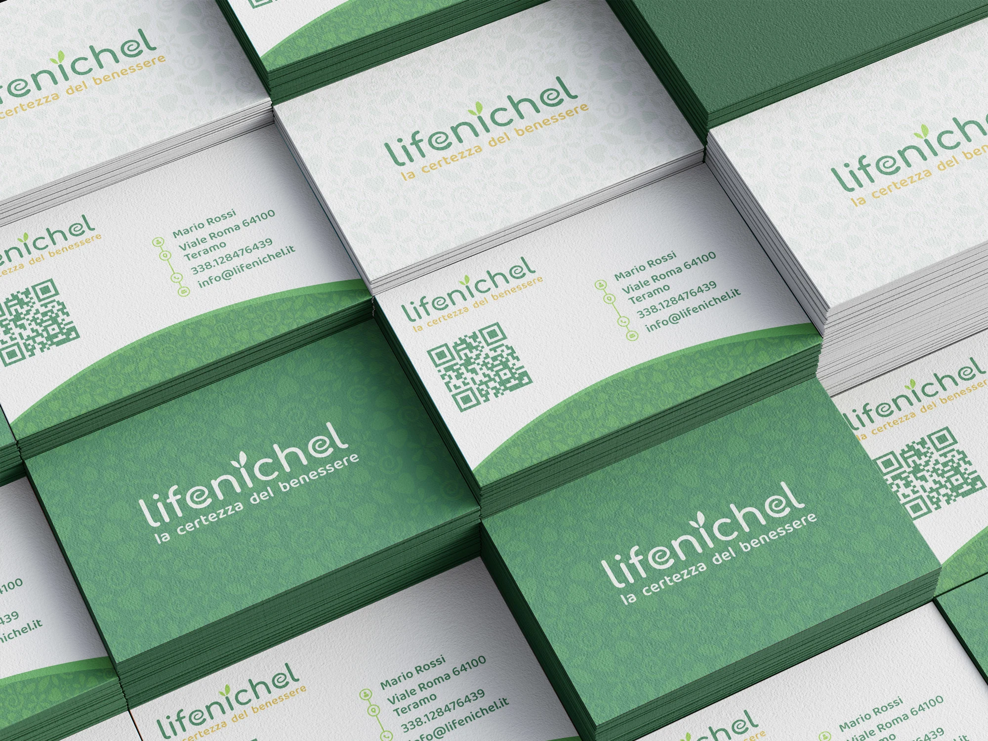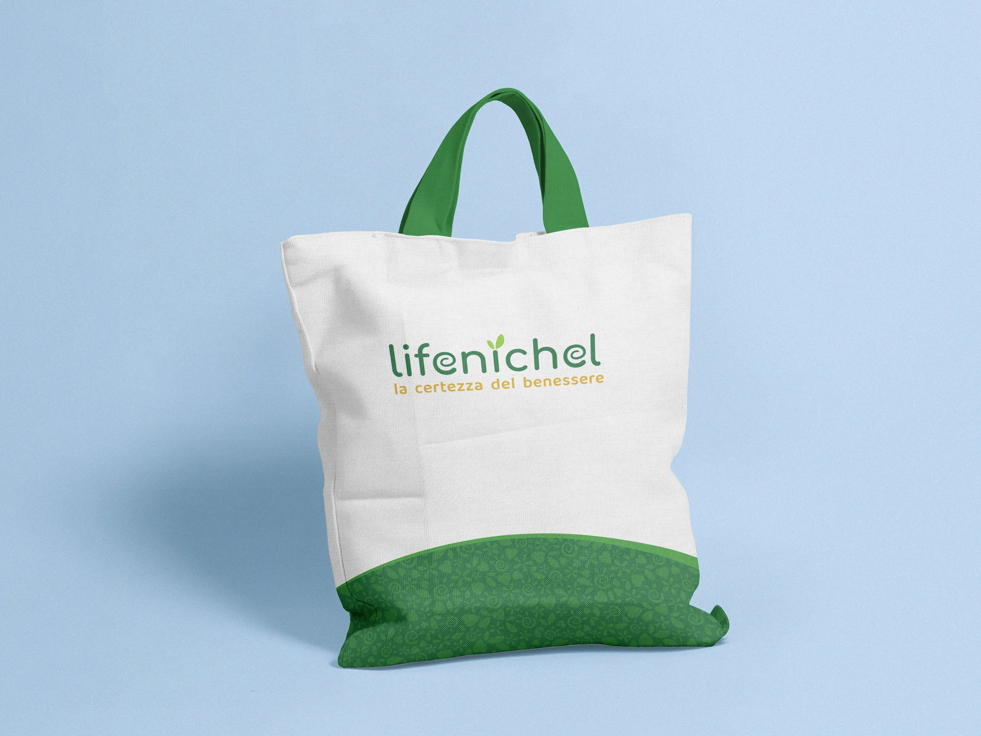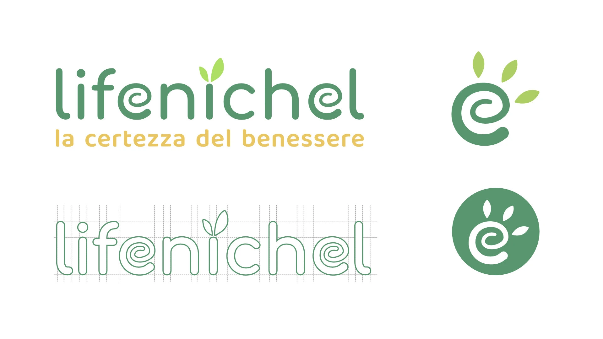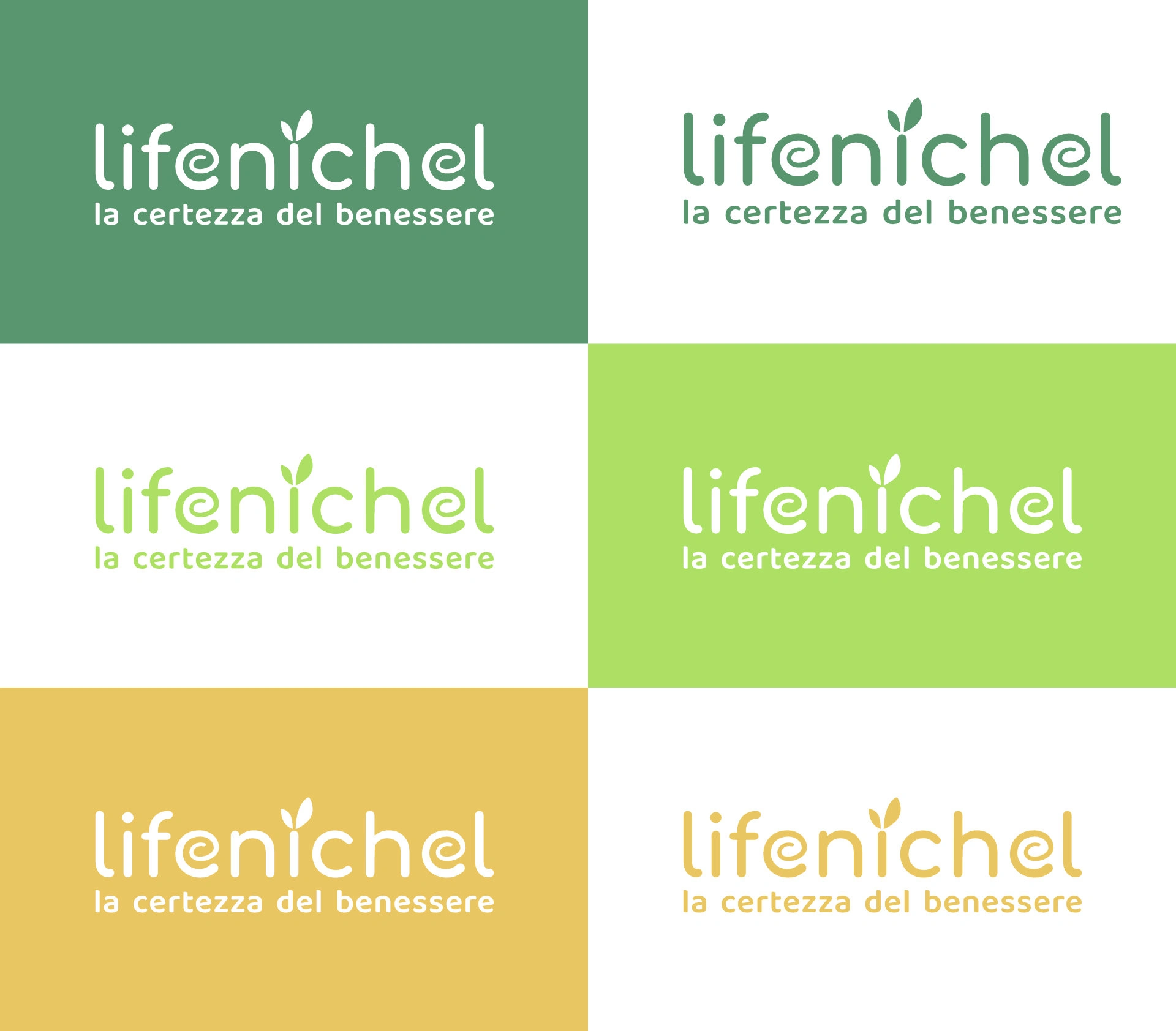 The Lifenichel logo is composed of rounded fonts, which conveys a sense of friendship and genuineness. The color green, in two different shades, recalls nature and well-being. The darker green matches the brownish payoff, which symbolizes earth and solidity.