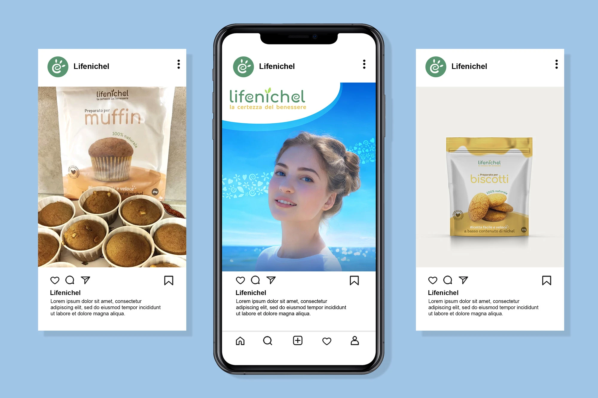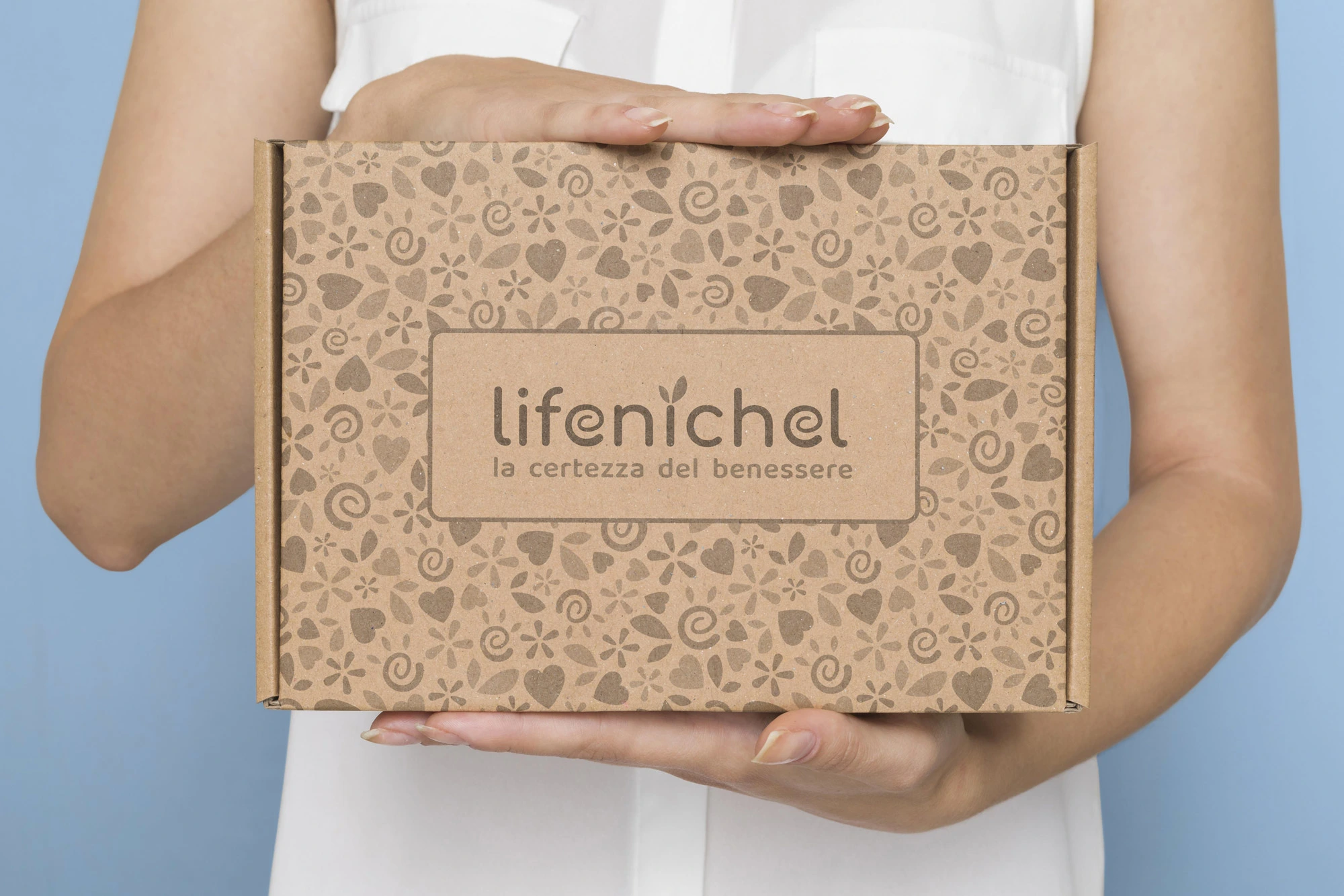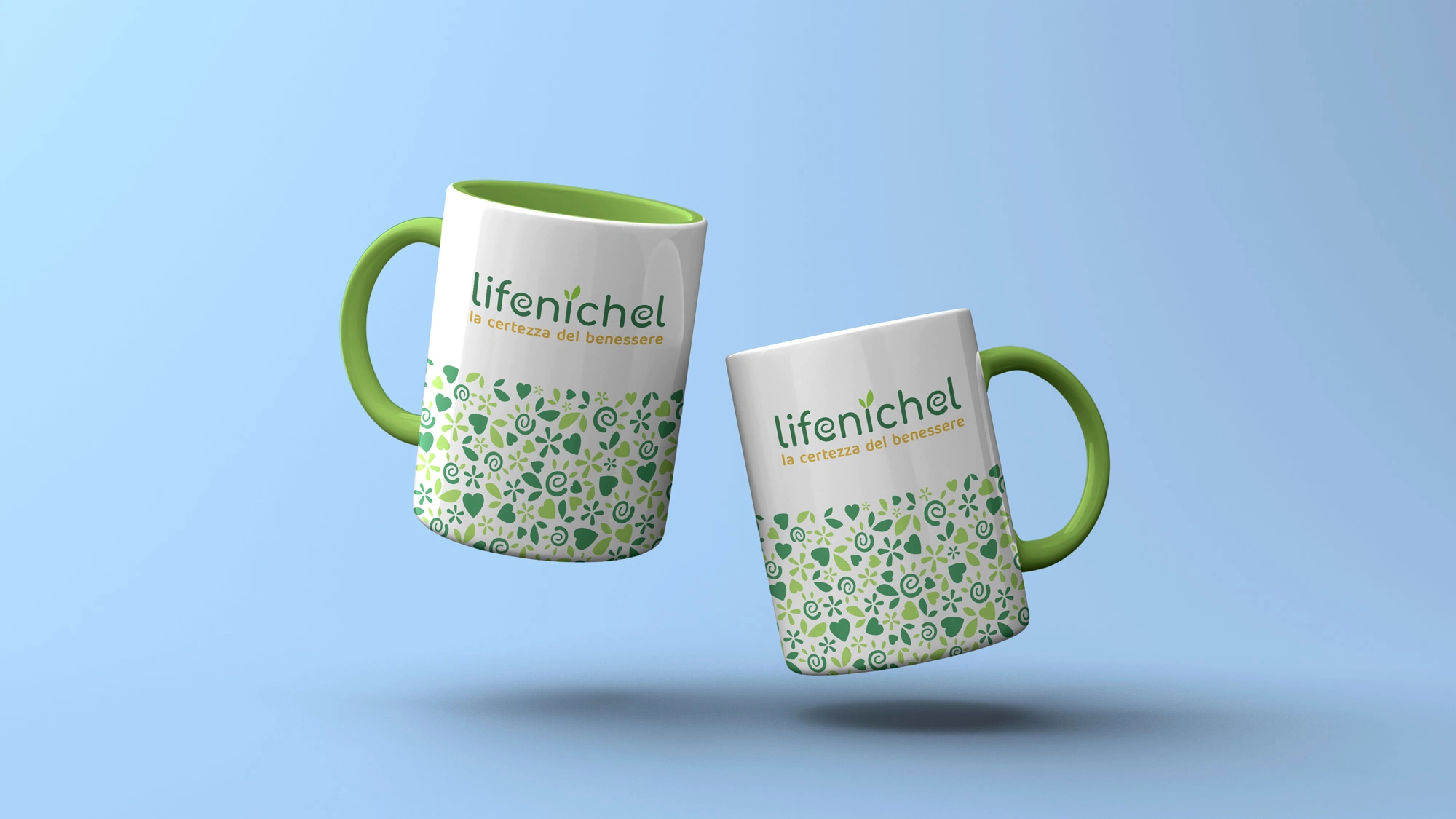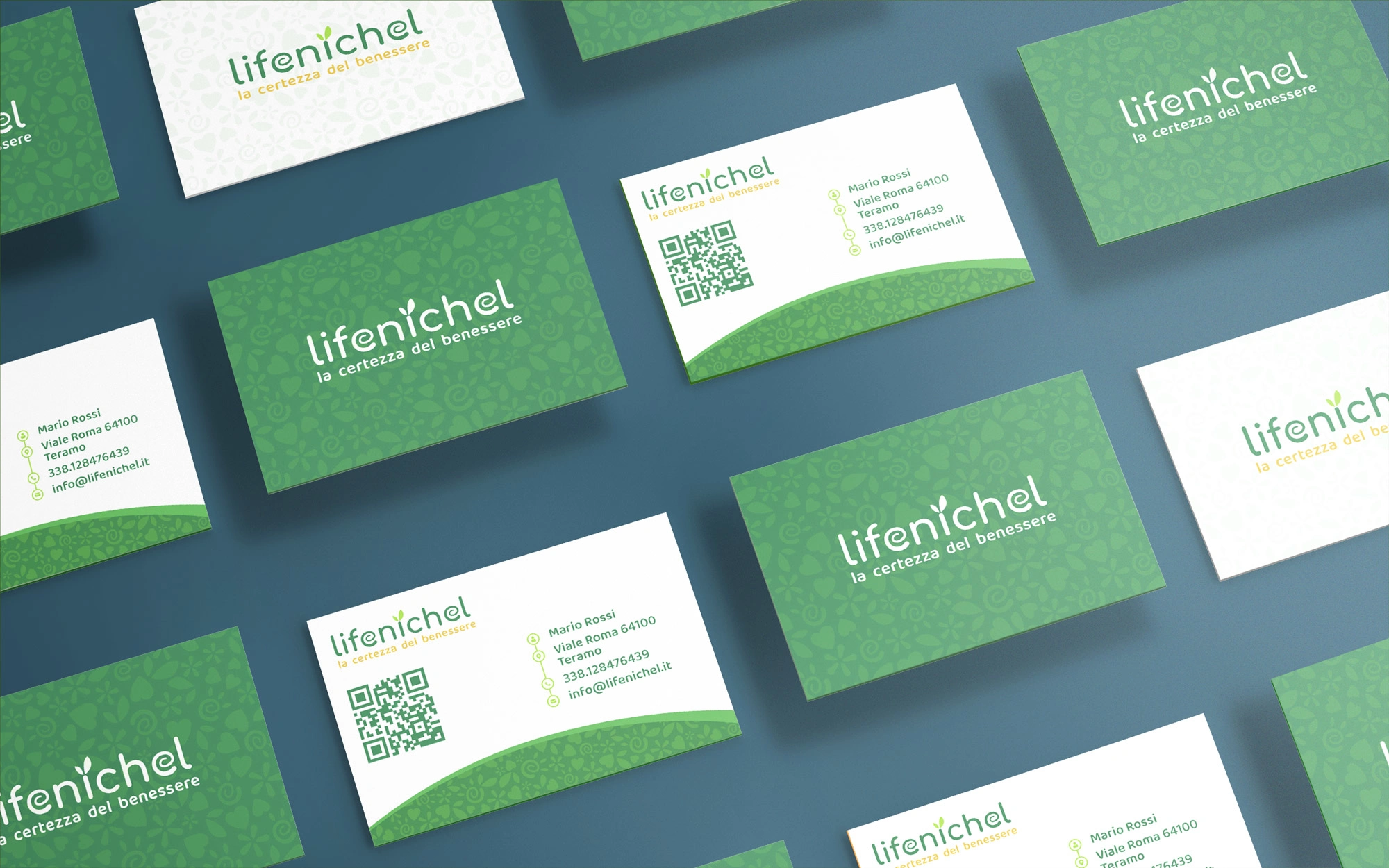The Lifenichel logo is composed of rounded fonts, which conveys a sense of friendship and genuineness. The color green, in two different shades, recalls nature and well-being. The darker green matches the brownish payoff, which symbolizes earth and solidity.
