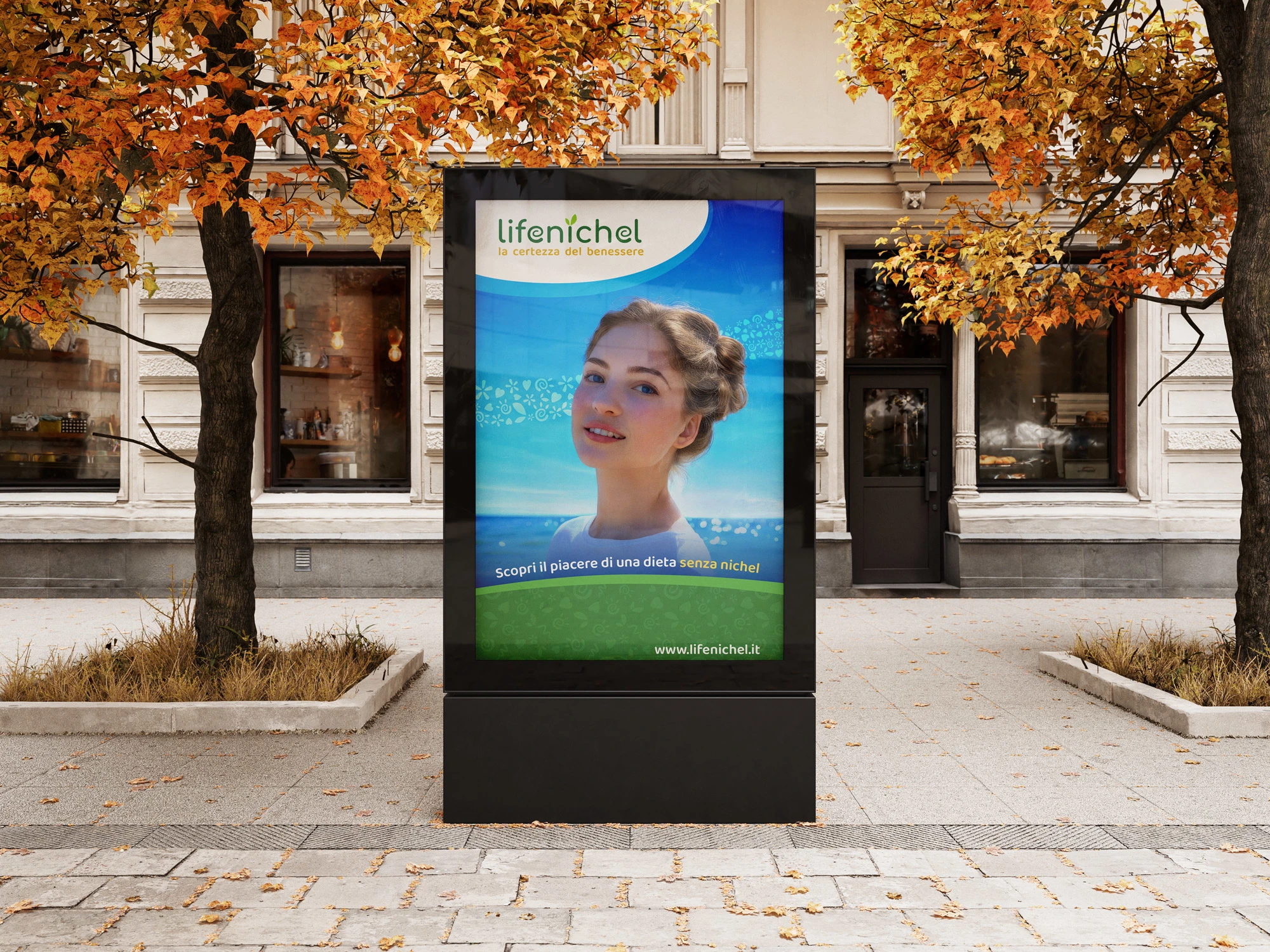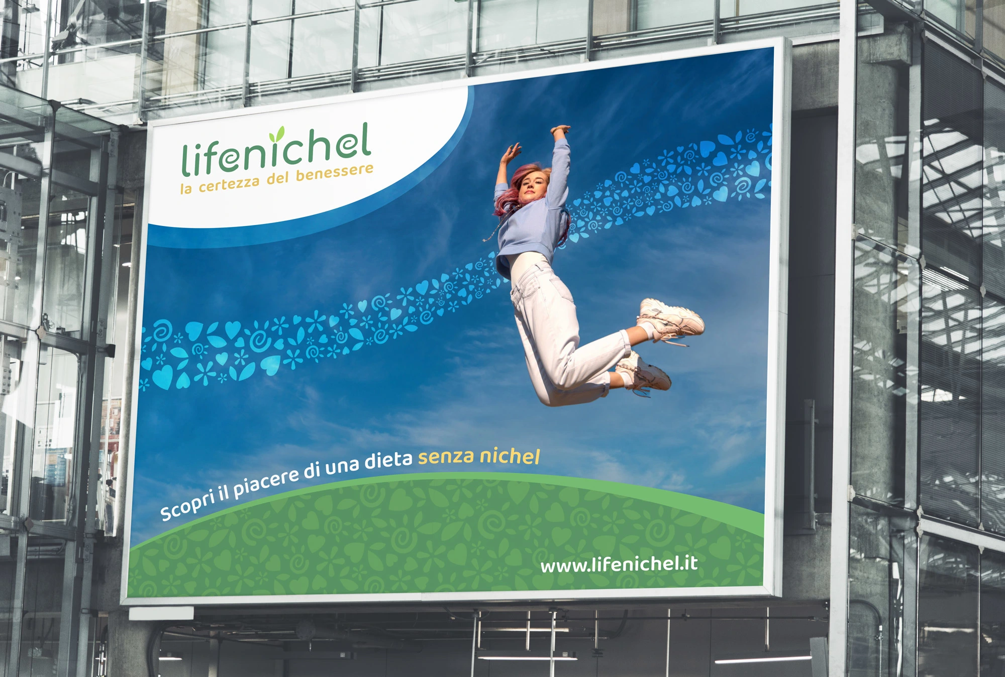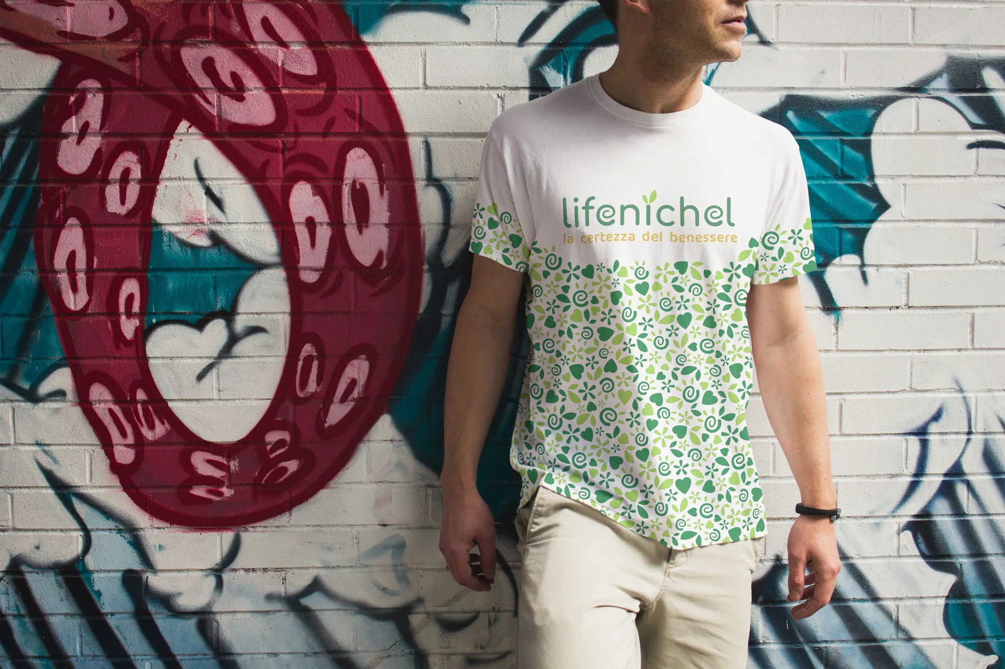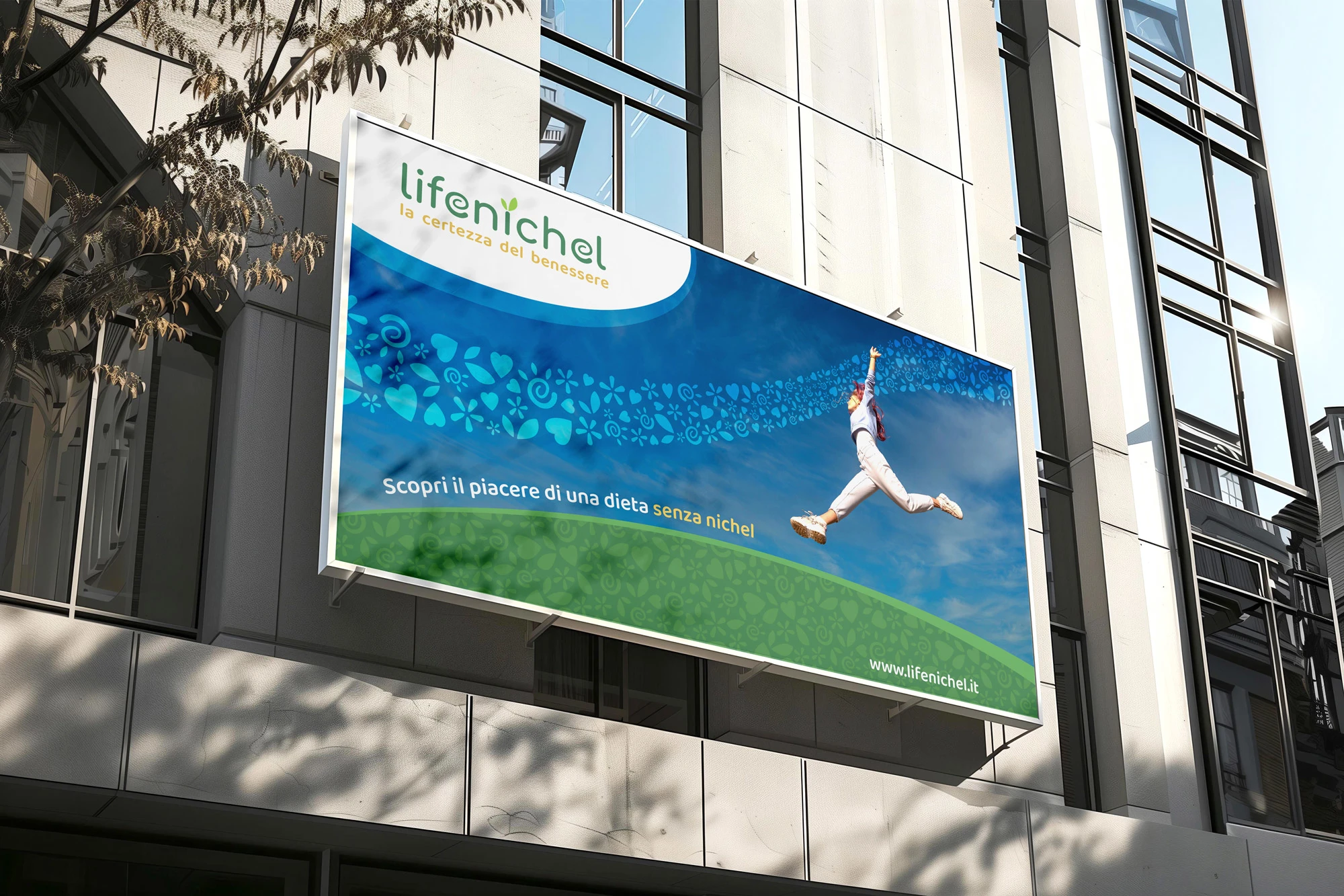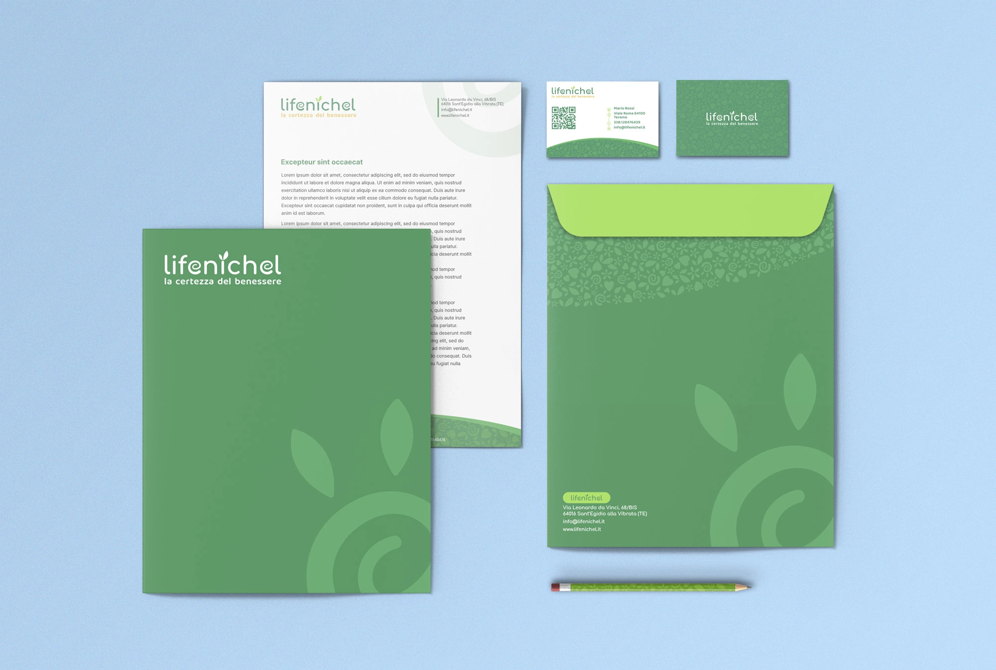 The Lifenichel logo is composed of rounded fonts, which conveys a sense of friendship and genuineness. The color green, in two different shades, recalls nature and well-being. The darker green matches the brownish payoff, which symbolizes earth and solidity.