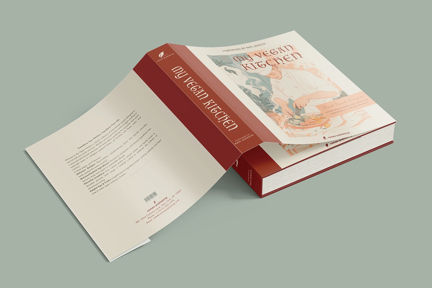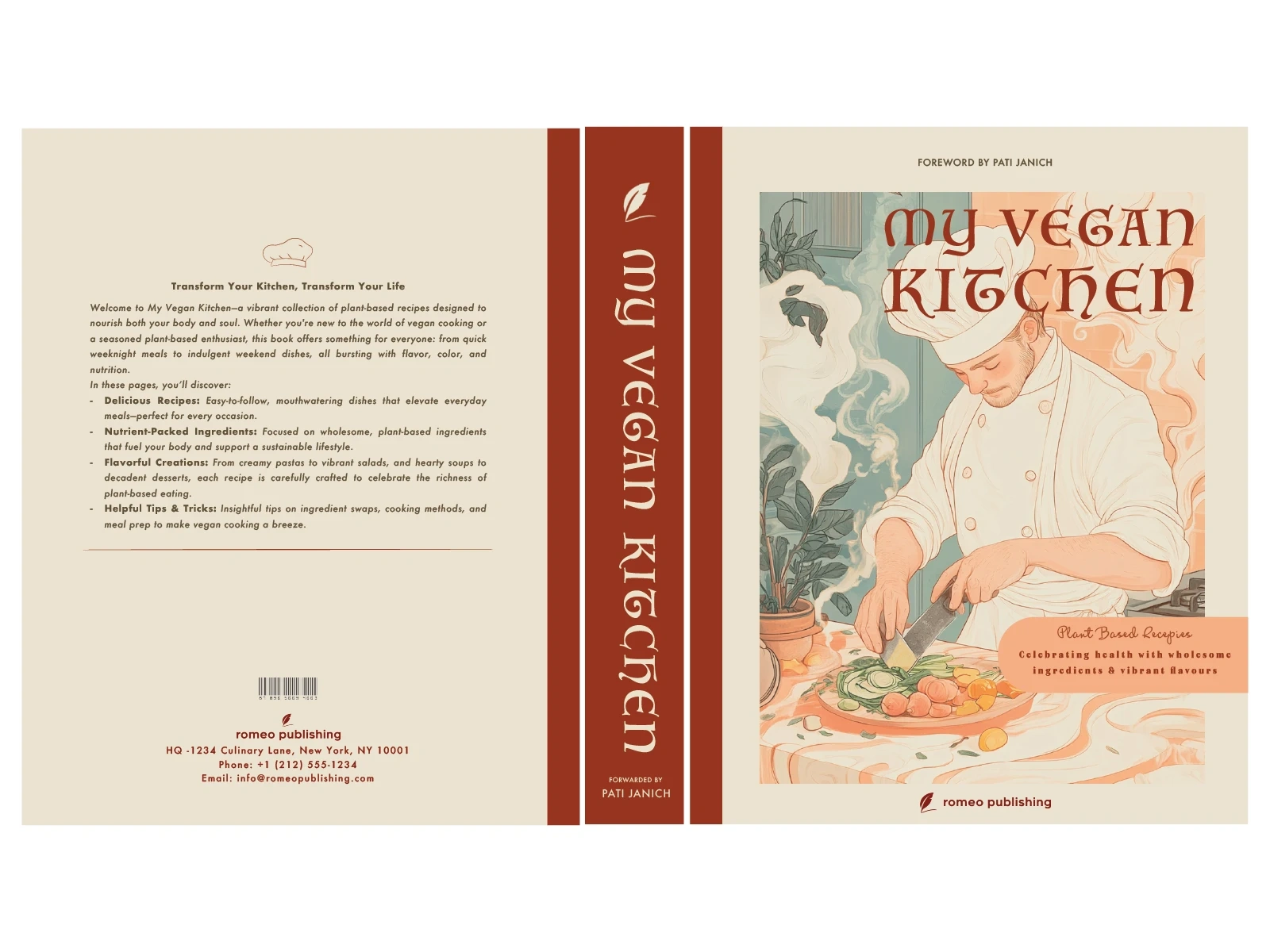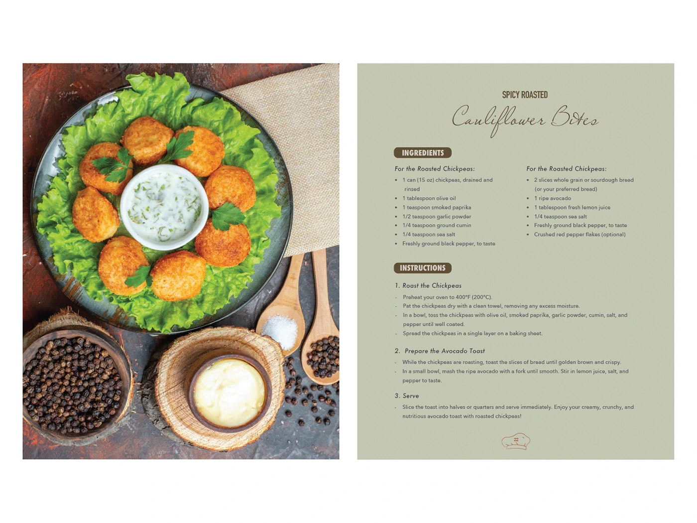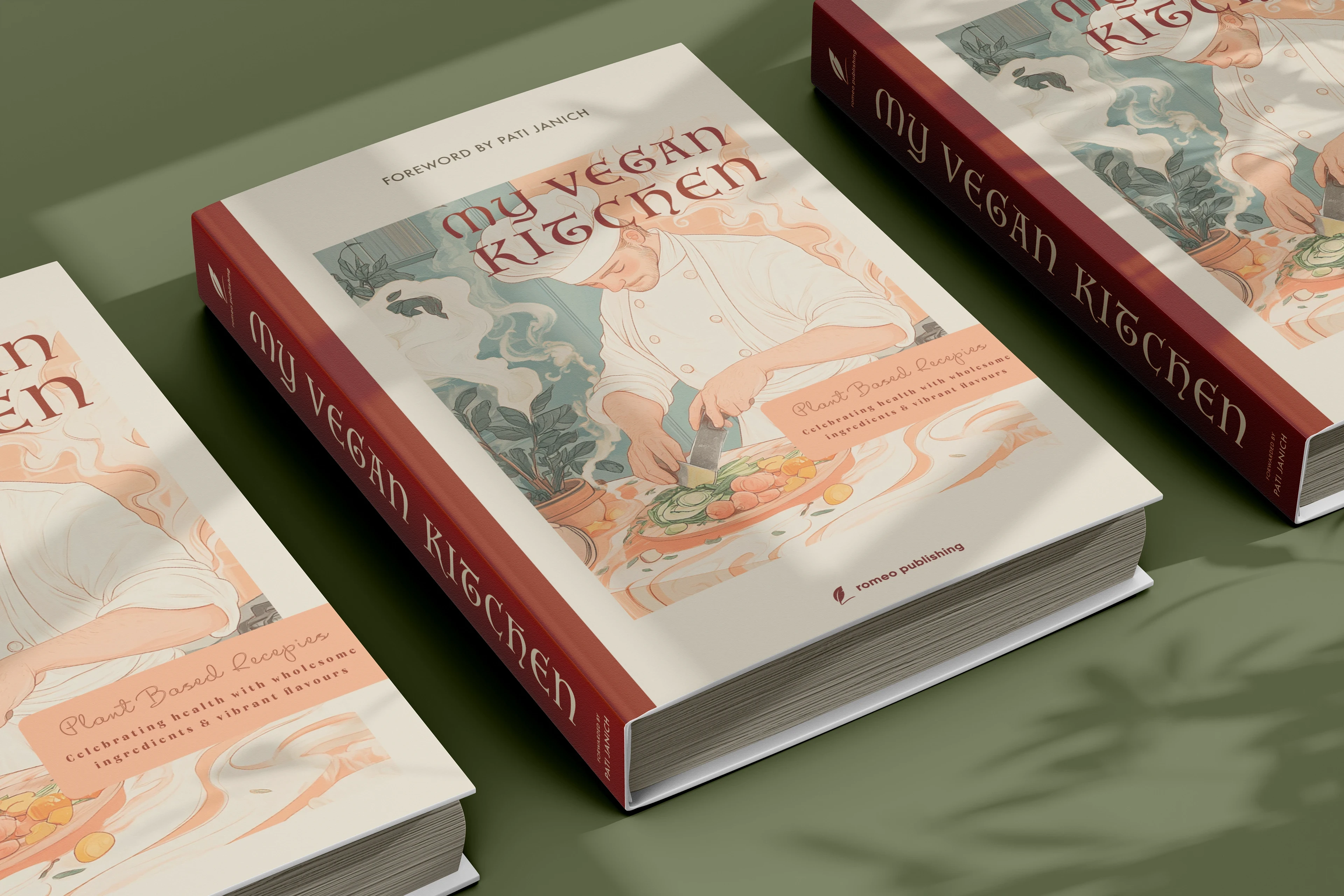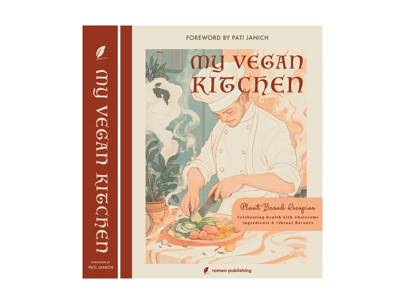 Editorial design for My Vegan Kitchen, a cookbook featuring clean layouts, warm visuals & easy typography for a fresh, modern and appetising reading experience.