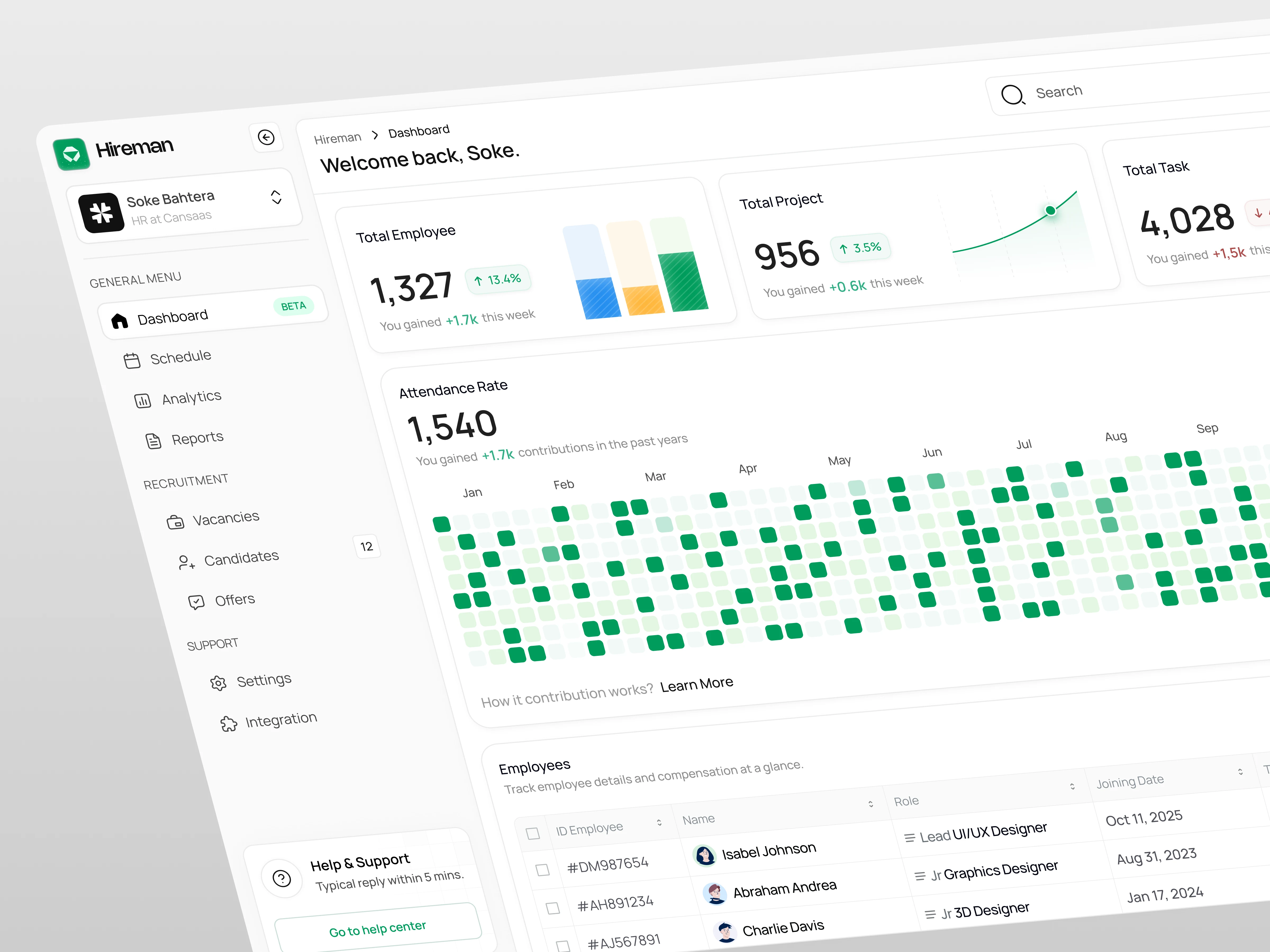 Traditional HR systems often suffer from cluttered layouts, poor data visibility, and fragmented user experiences that make daily operations inefficient. Managers struggle to track performance trends, attendance analytics, and compensation details in real time. The challenge was to design a dashboard that transforms raw HR data into actionable insights, enabling teams to make quick, informed decisions with confidence and ease.