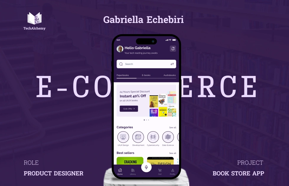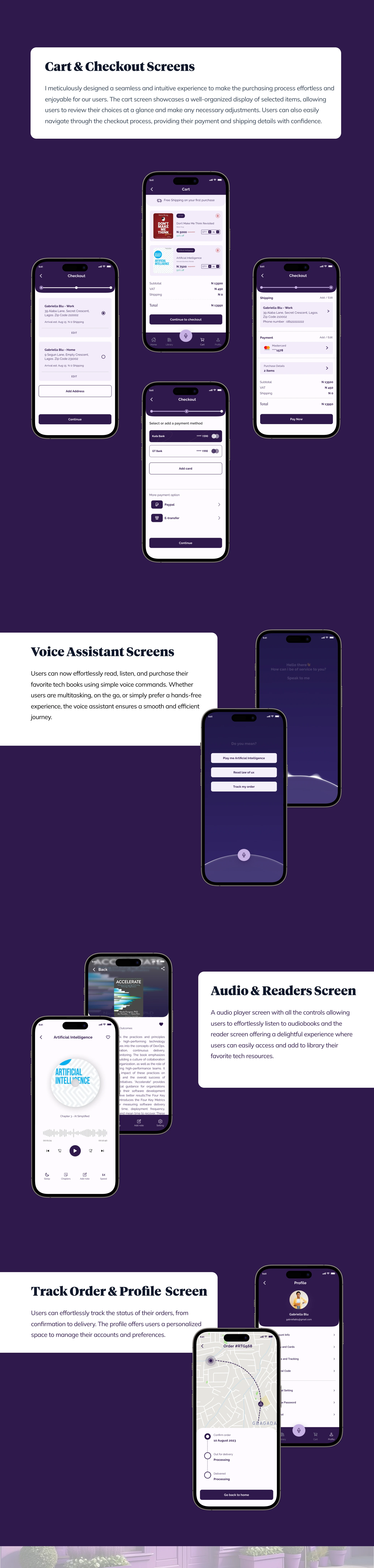 I completed the bookstore app with innovative voice browsing and multi-format support. 25+ screens covering discovery, checkout, tracking, and user management.