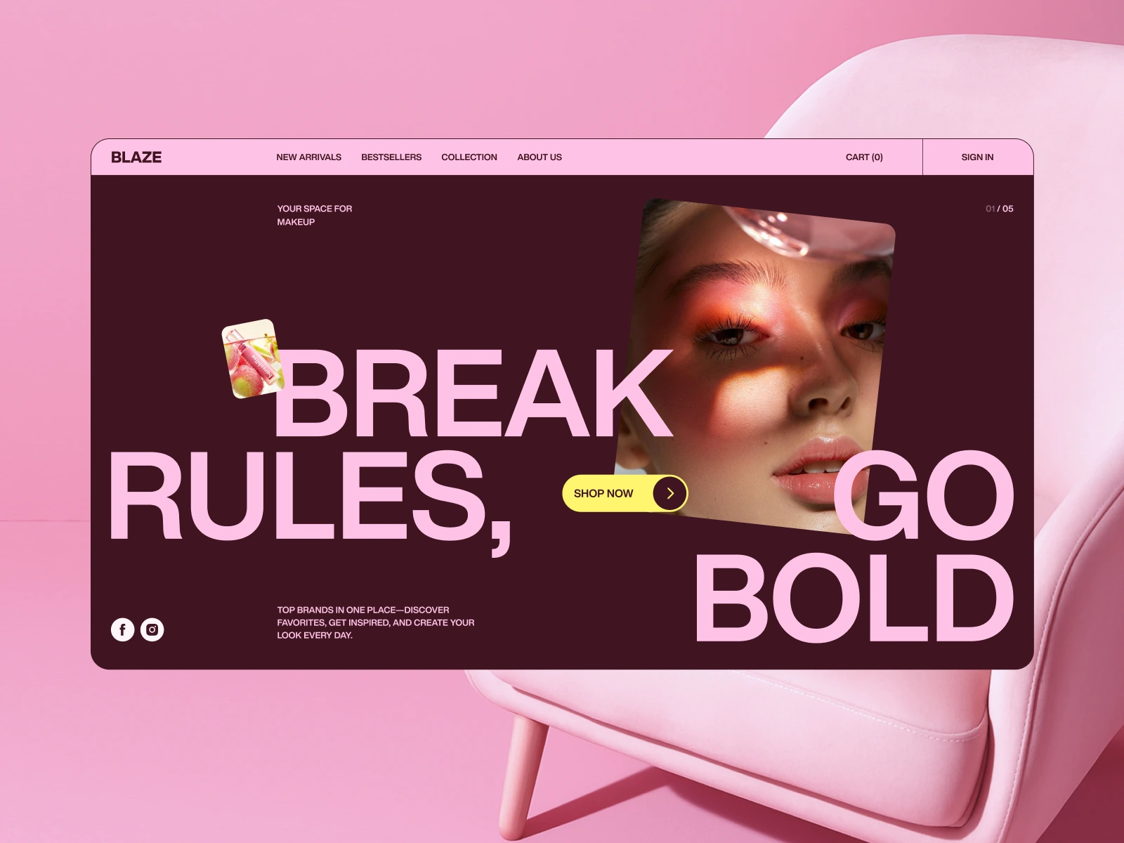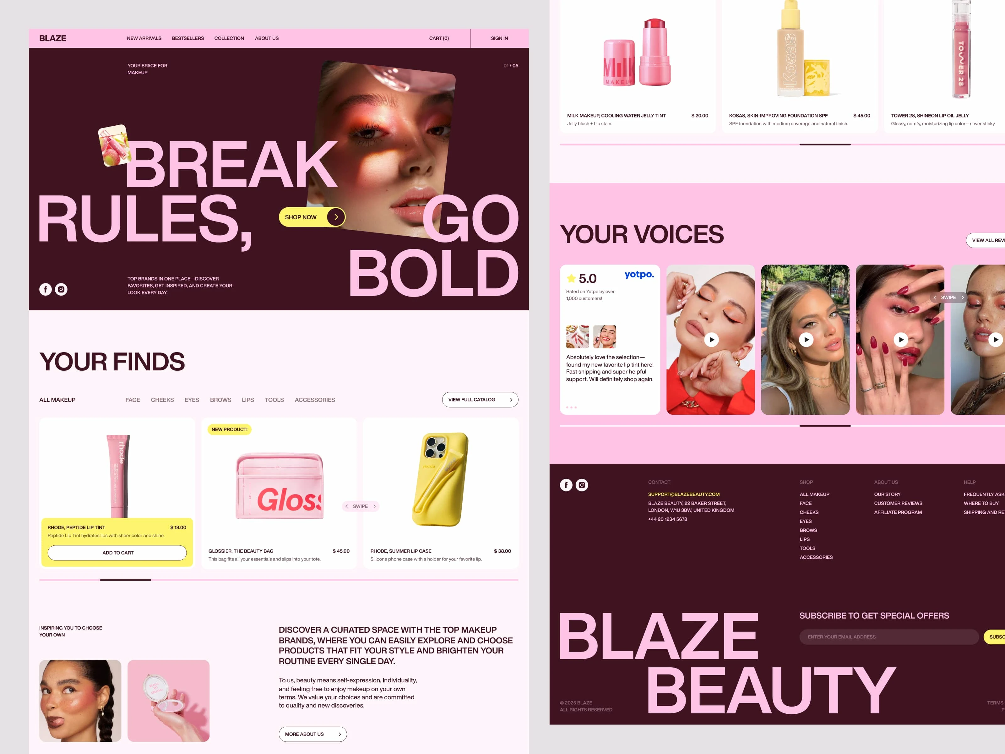 Blaze Beauty — bold e-commerce UI blending editorial visuals, confident typography, and seamless shopping for a modern makeup brand.