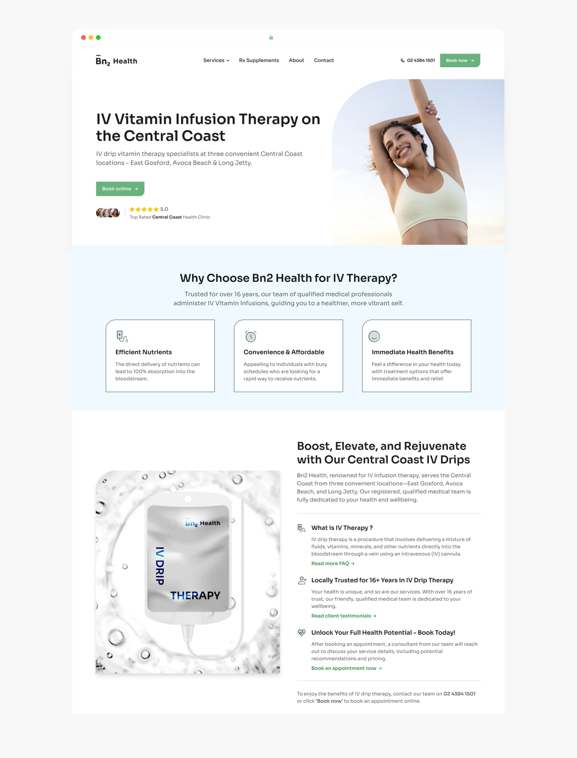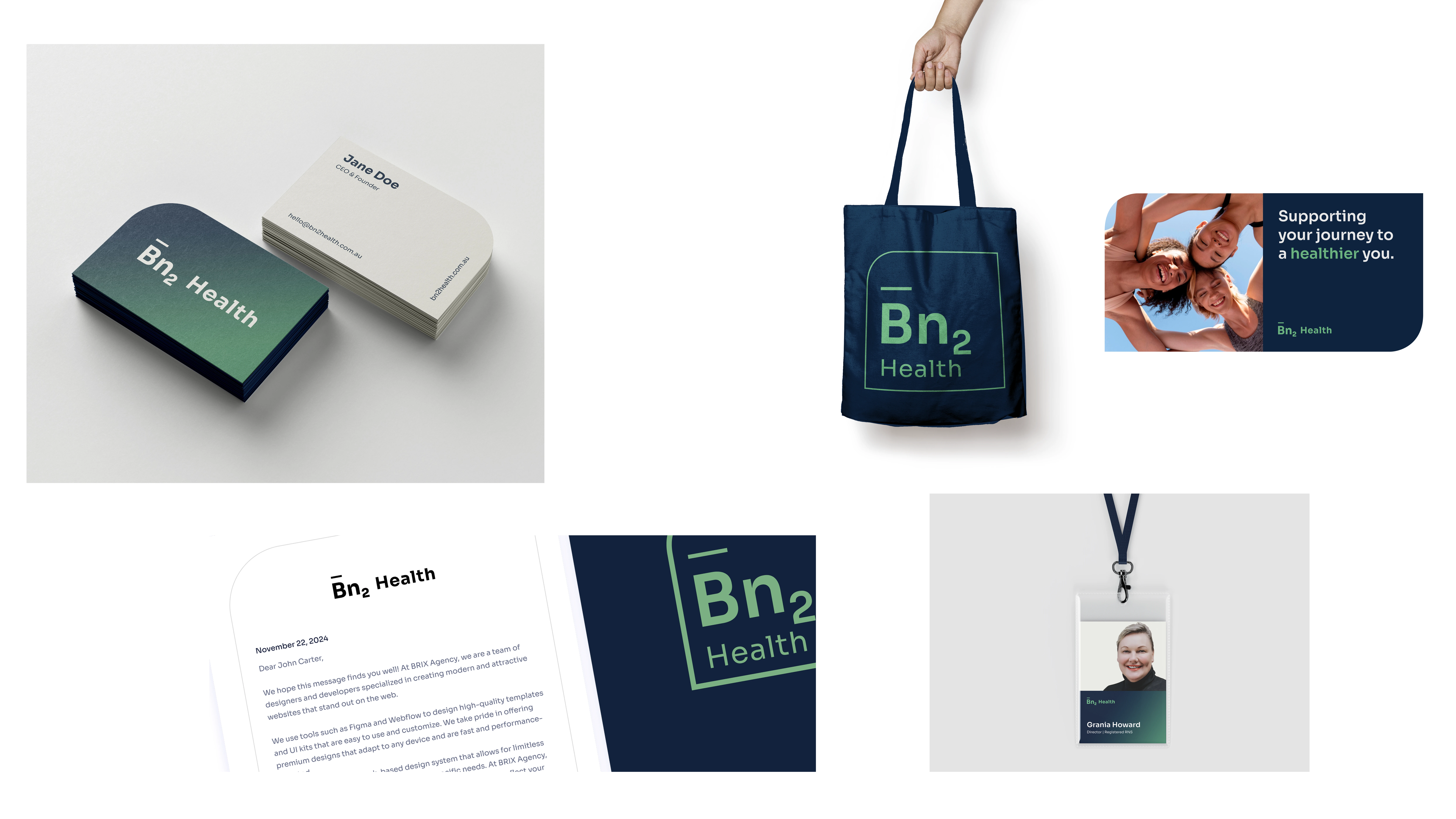 Revamped the outdated website and branding of this Australian IV Health clinic to align seamlessly with their modern values and aesthetics, transcending the barriers to optimal health. Bn2 Health's logo-inspired periodic table theme in layouts and materials underscores its dedication to scientific precision and modern healthcare.