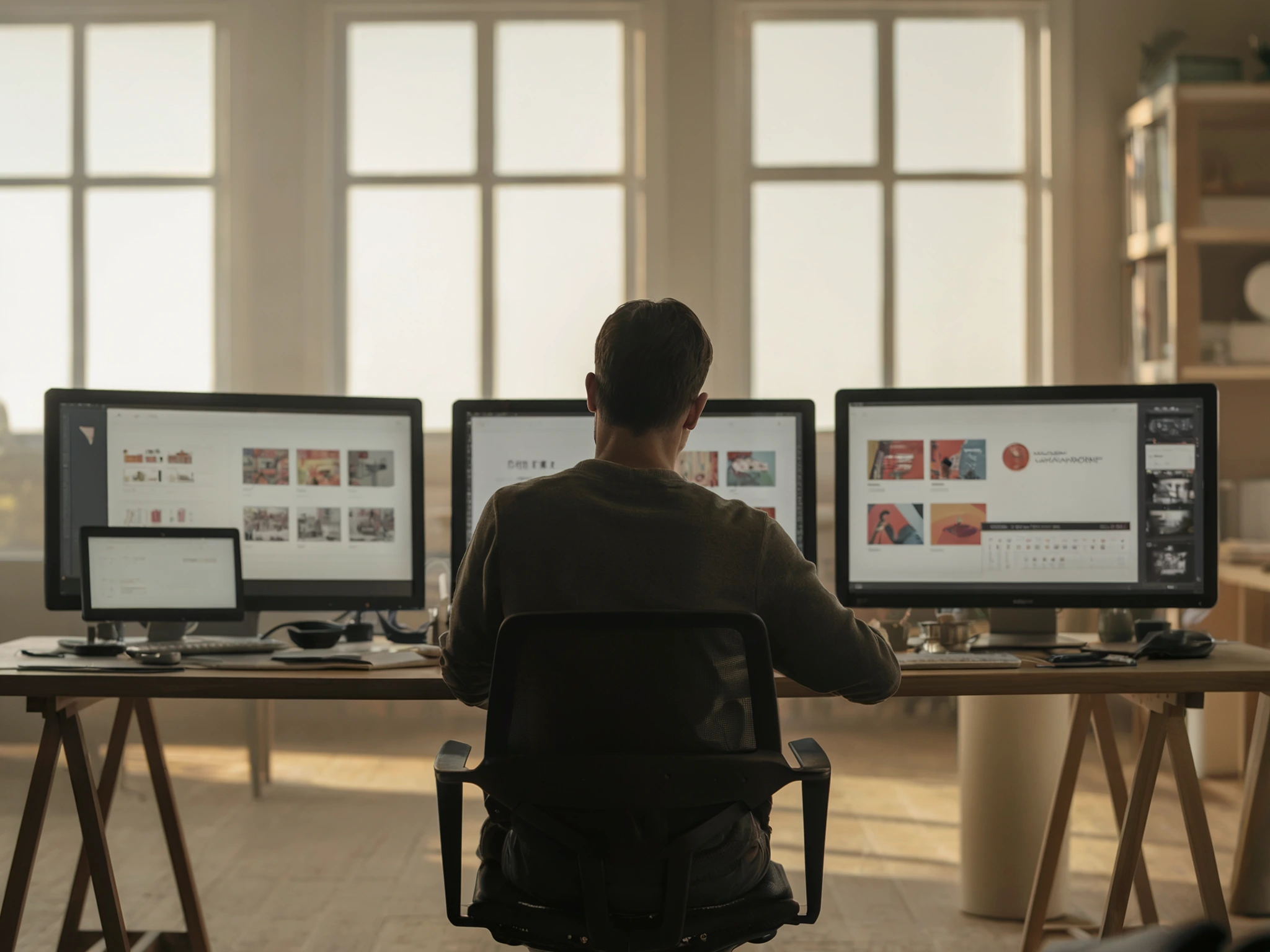 Each service’s visual was initiated with a highly detailed prompt describing a specific cinematic scene, incorporating relevant service context (e.g., a person interacting with a user interface for 'Funnels', a clean desk setup for 'SEO Strategy', dynamic charts for 'Automations') while meticulously maintaining the predefined tone, lighting, and color consistency.