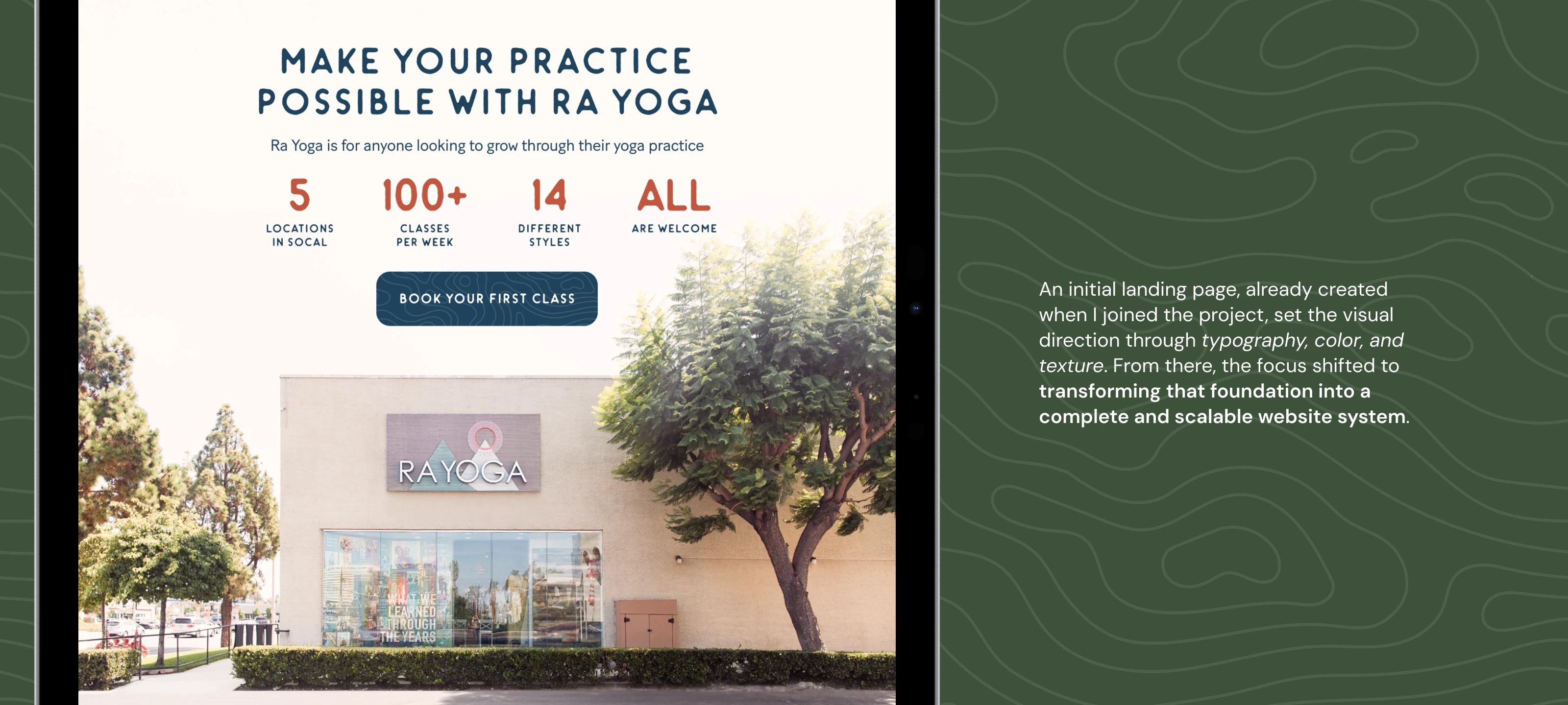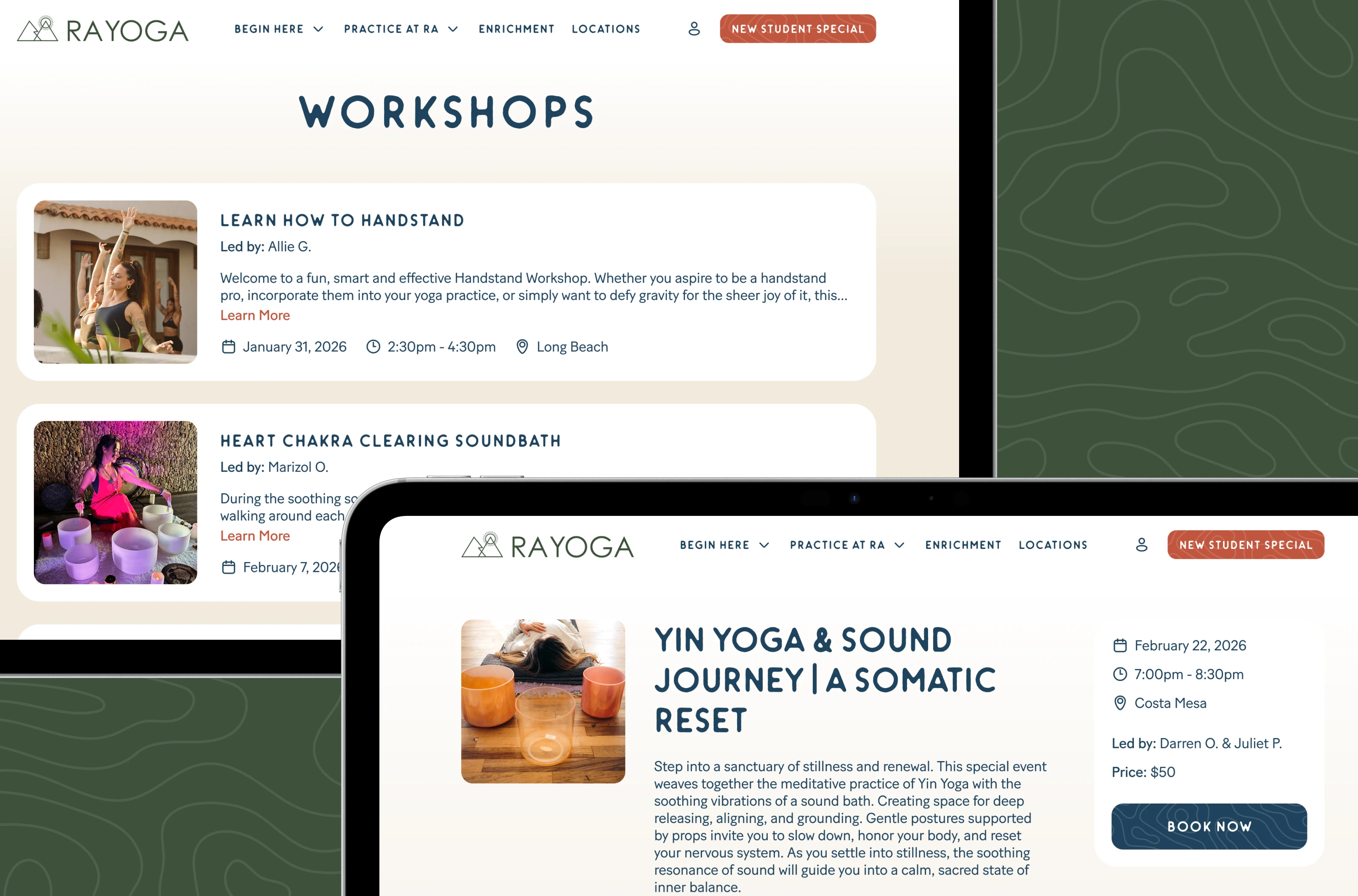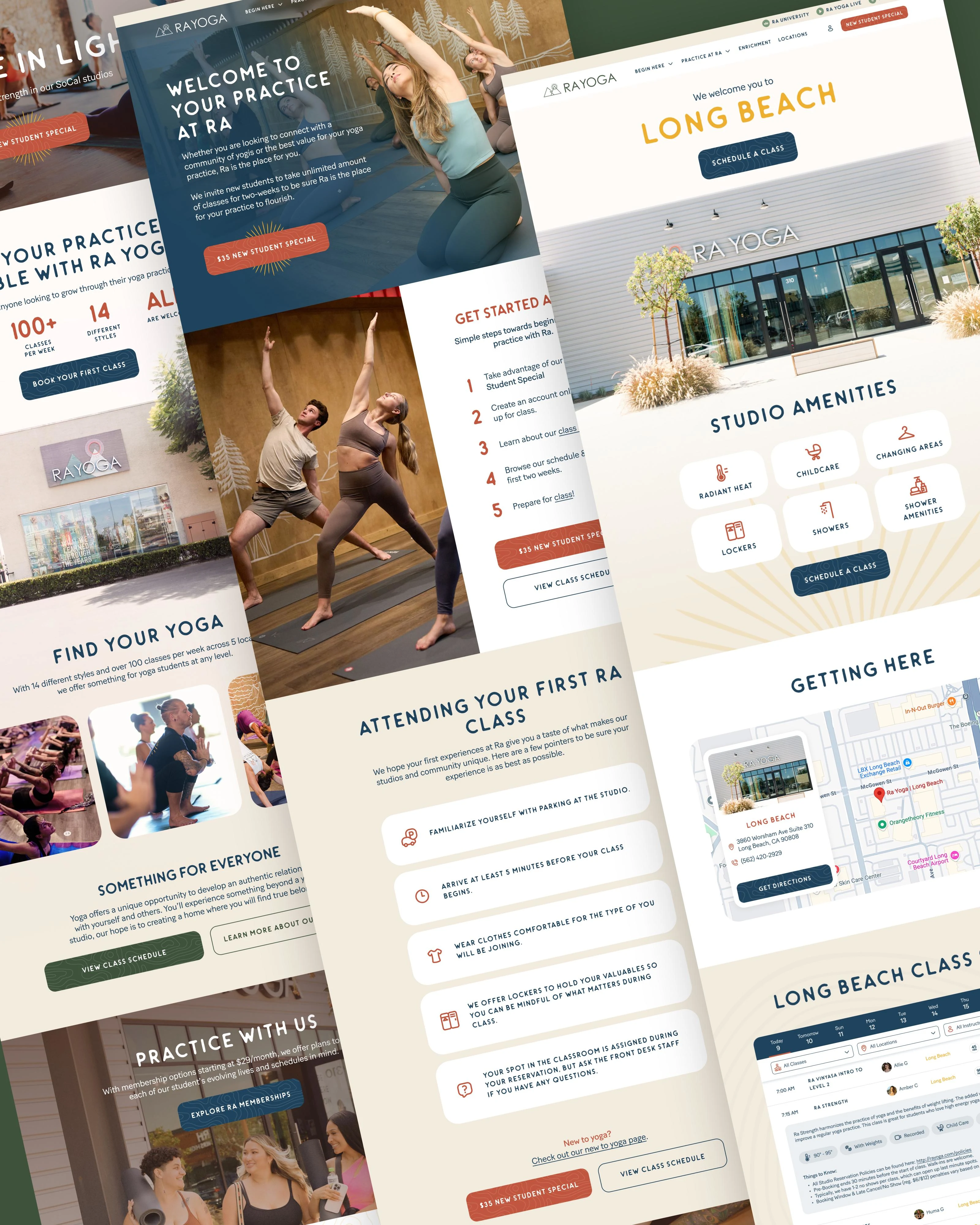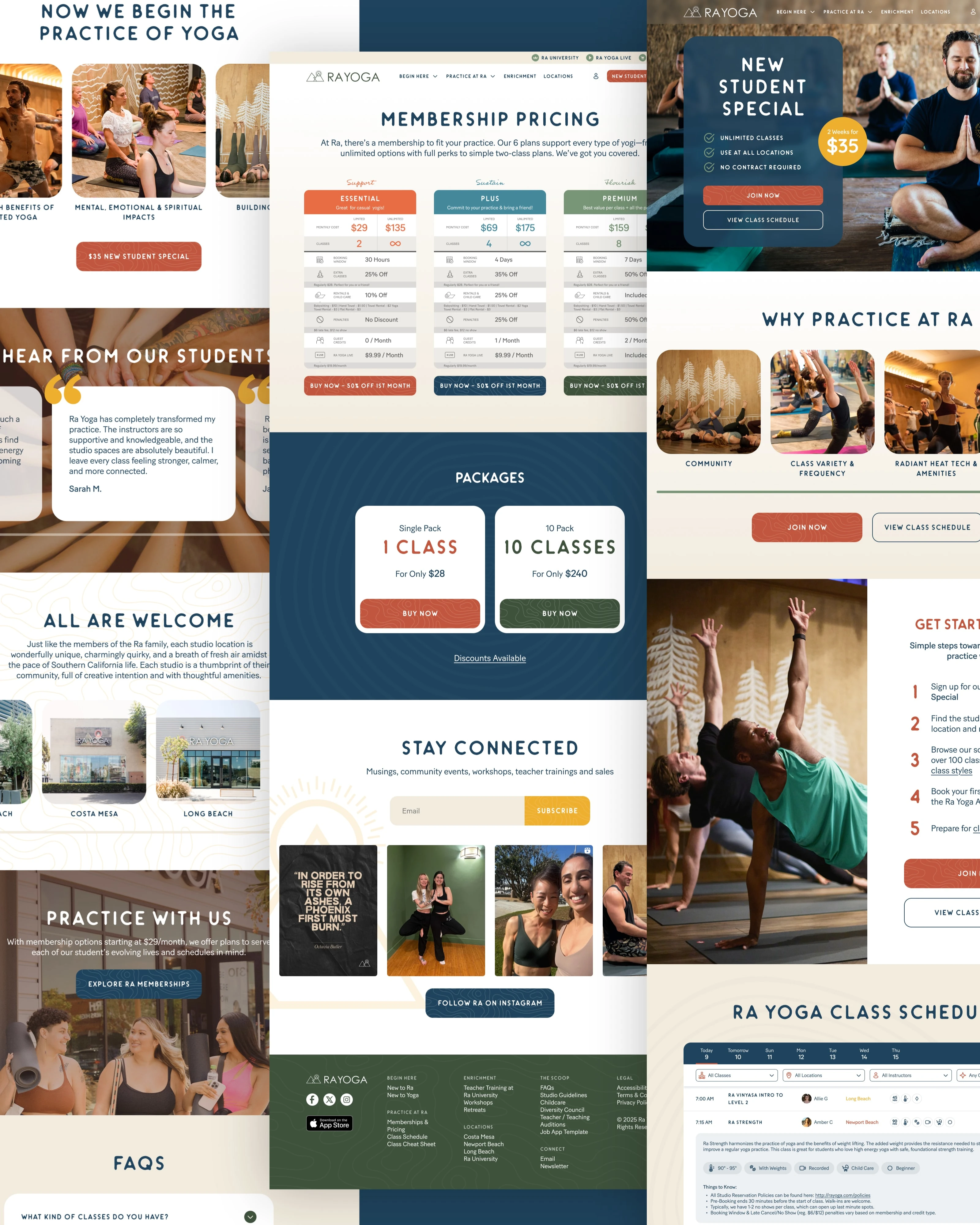 Website design showcasing Ra Yoga’s services, classes, locations, and workshops in a clear, cohesive digital presence.
