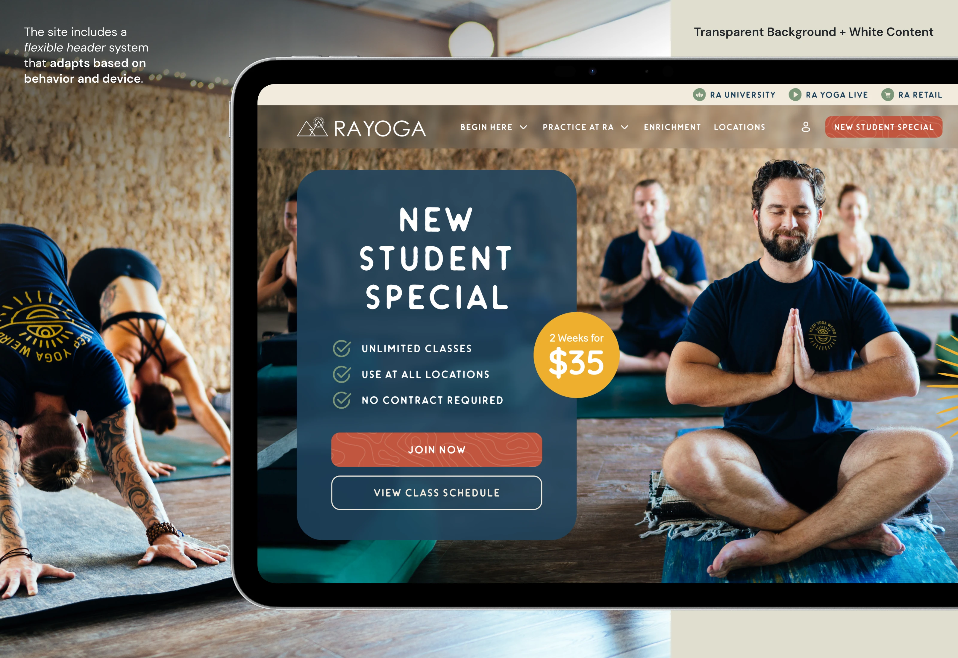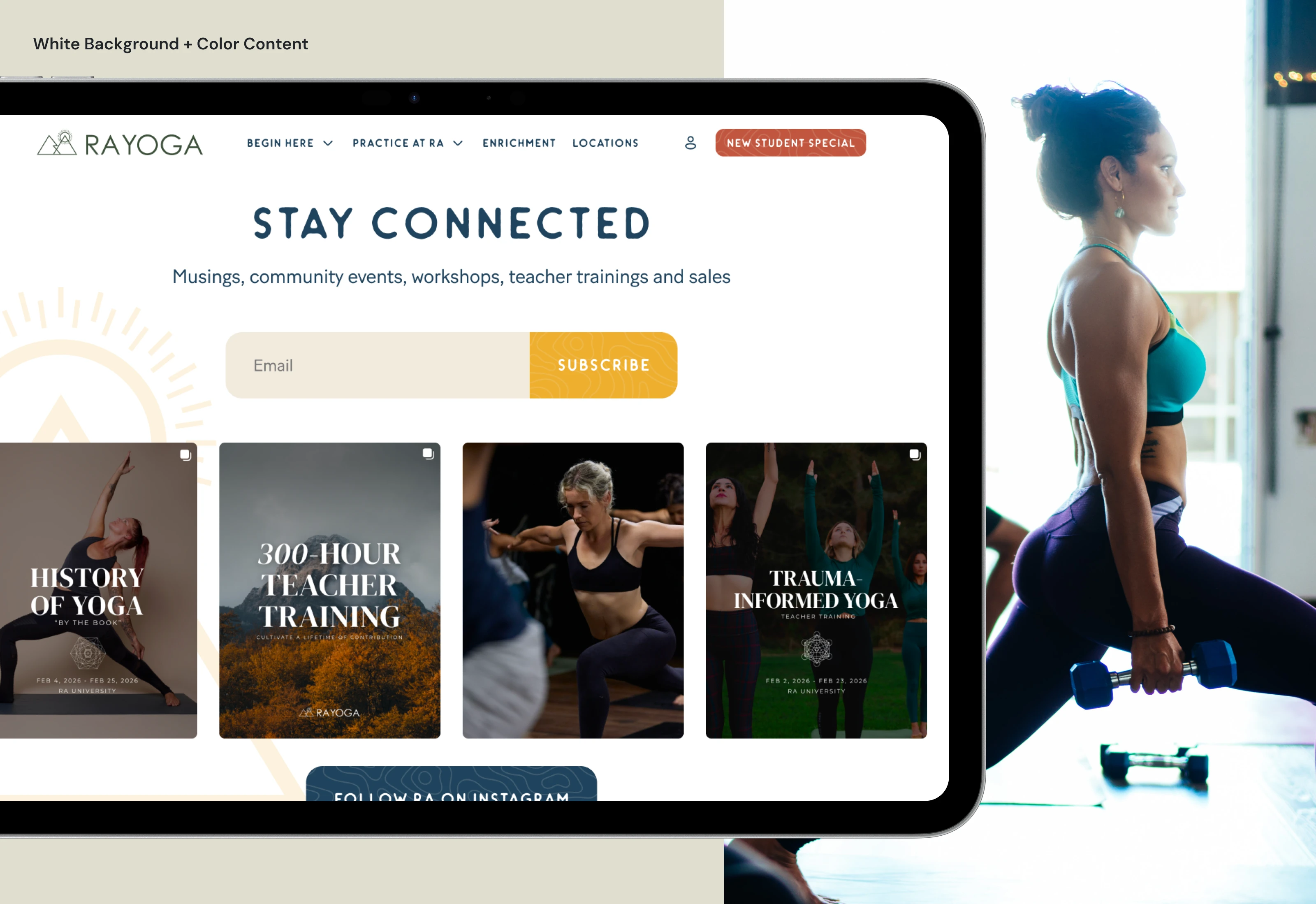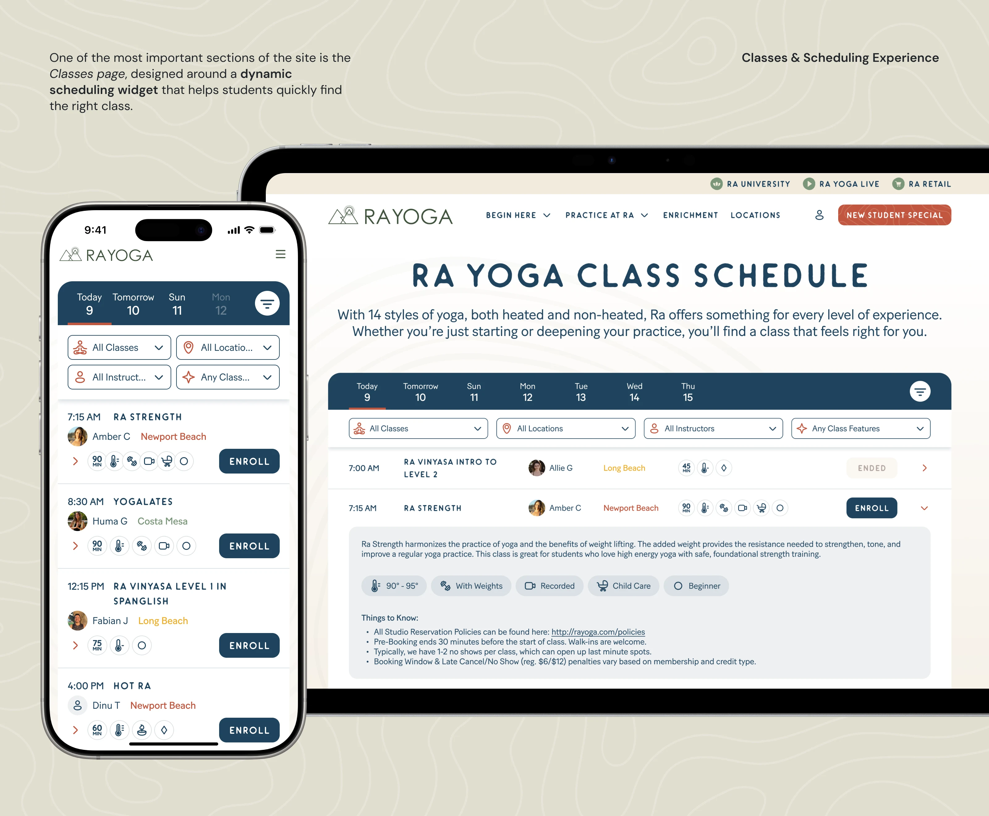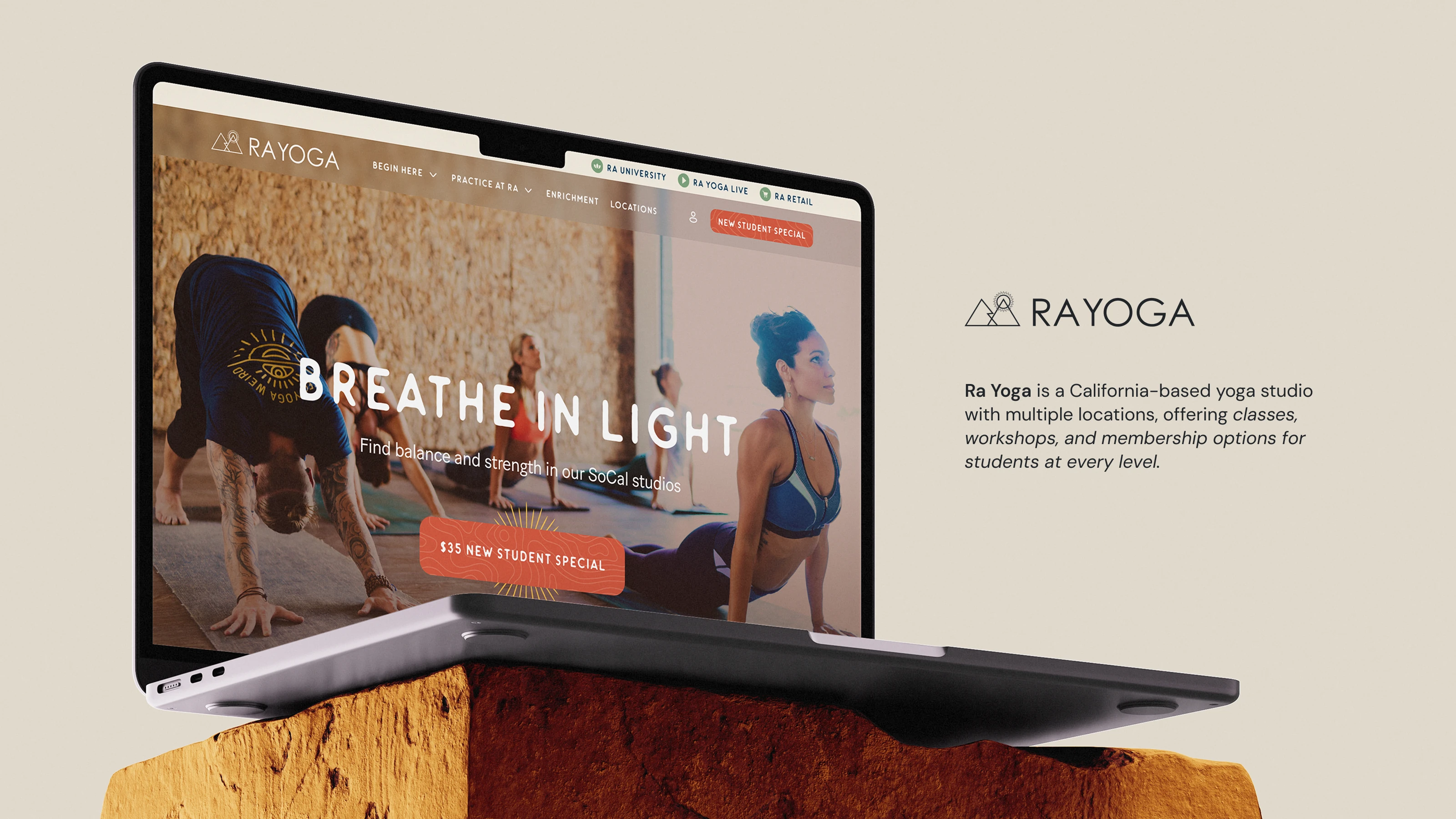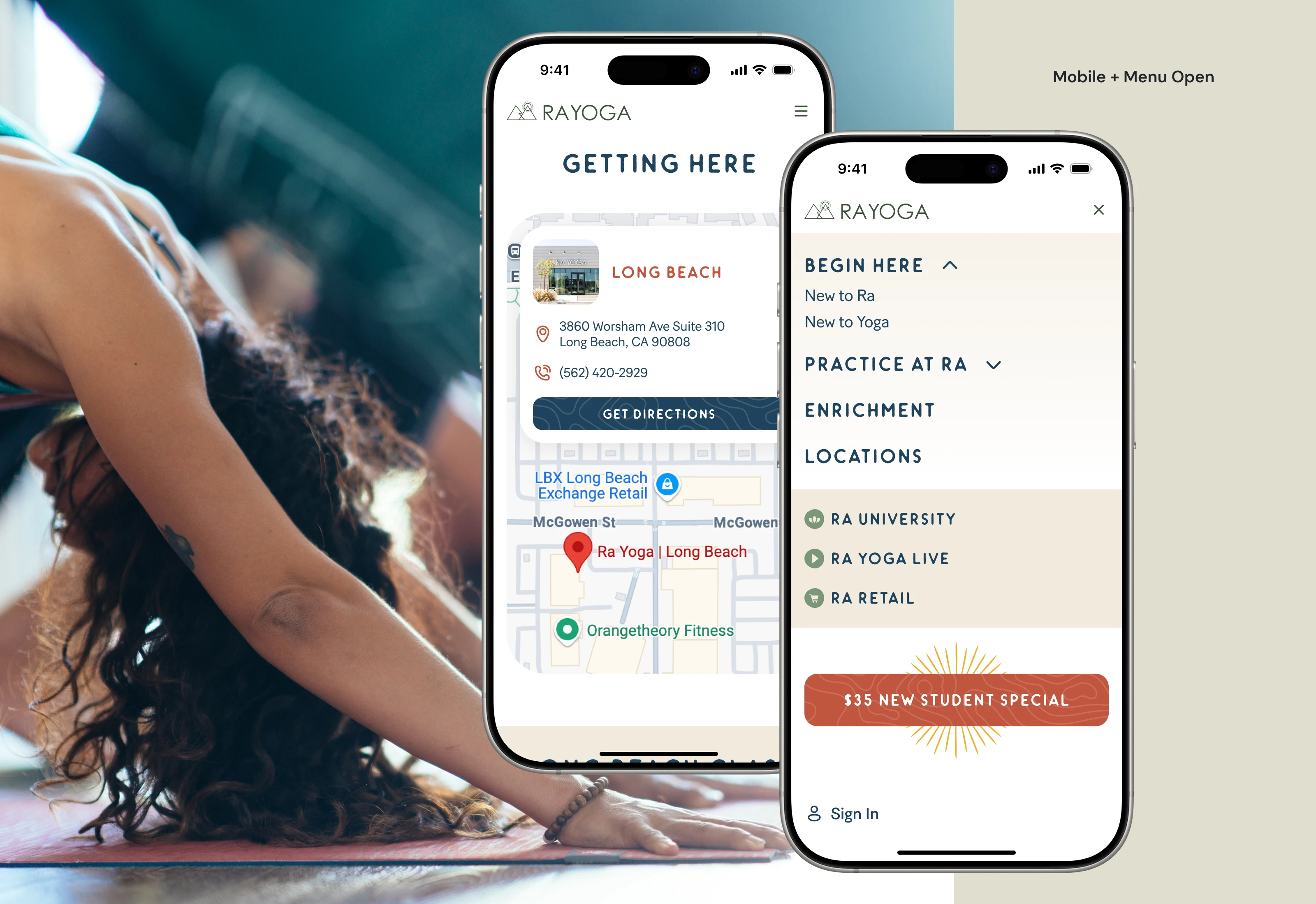 Website design showcasing Ra Yoga’s services, classes, locations, and workshops in a clear, cohesive digital presence.