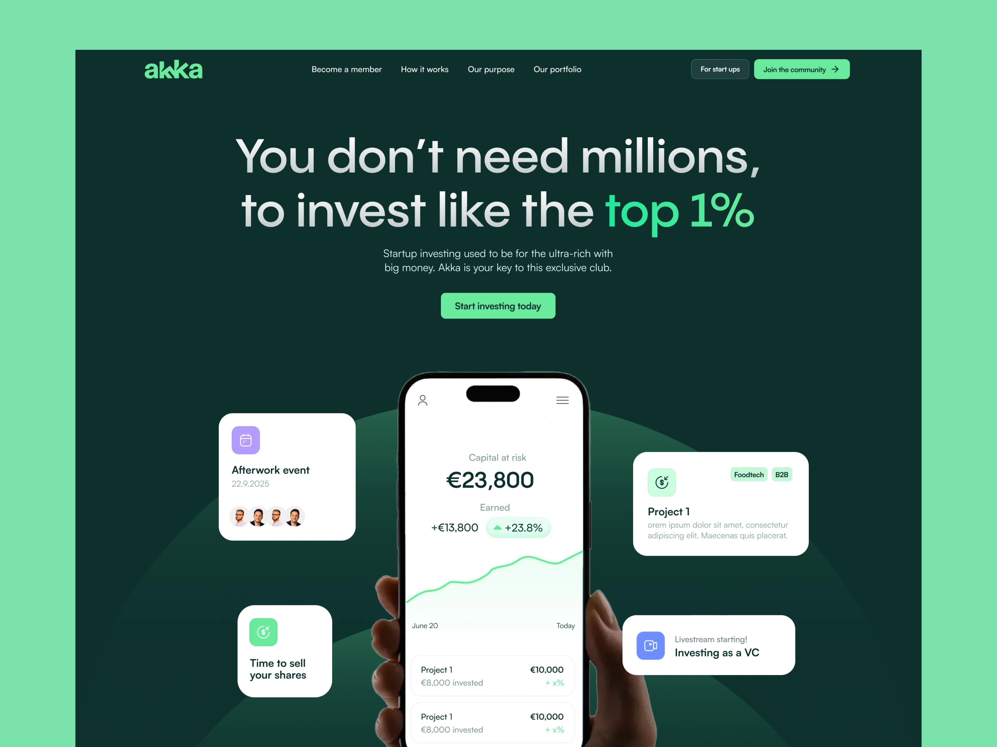 Webdesign of akka.app — A platform that gives everyday investors access to carefully pre-vetted European tech startups so they can invest in early-stage companies like a venture capitalist would