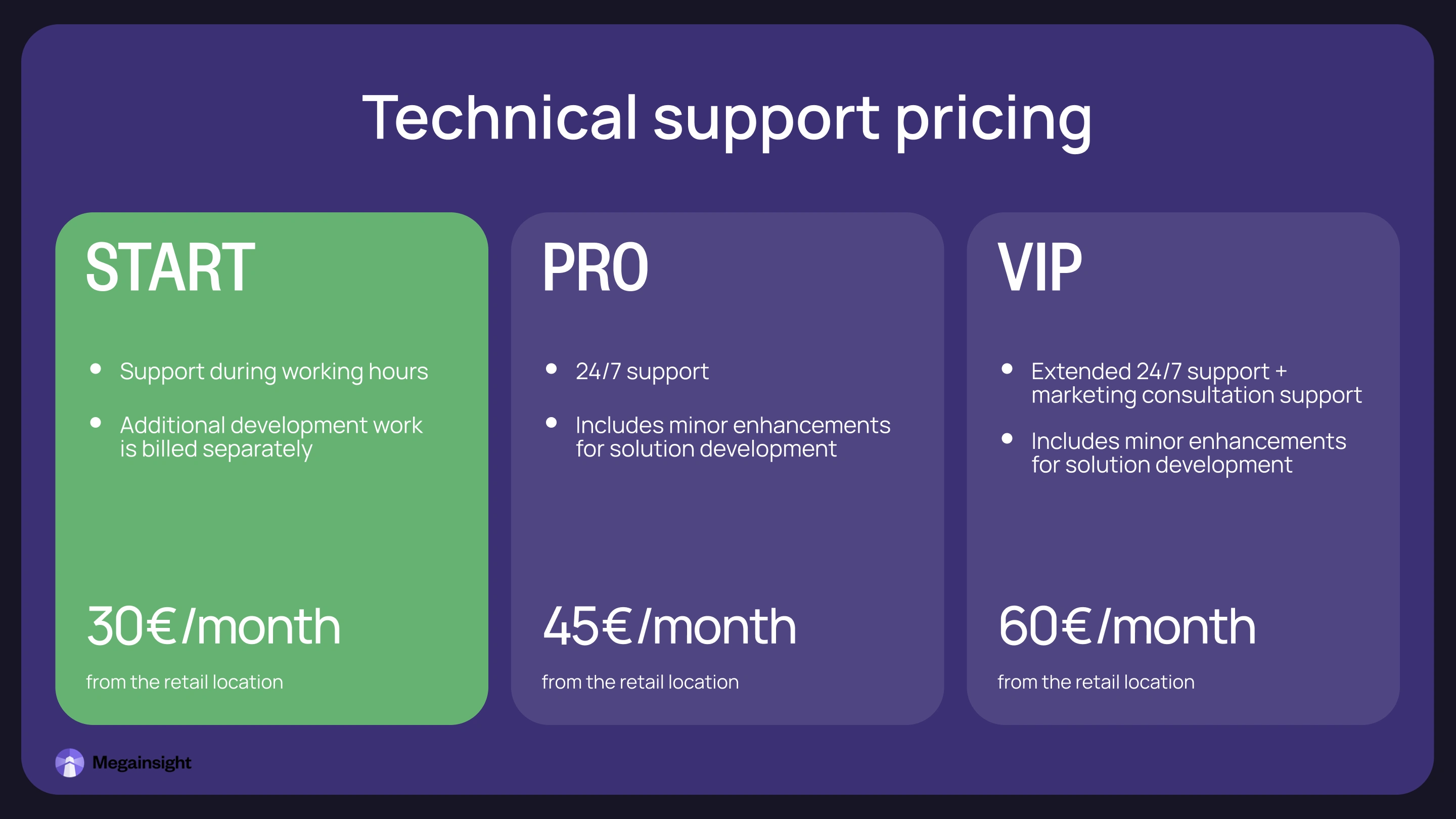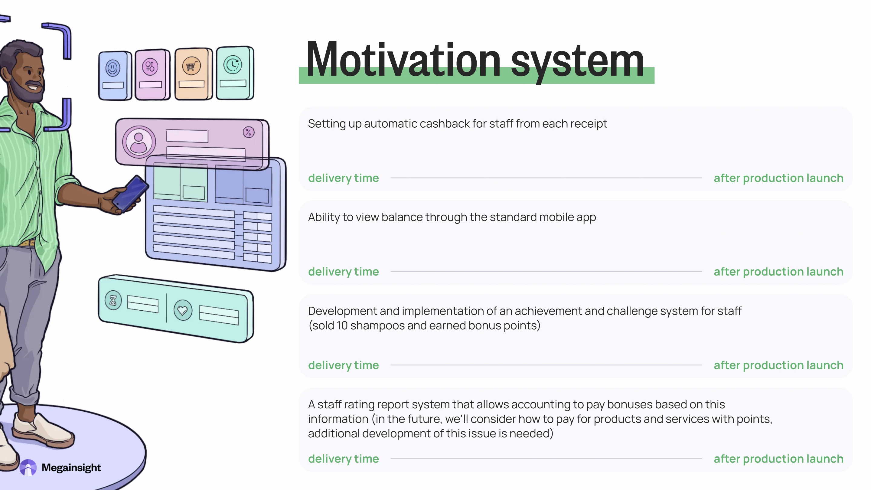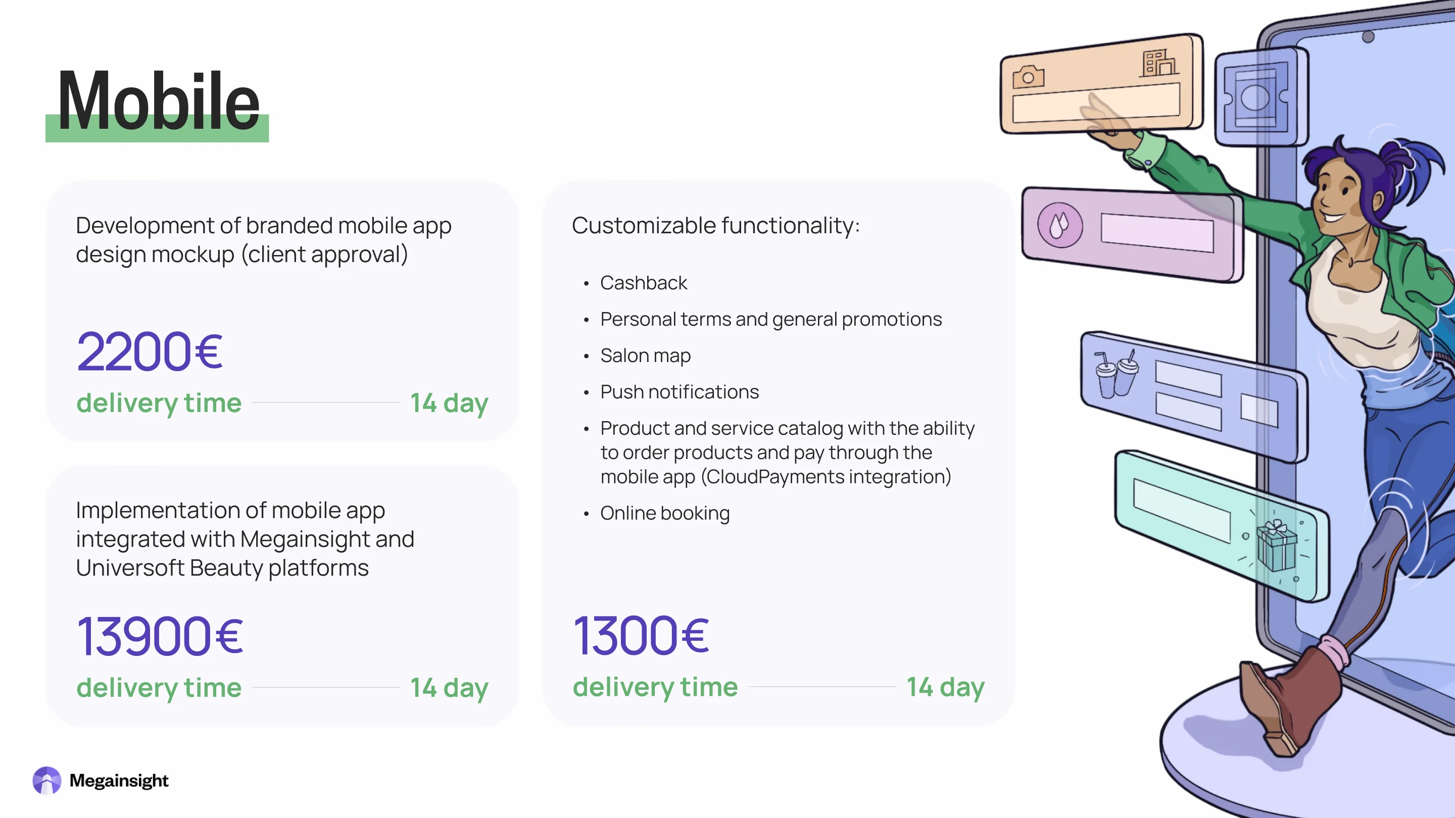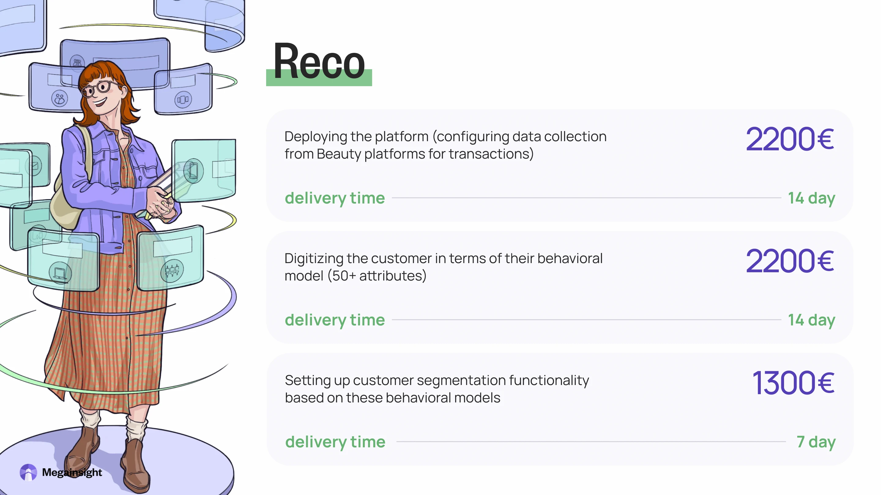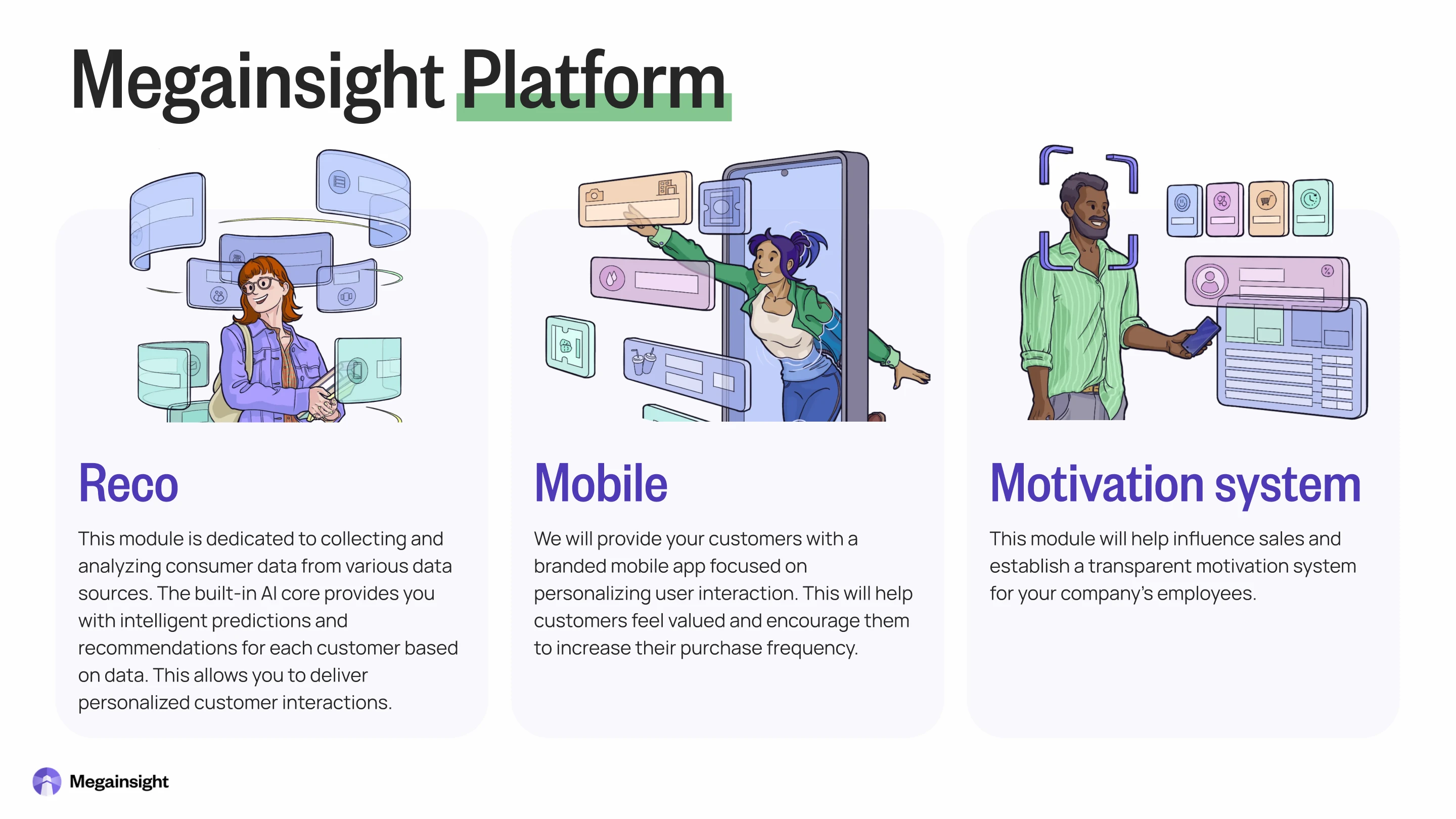 Commercial proposal for Megainsight Platform — a system for beauty salons to analyse data and build customer loyalty. It has three main parts: Reco (AI data analysis), Mobile (branded app), and Motivation System (rewards for staff). The task was to change a technical document with prices and features into a clear, attractive proposal.