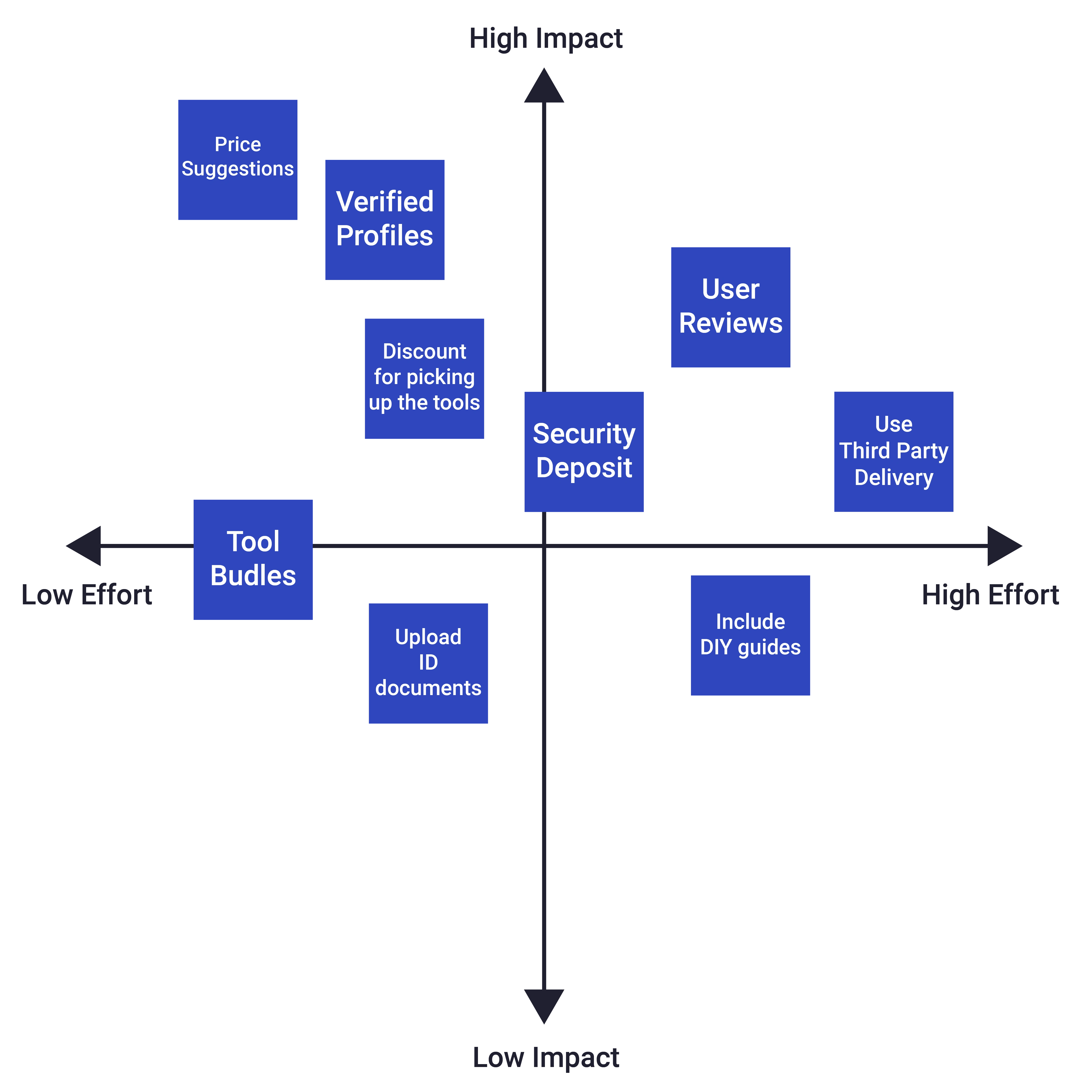 The stage of ideation started with a definition of the minimum viable product. I mapped out several of my ideas based on the impact they have in relation to the effort they would require.