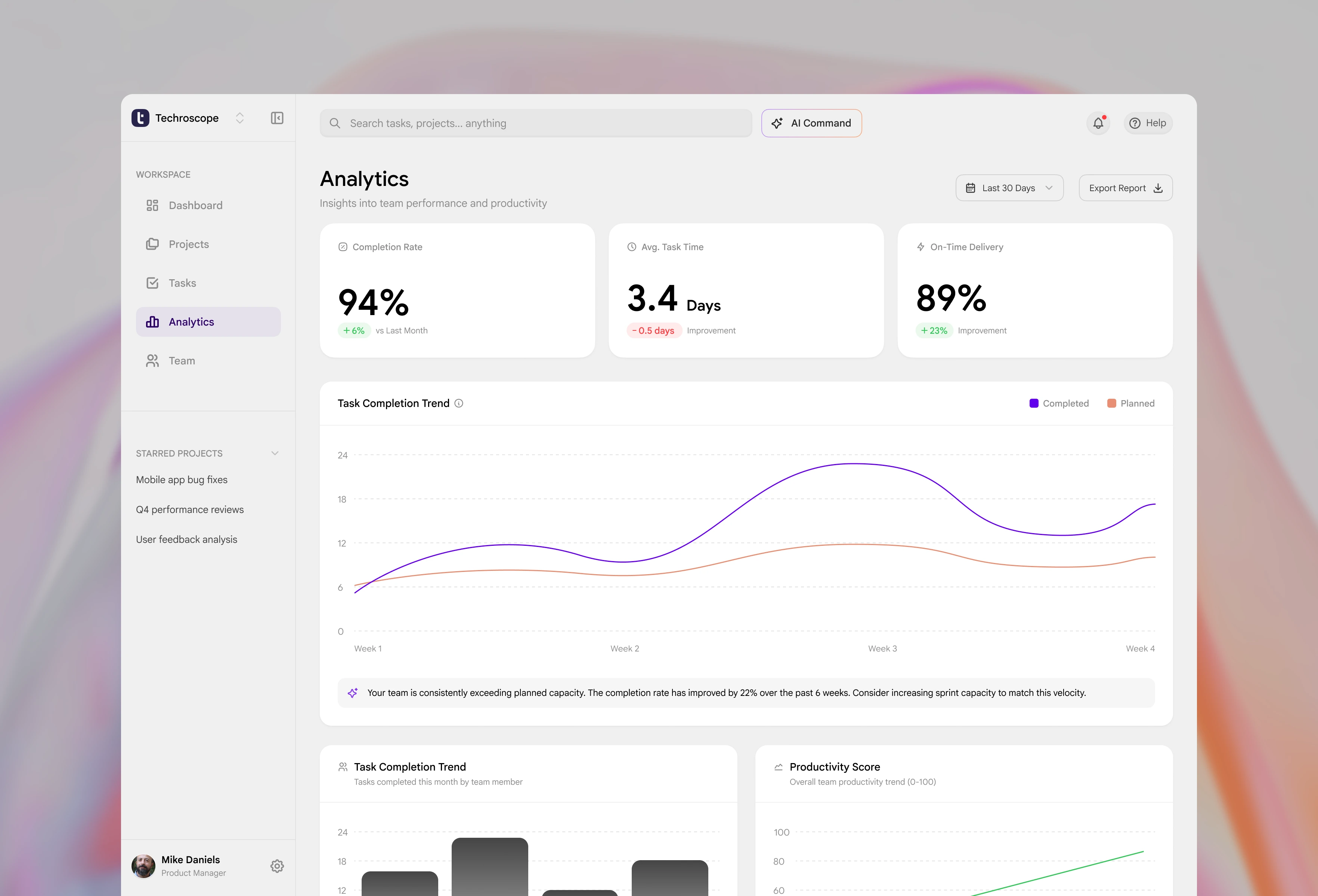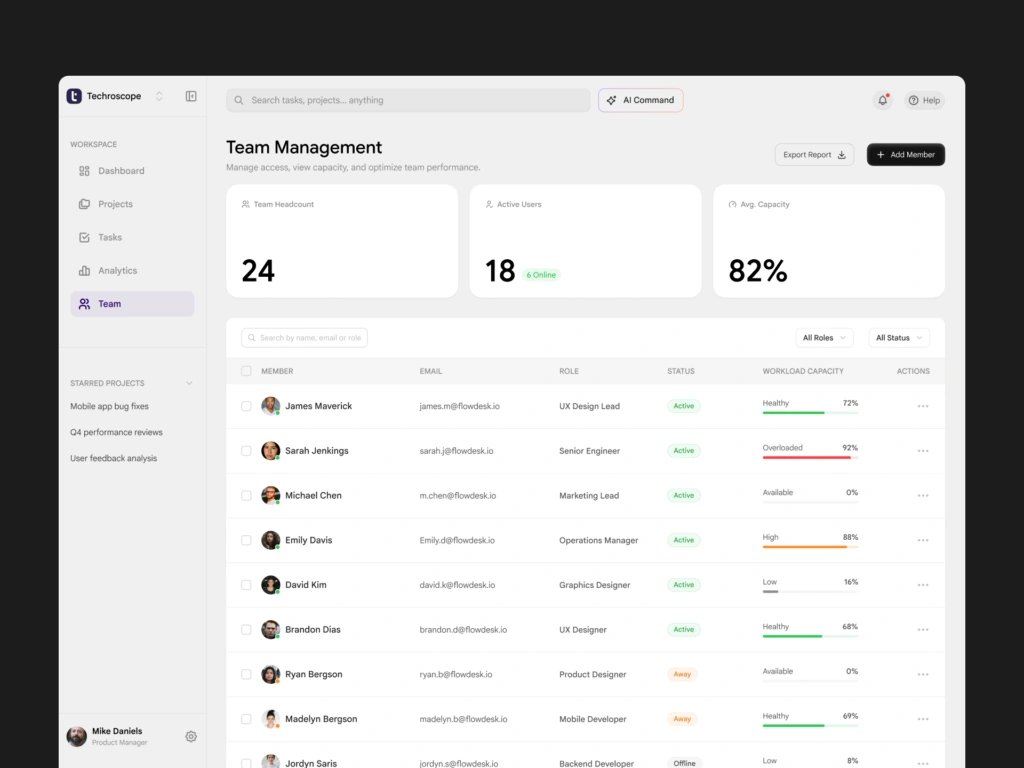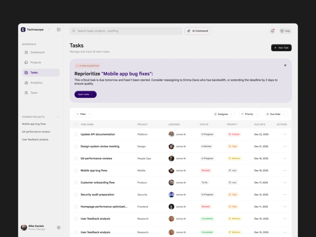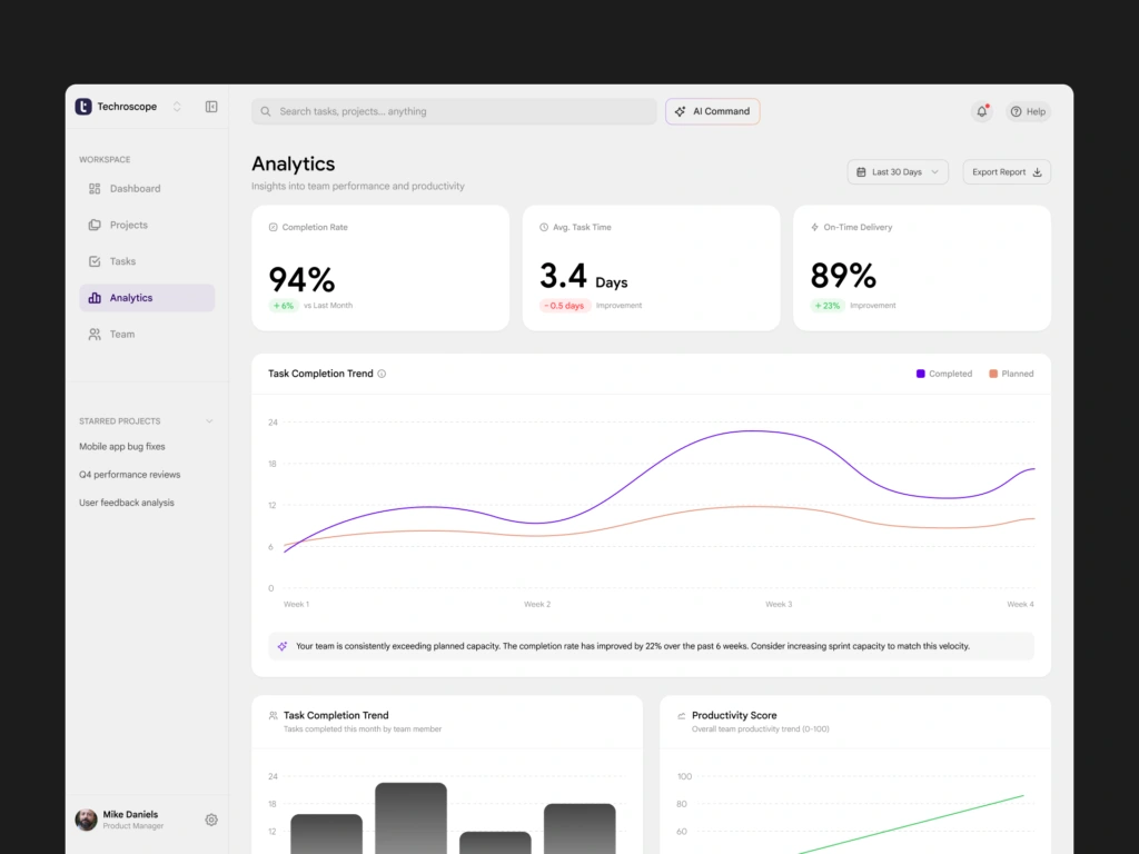 Most team productivity tools overwhelm users with data but fail to answer one simple question: What should I focus on right now? Managers waste time scanning dashboards, opening multiple views, and manually interpreting task lists, reports, and workload distribution. Existing tools surface information, but they do not provide clarity or prioritization, especially under time pressure. The challenge was to design a dashboard that: