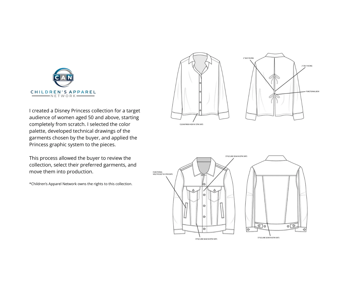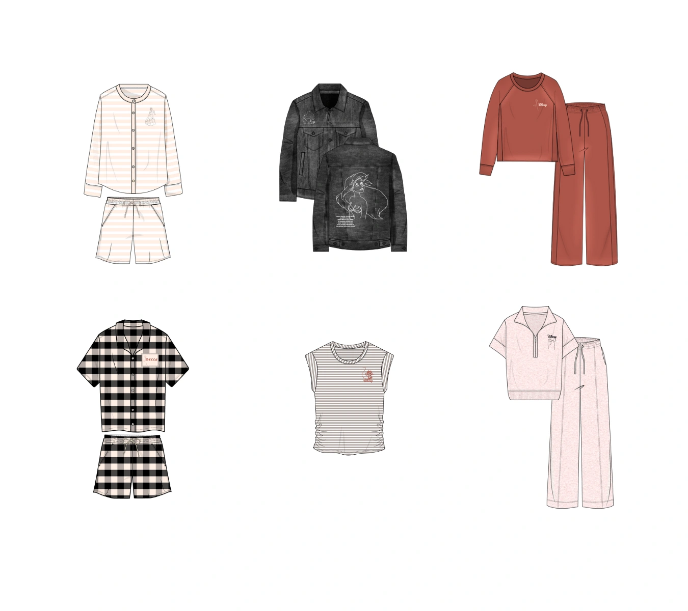 Created a Disney Princess collection for women 50+, from color palette to technical drawings, applying graphics so buyers could select and produce garments.