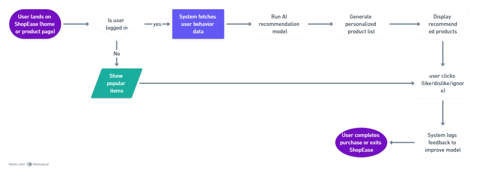 ShopEase is a concept e-commerce platform designed to simplify online shopping through intelligent, user-centered features. The brand aims to deliver a seamless product discovery experience using AI-powered recommendations tailored to each shopper’s preferences.
