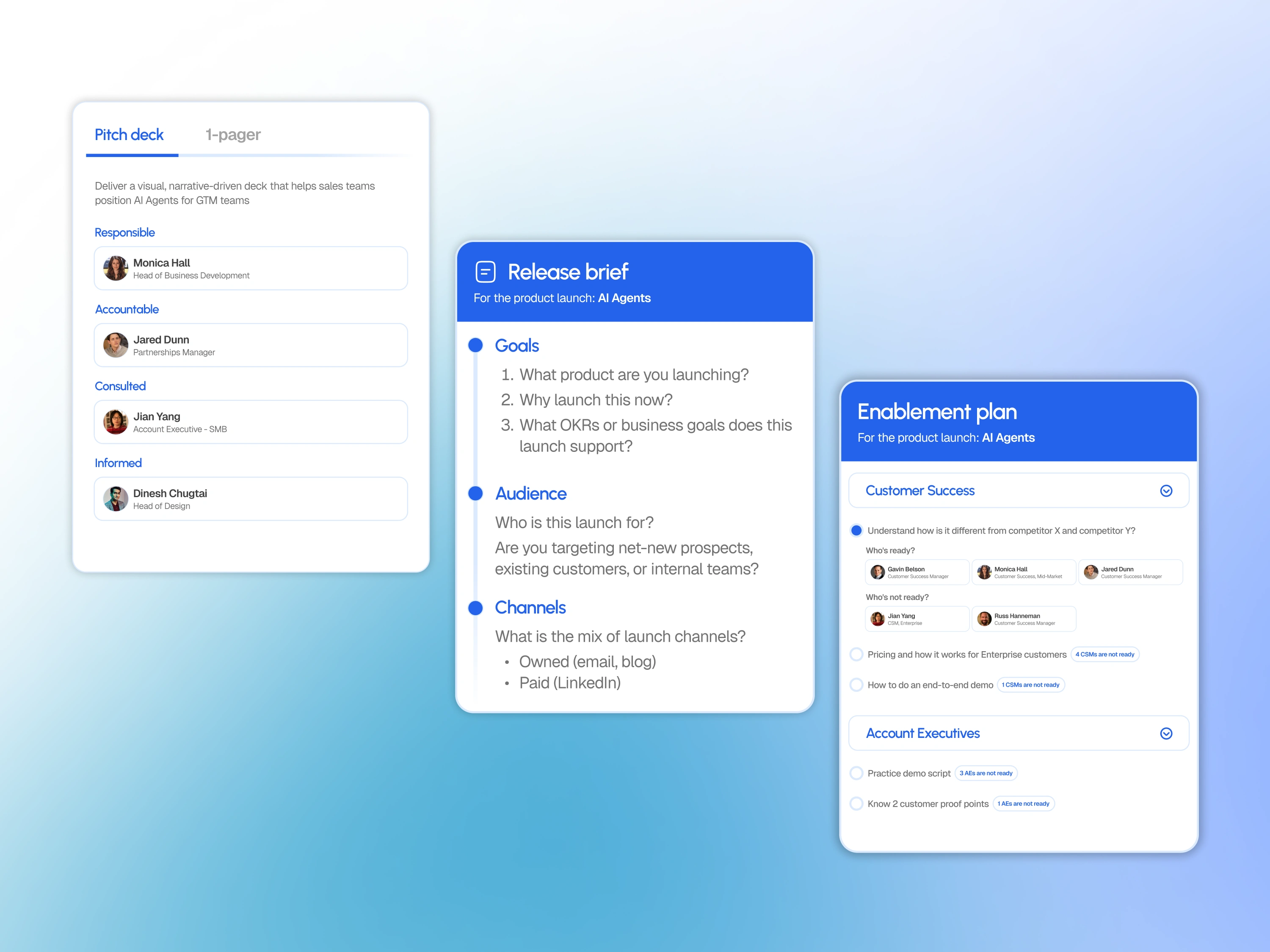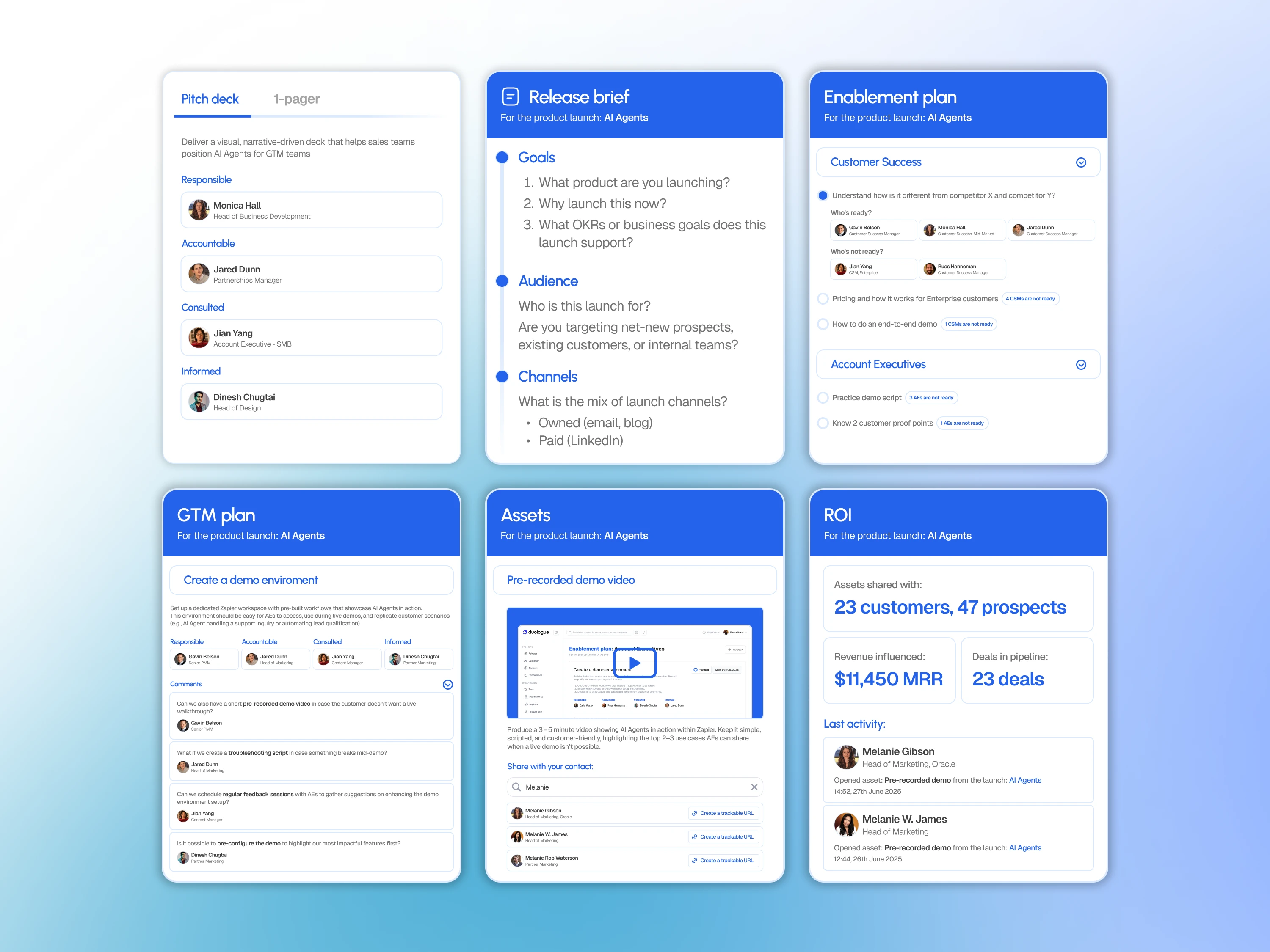 Shaped a Card‑based UI that clarifies the launch flow in six concise, verb‑led steps, enabling teams to validate expectations, involve stakeholders, co‑create enablement, plan GTM, build buyer‑relevant assets, and measure real ROI with less friction. The system’s consistent hierarchy and copy patterns ensure quick comprehension and smoother handoffs across sales, product marketing, and customer‑facing teams.