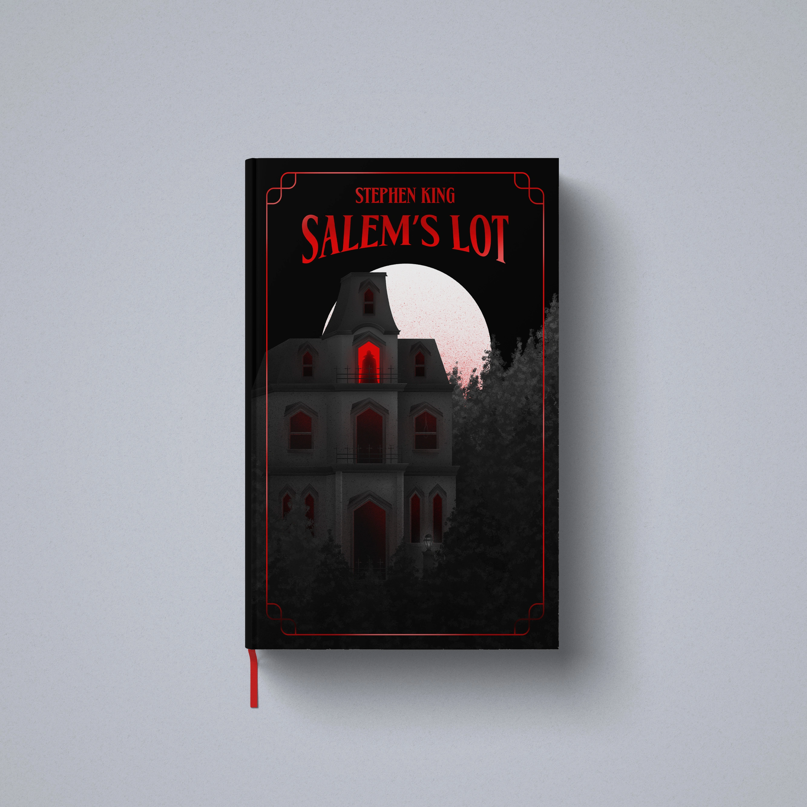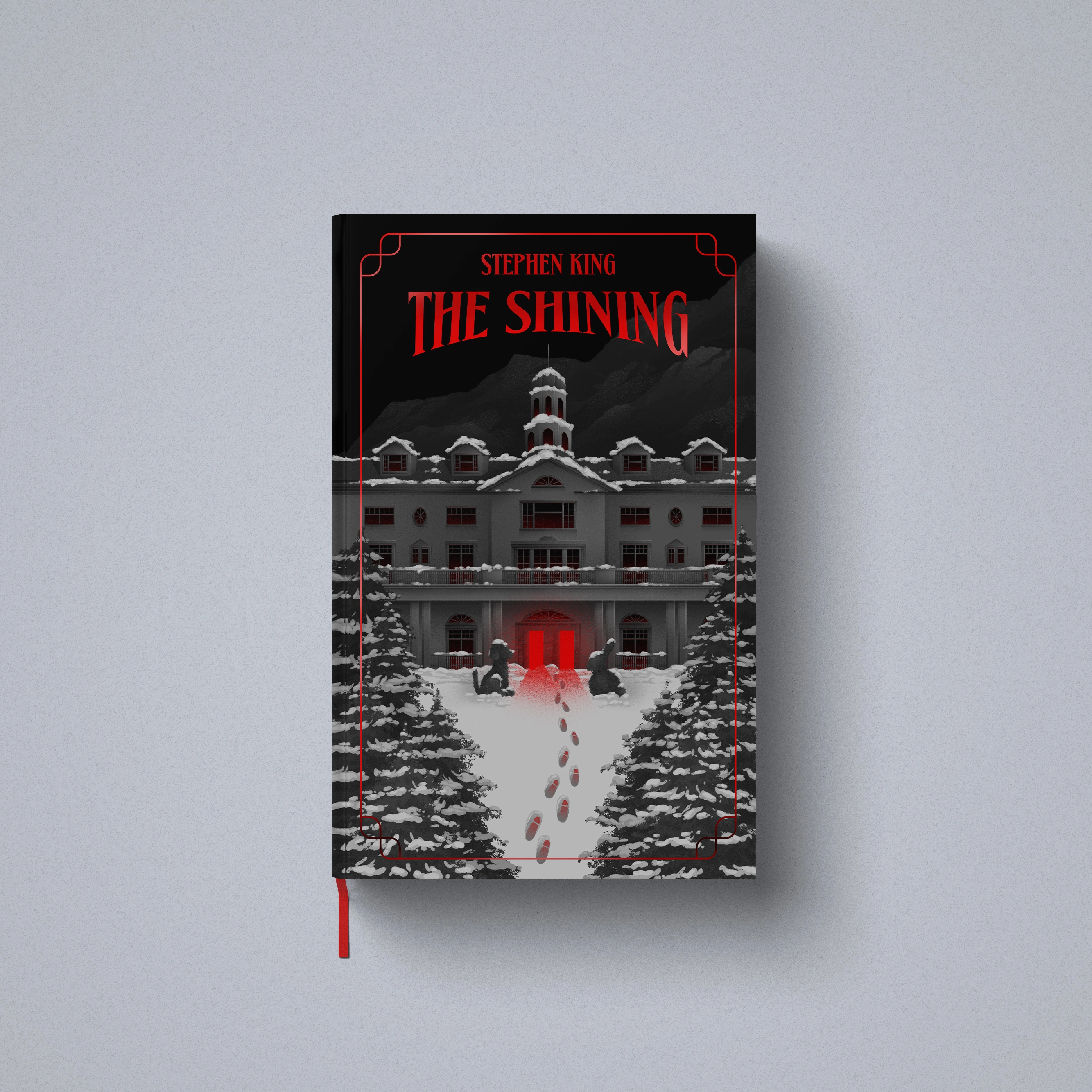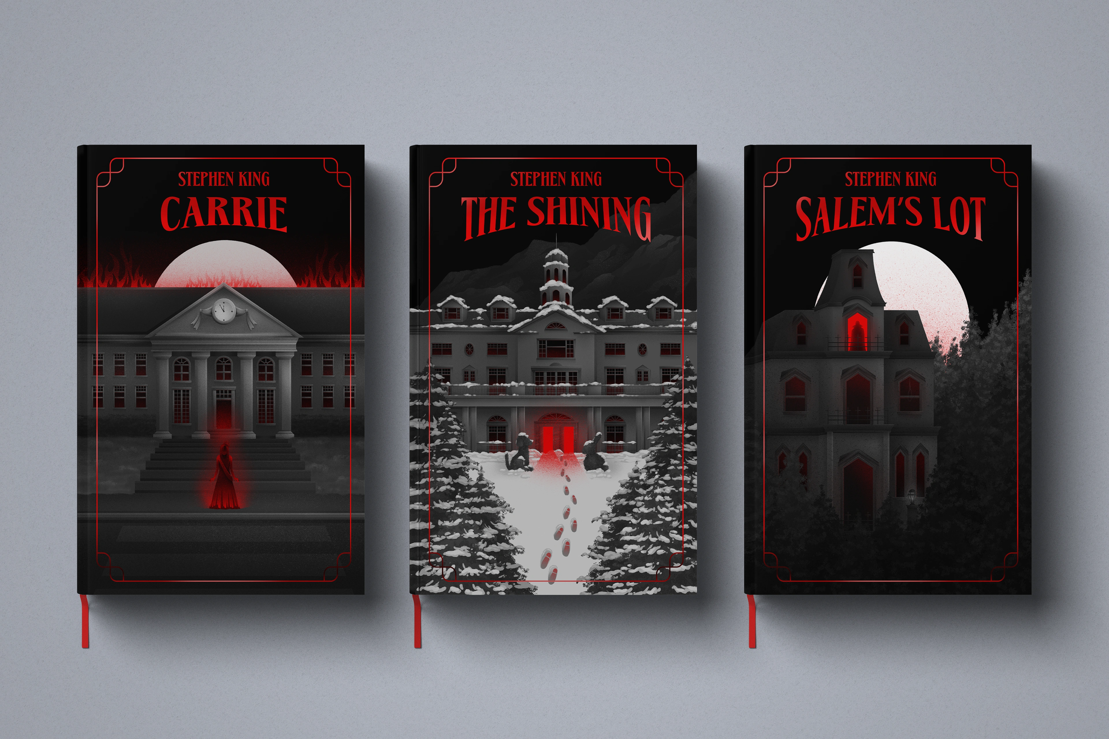 Illustrated book cover designs inspired by Stephen King classic novels Salem's Lot, Carrie and The Shining.