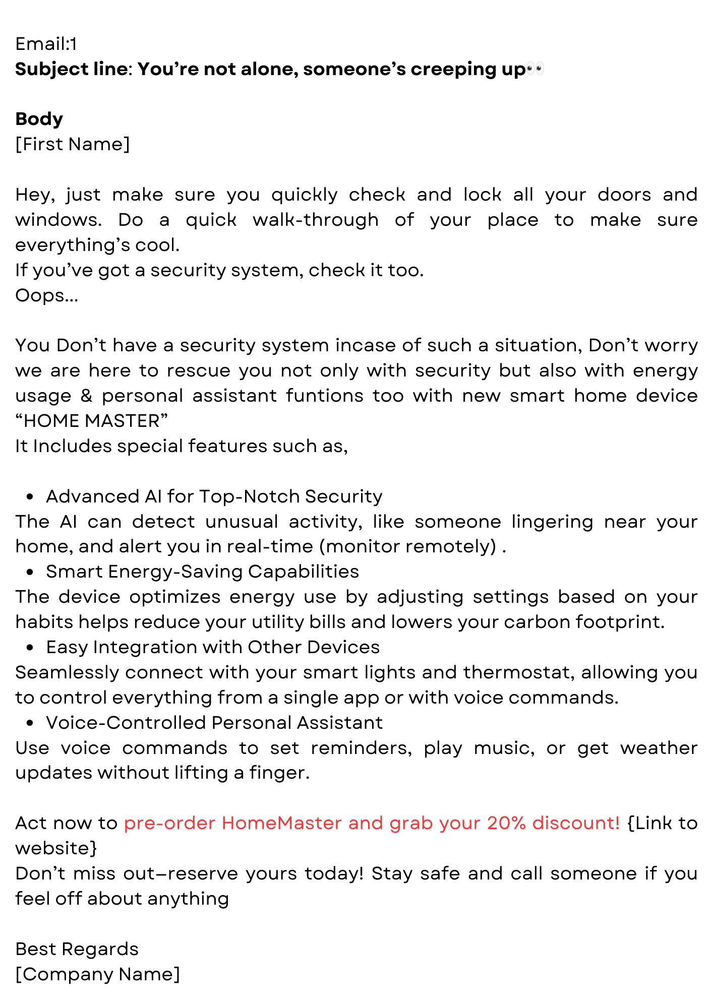 Objective: TechGenius is launching a new smart home device called "HomeMaster," which integrates AI to optimize home security, energy usage, and personal assistant functions. The goal of the email is to introduce the product, highlight its key features, and encourage recipients to pre-order with a special discount.