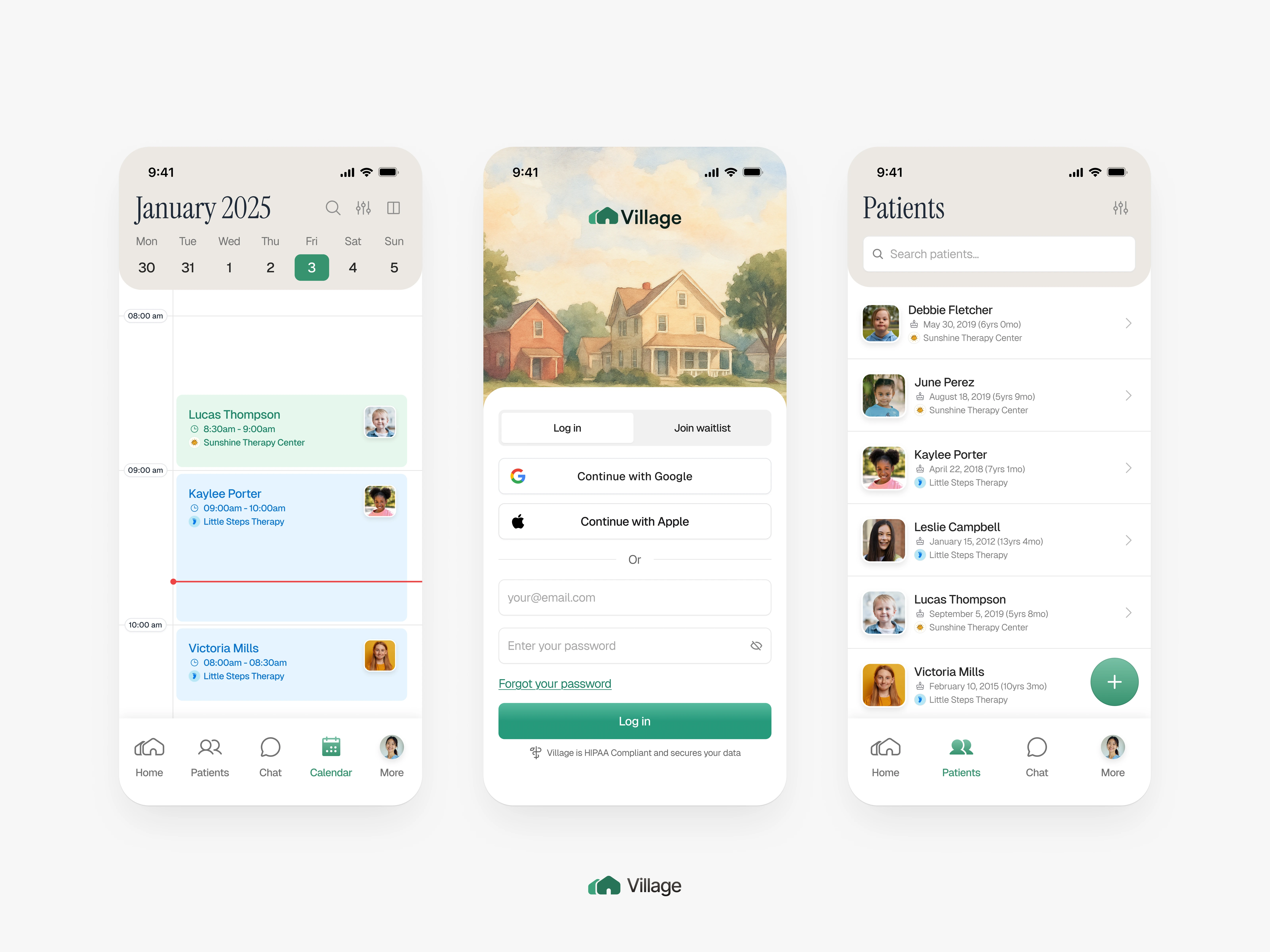 Brand, App design and desktop UI for Village, a leading SaaS tool for providers and families in Pediatric therapy