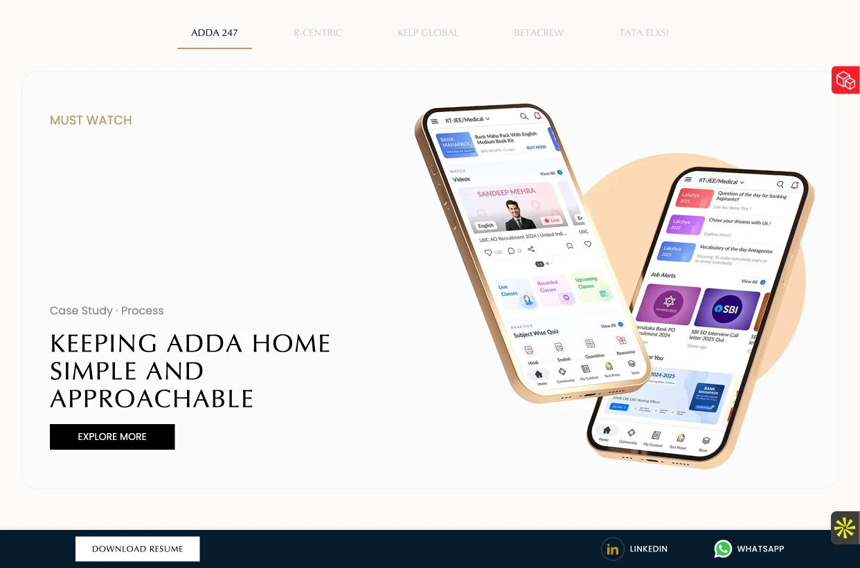 Redesigned Adda247 home from cluttered to value-drivn. UX audit, user research, information hierarchy. Rsults: increased engagement and test consumption.