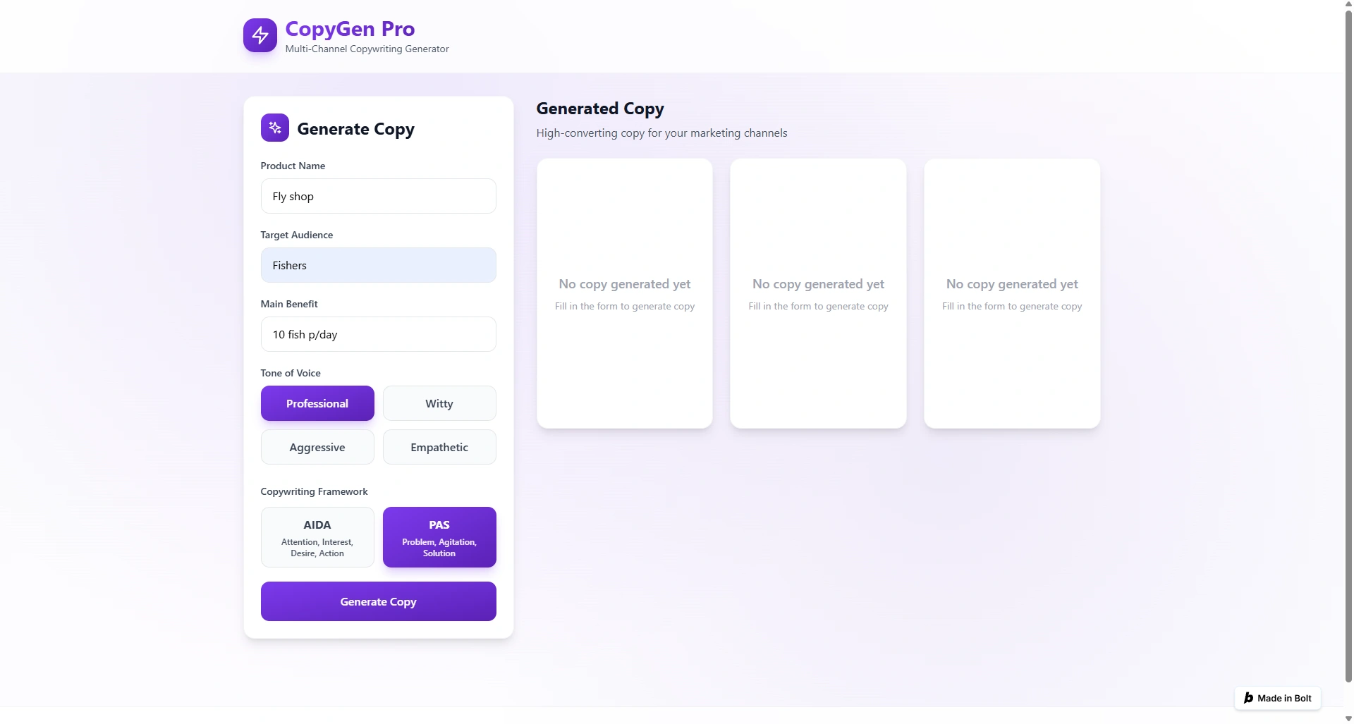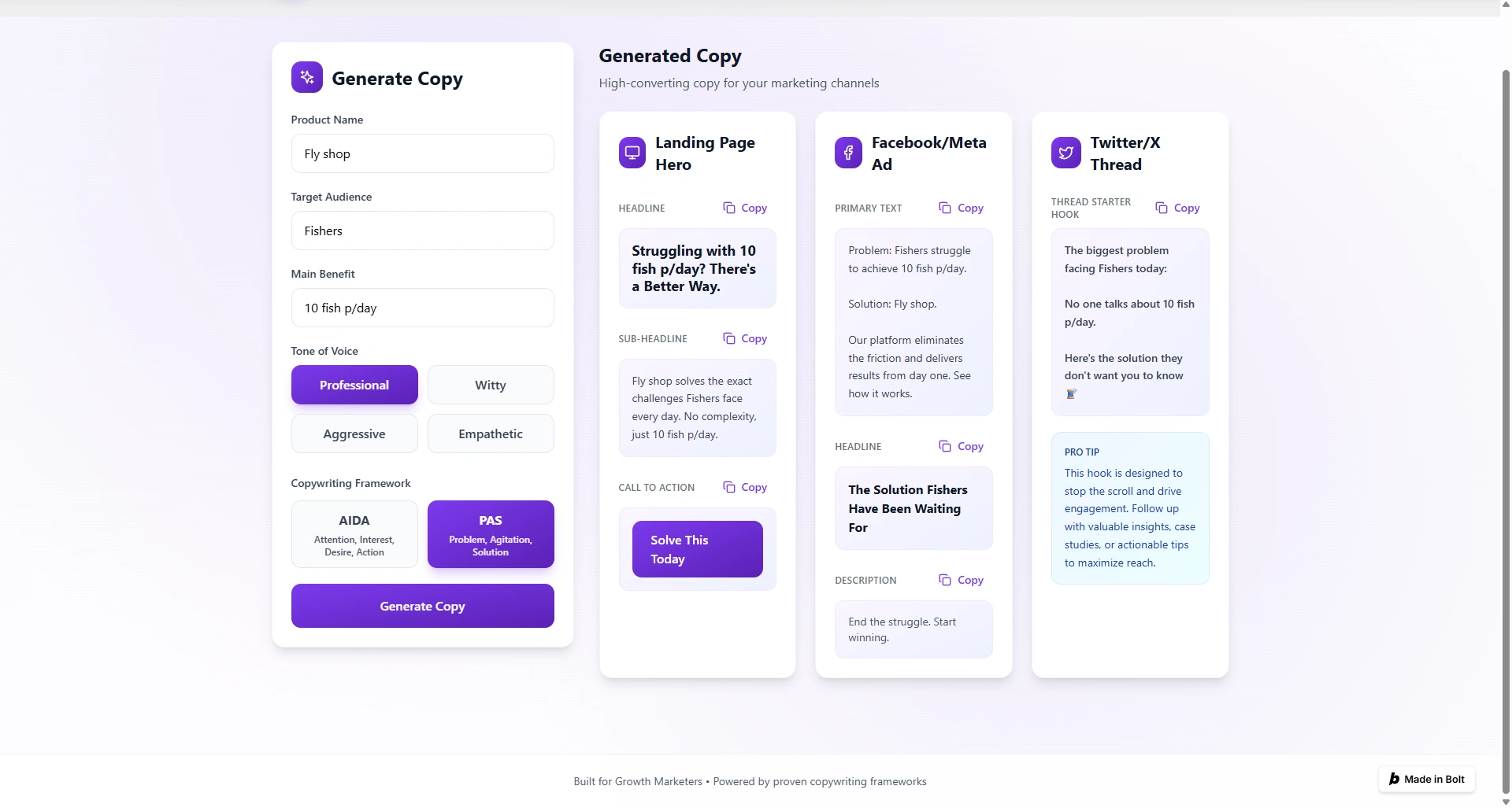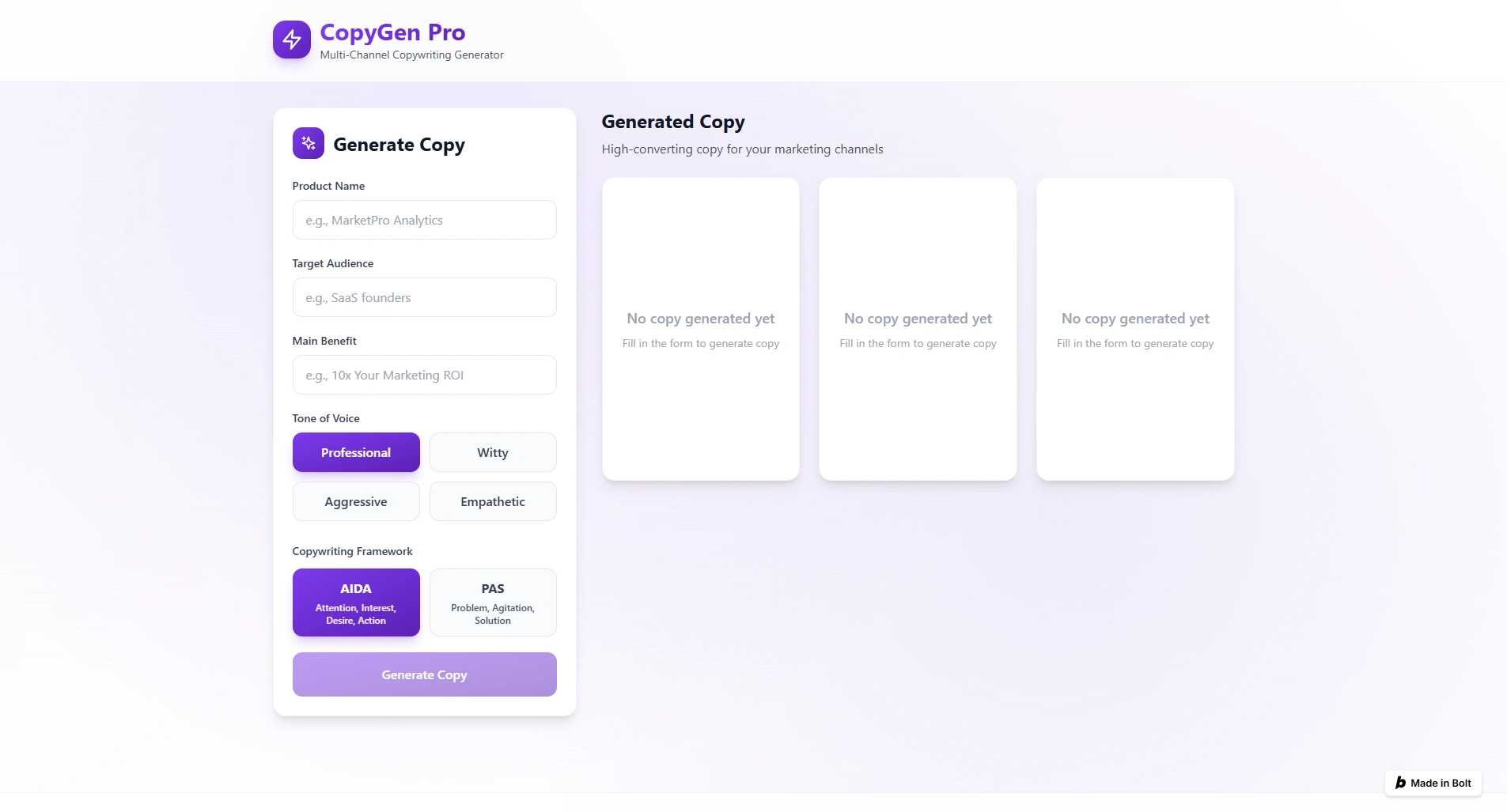 Multi-channel copy SaaS built on Bolt.new. Automating AIDA/PAS frameworks to scale creative growth workflows and maximize conversion rates.