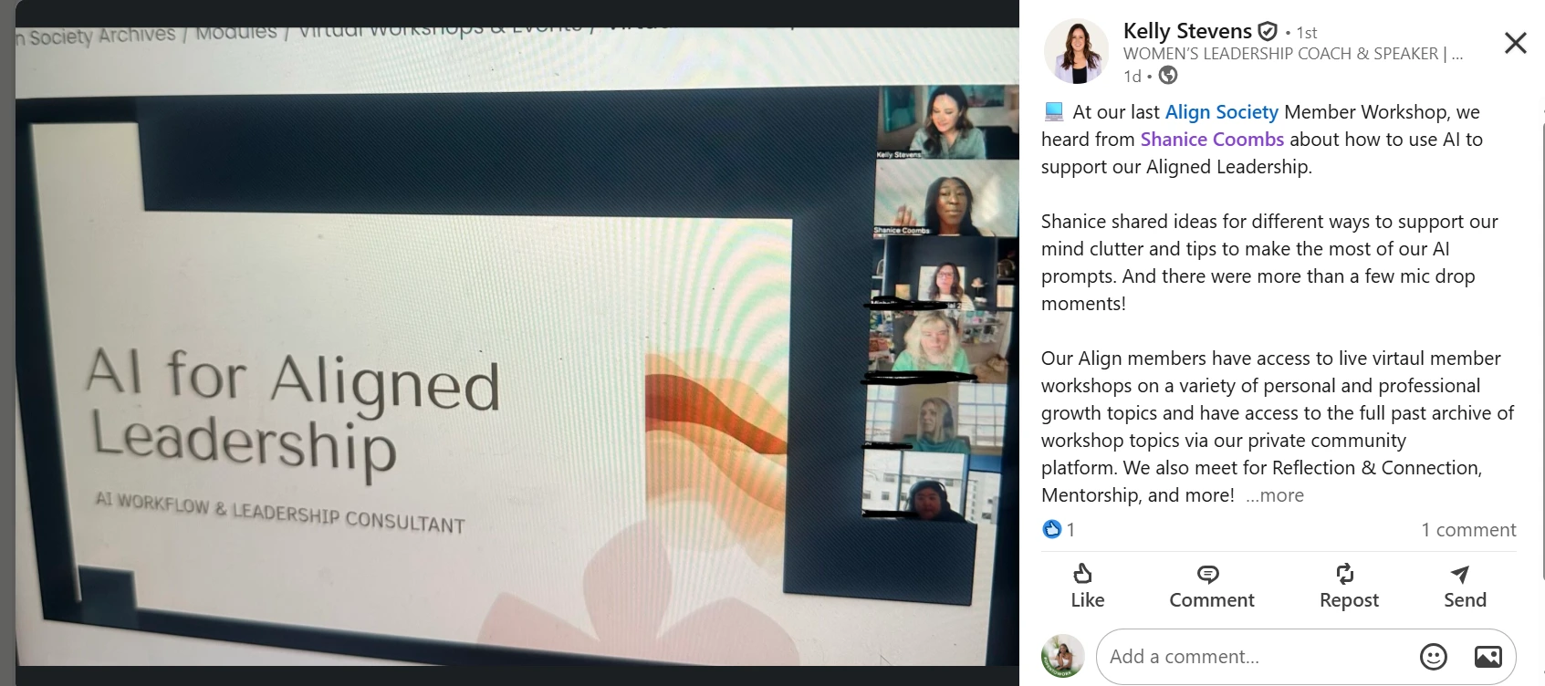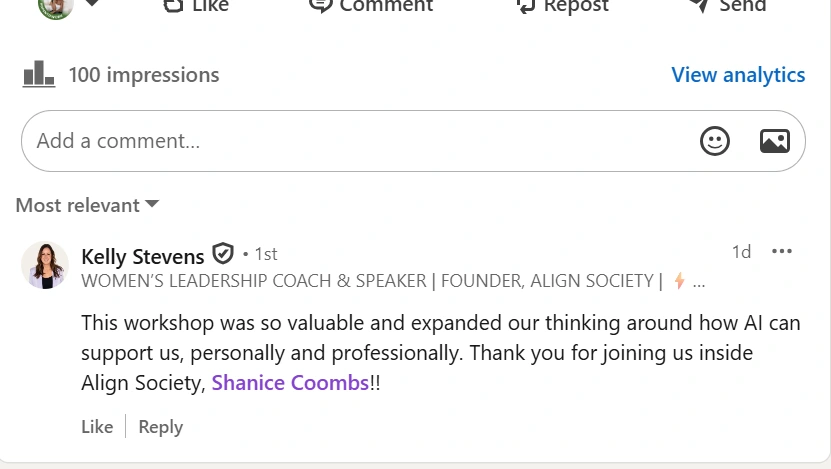 Shanice led a workshop on AI for Aligned Leadership for our community of women leaders. Shanice was professional and easy to coordinate with, and the workshop was incredibly valuable. Her presentation expanded our perspective on how AI can support us as leaders, both personally and professionally, and Shanice provided tips and resources that were immediately applicable. We'd welcome Shanice back anytime!Â