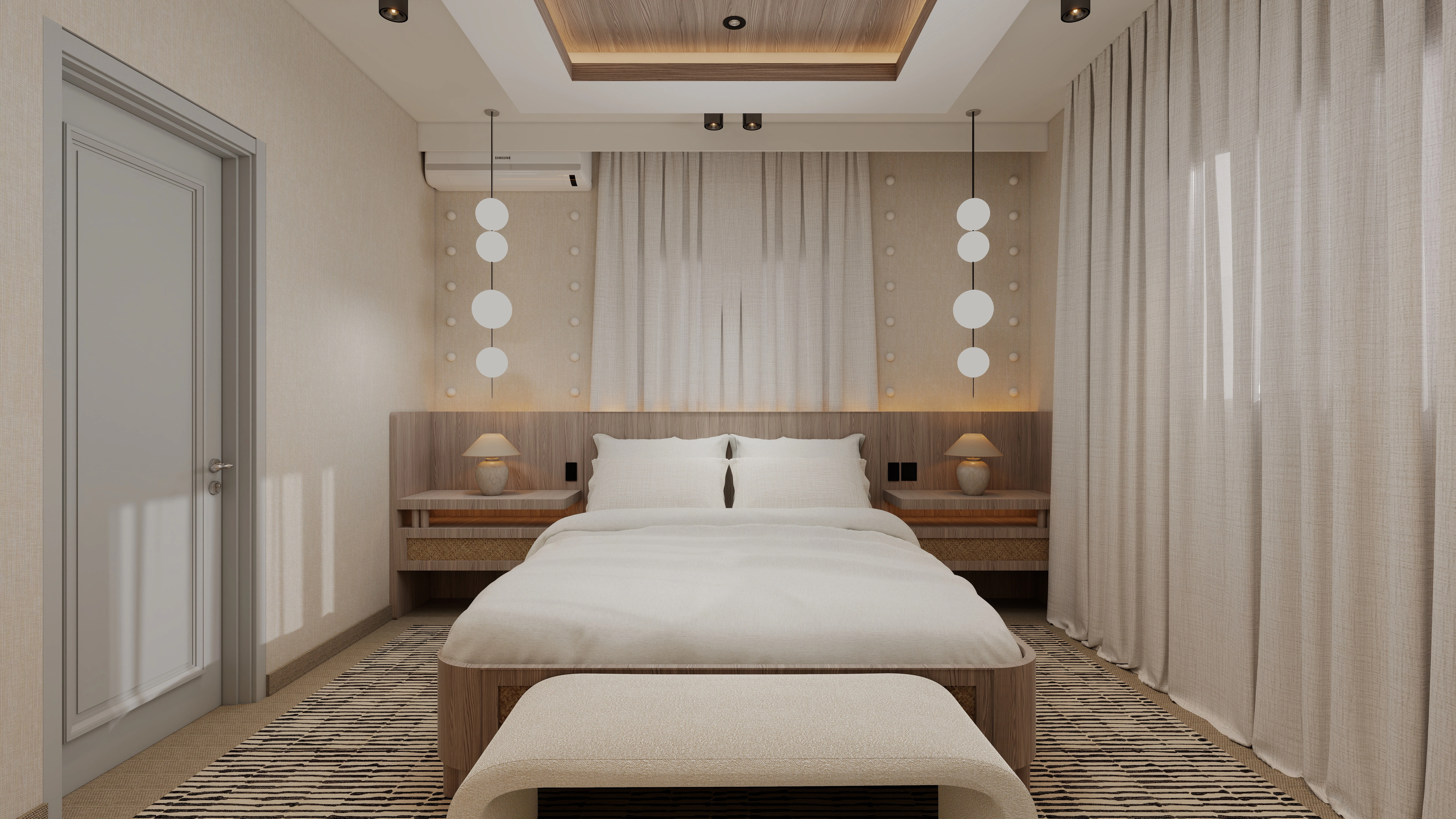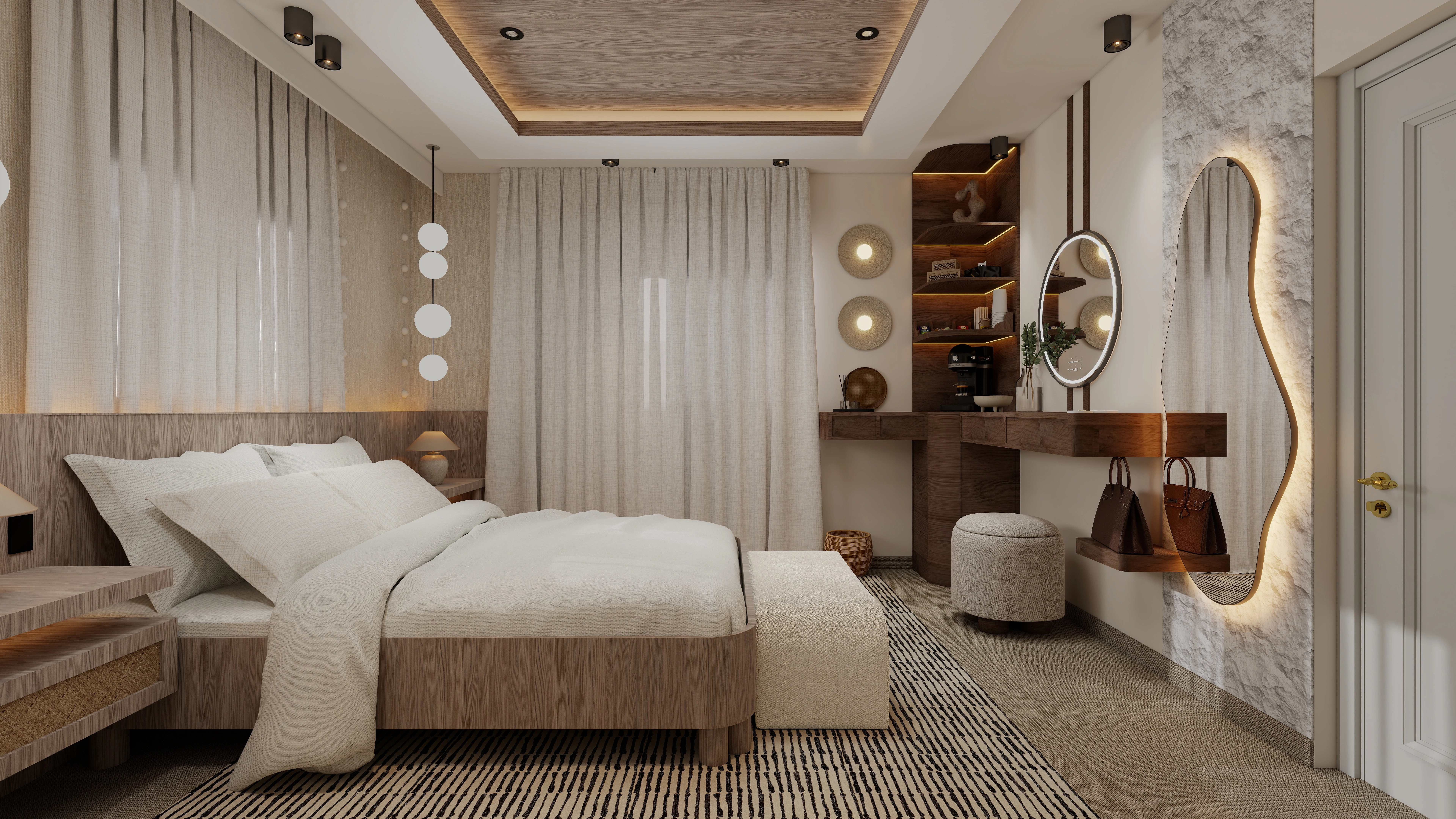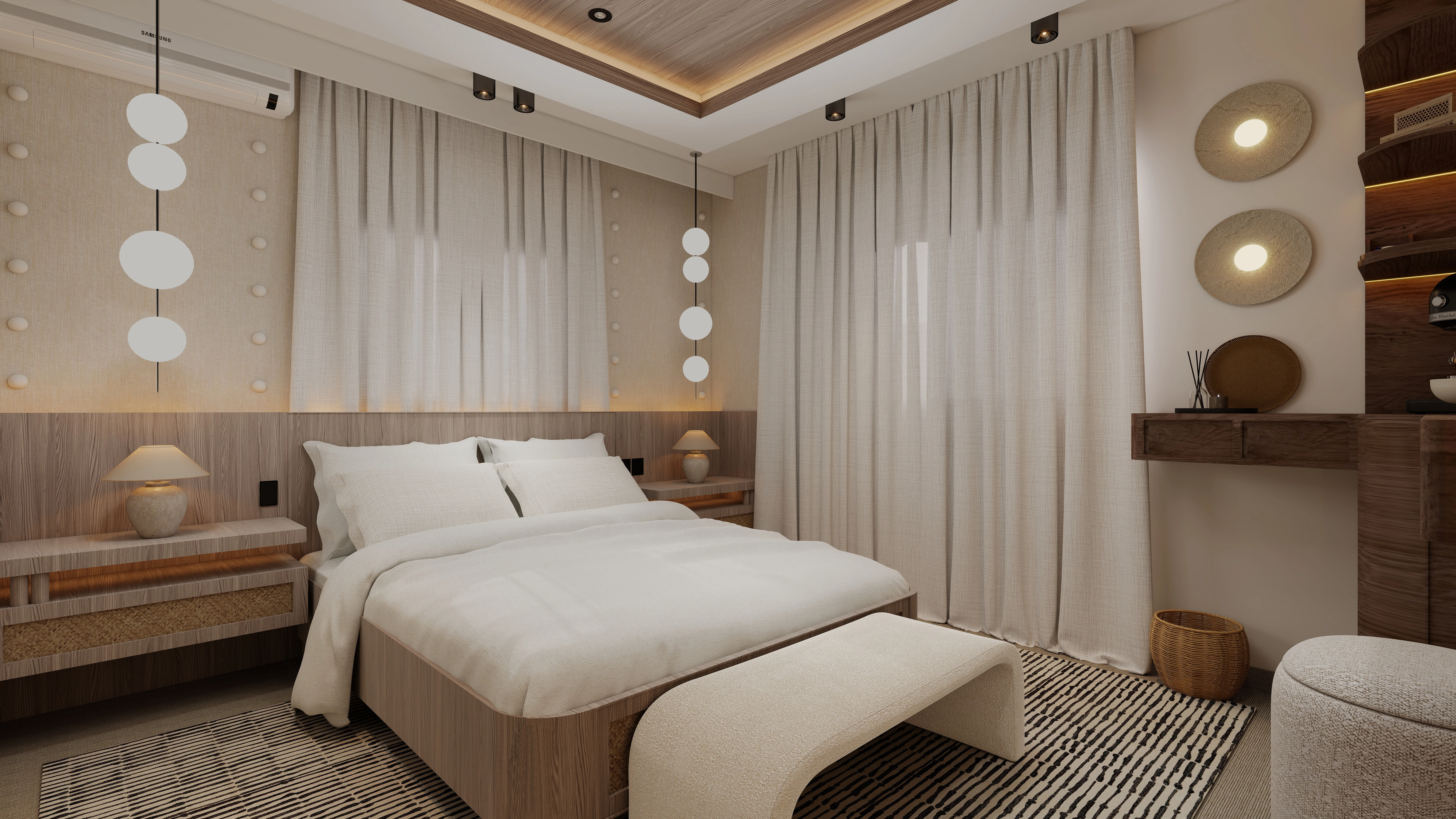 A masterclass in tailored minimalism. I specifically designed the bespoke floating bed and integrated nightstand system for this project, focusing on seamless joinery and the tactile warmth of natural wood. Inspired by Japandi aesthetics, this sanctuary layers custom-made furniture with organic textures like bouclé and rattan. Every piece, from the sculptural headboard to the strategic lighting, was crafted to create a multisensory experience of architectural calm.