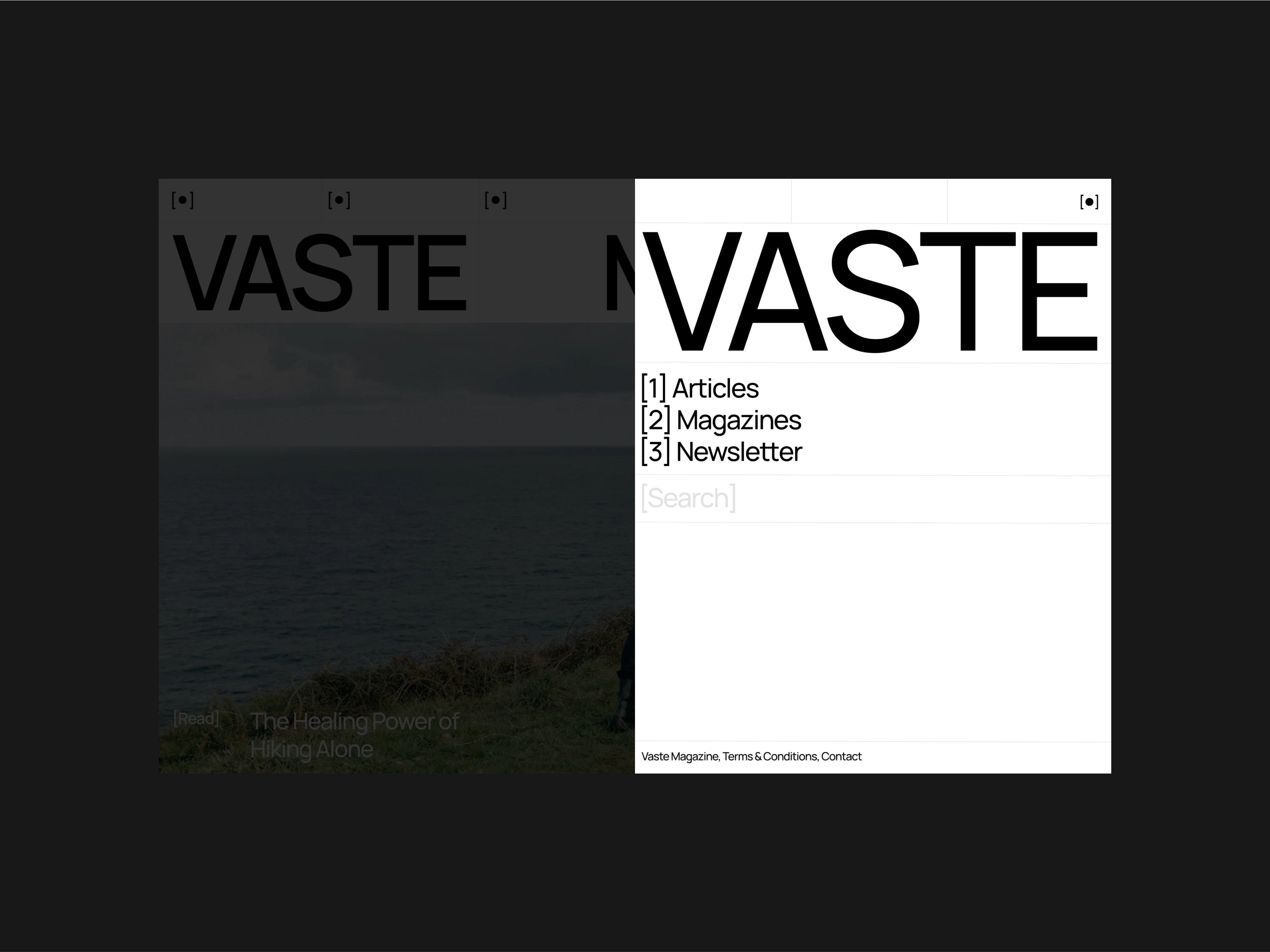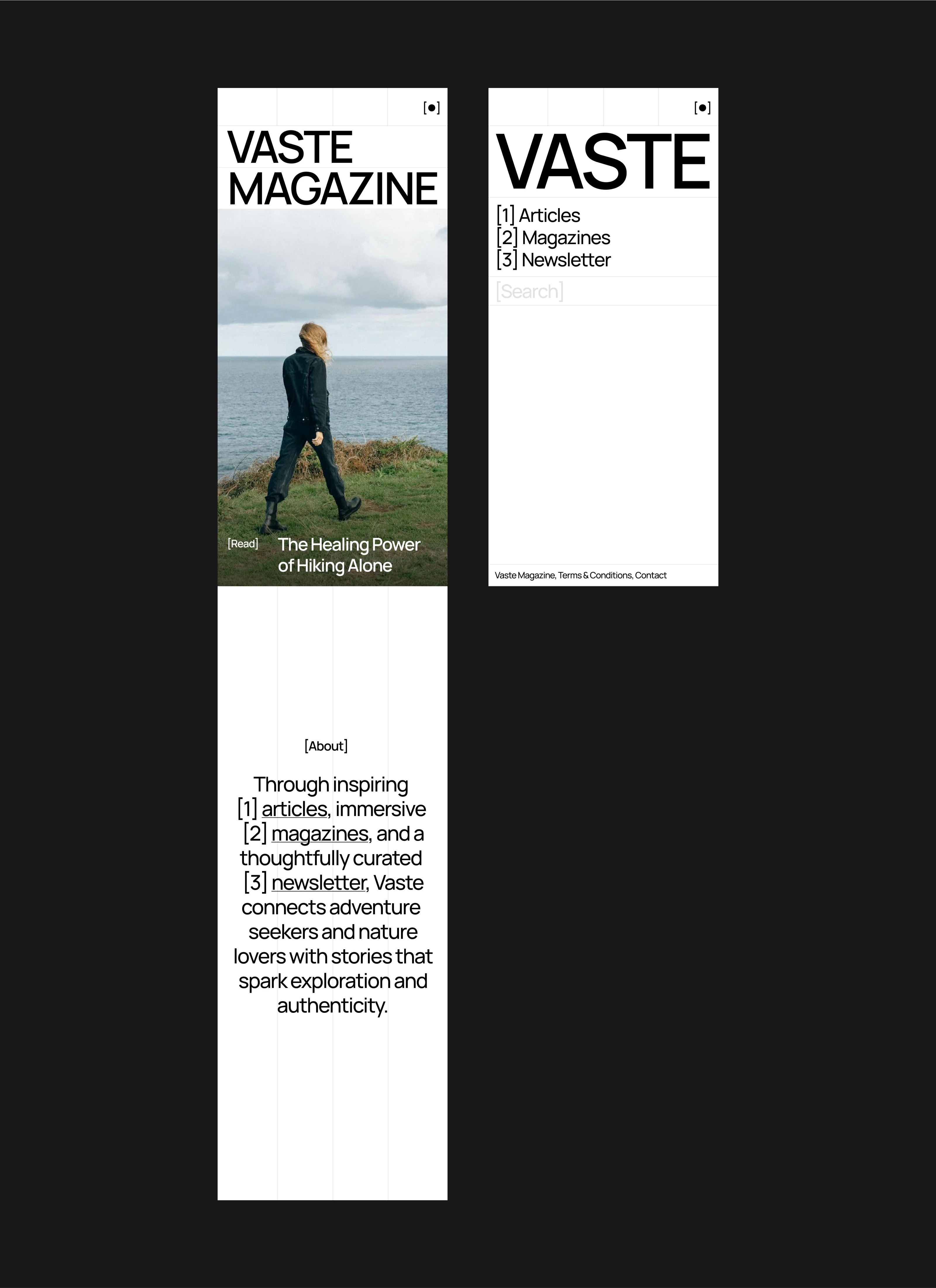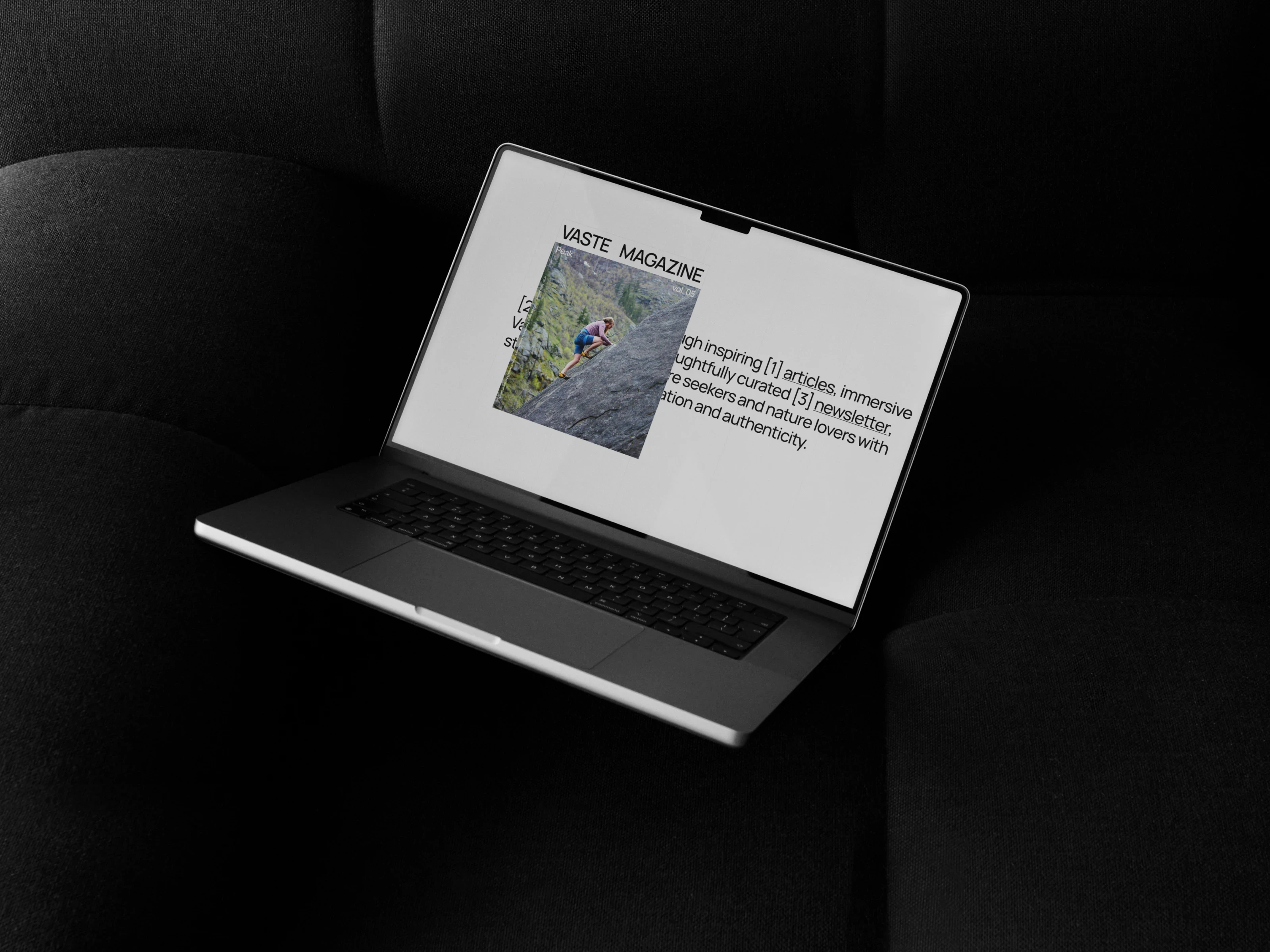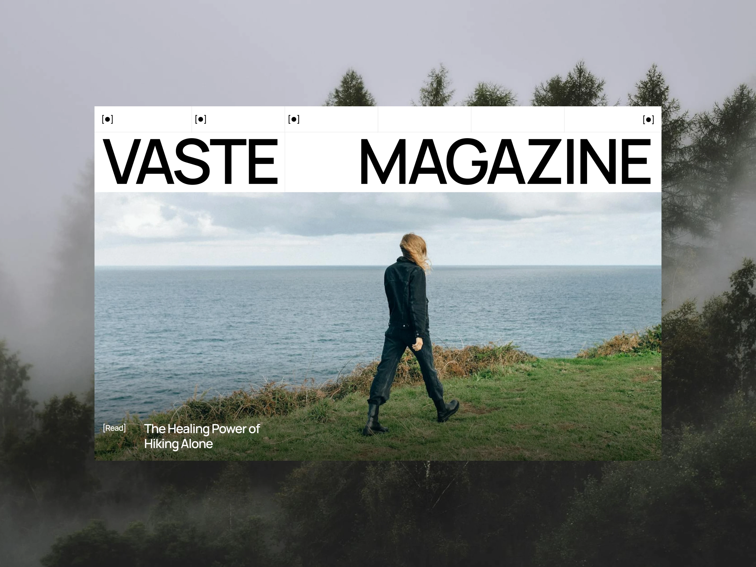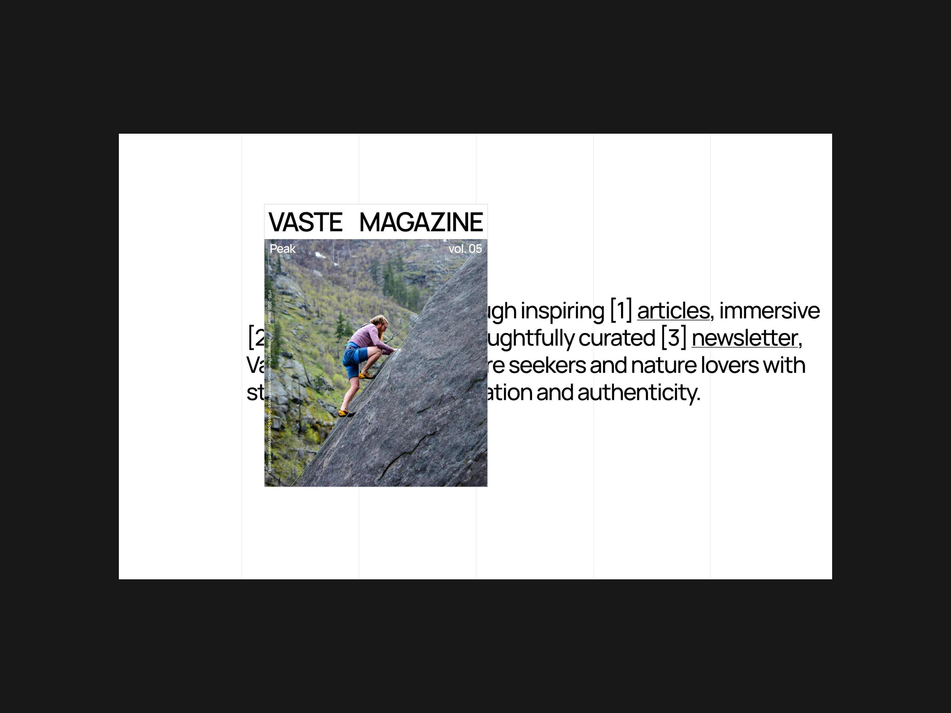 The Vaste Magazine website embodies a raw and minimalist aesthetic, echoing the spirit of outdoor exploration. The design is rooted in a monochrome palette, allowing the imagery to take center stage, while a structured grid layout evokes the essence of print magazines. Brackets are used as a metaphor for time set aside, creating a poetic pause. Interactive animations enhance the experience, with brackets opening to reveal content on hover, sticky titles that add dynamism, and a footer that unfolds as you scroll. The result is an immersive and exploratory digital experience, inviting users to wander through Vaste Magazine.
