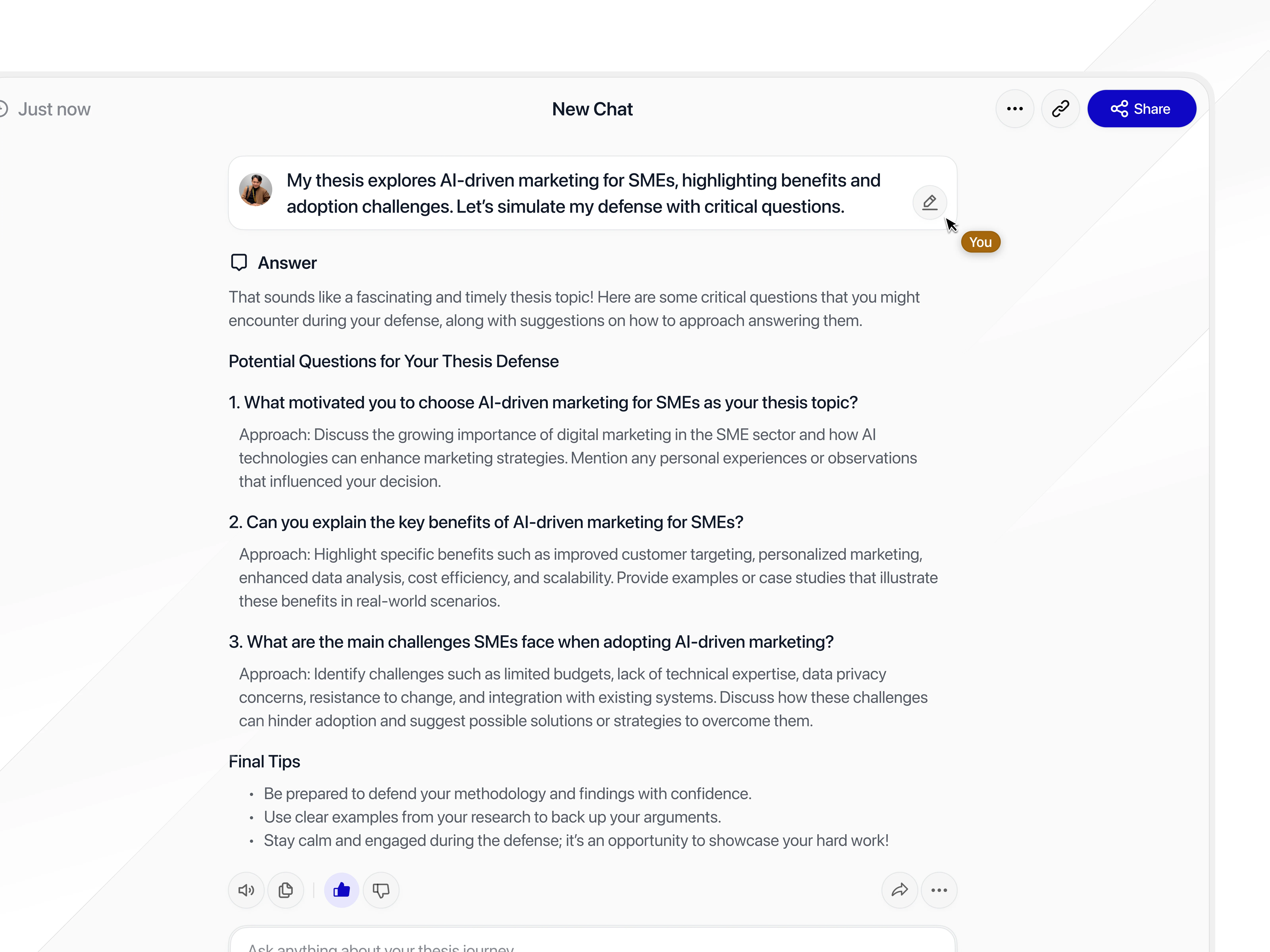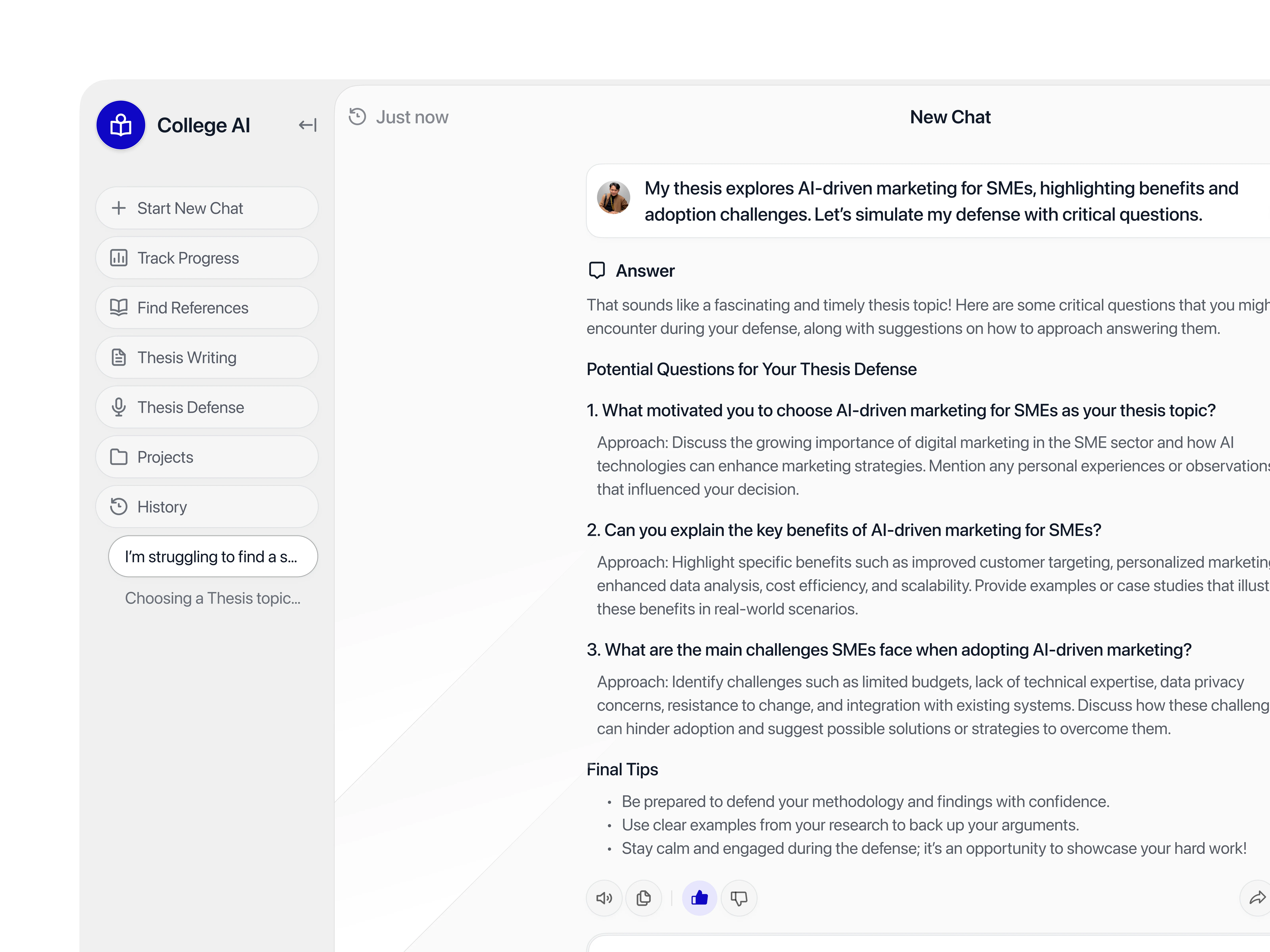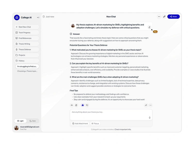 This is an improved version of my previous design, showcasing the conversation interface when students start interacting with the AI. The assistant is designed to guide students through every stage of their thesis journey—from brainstorming research topics to preparing for their final defense.