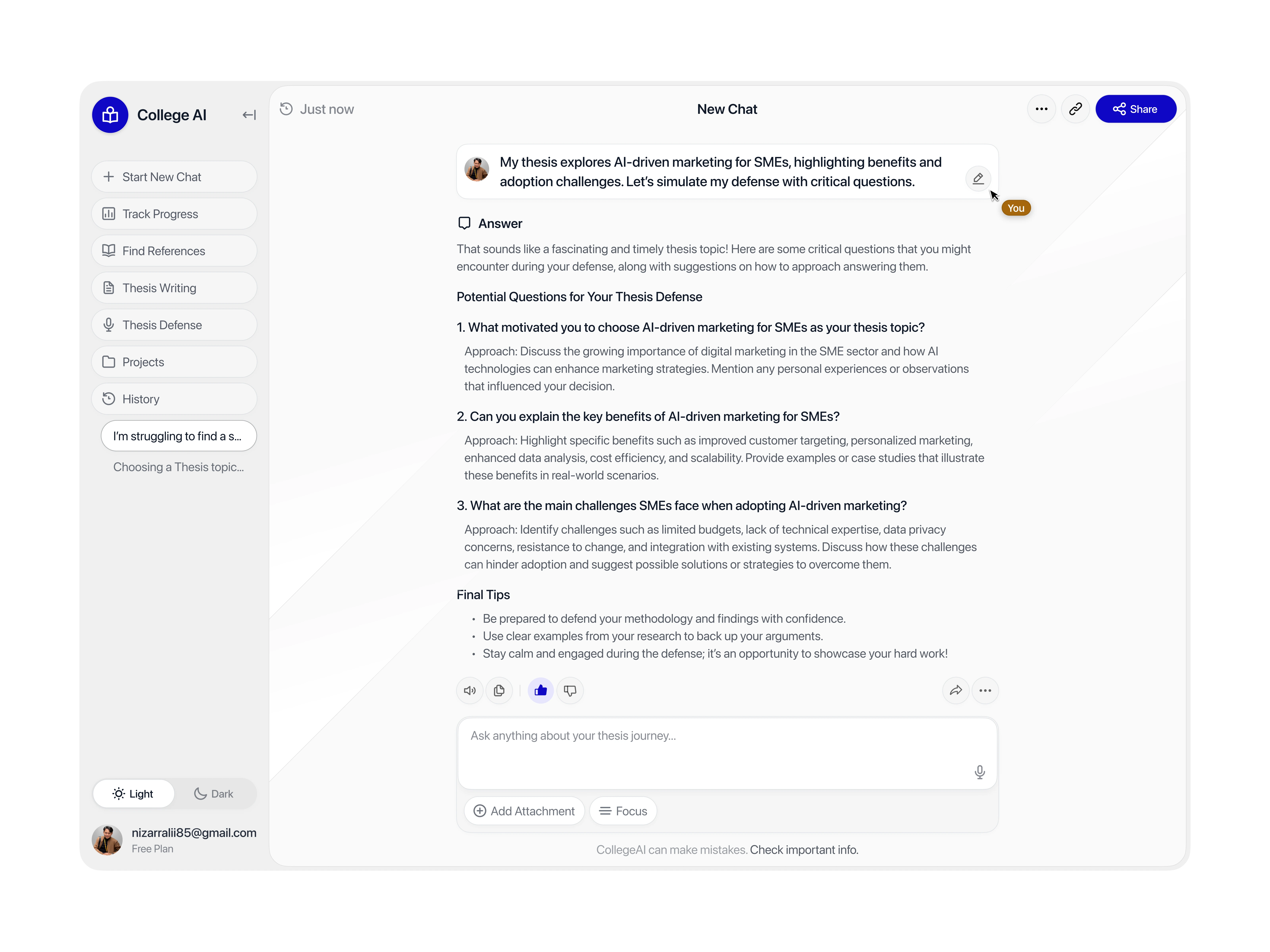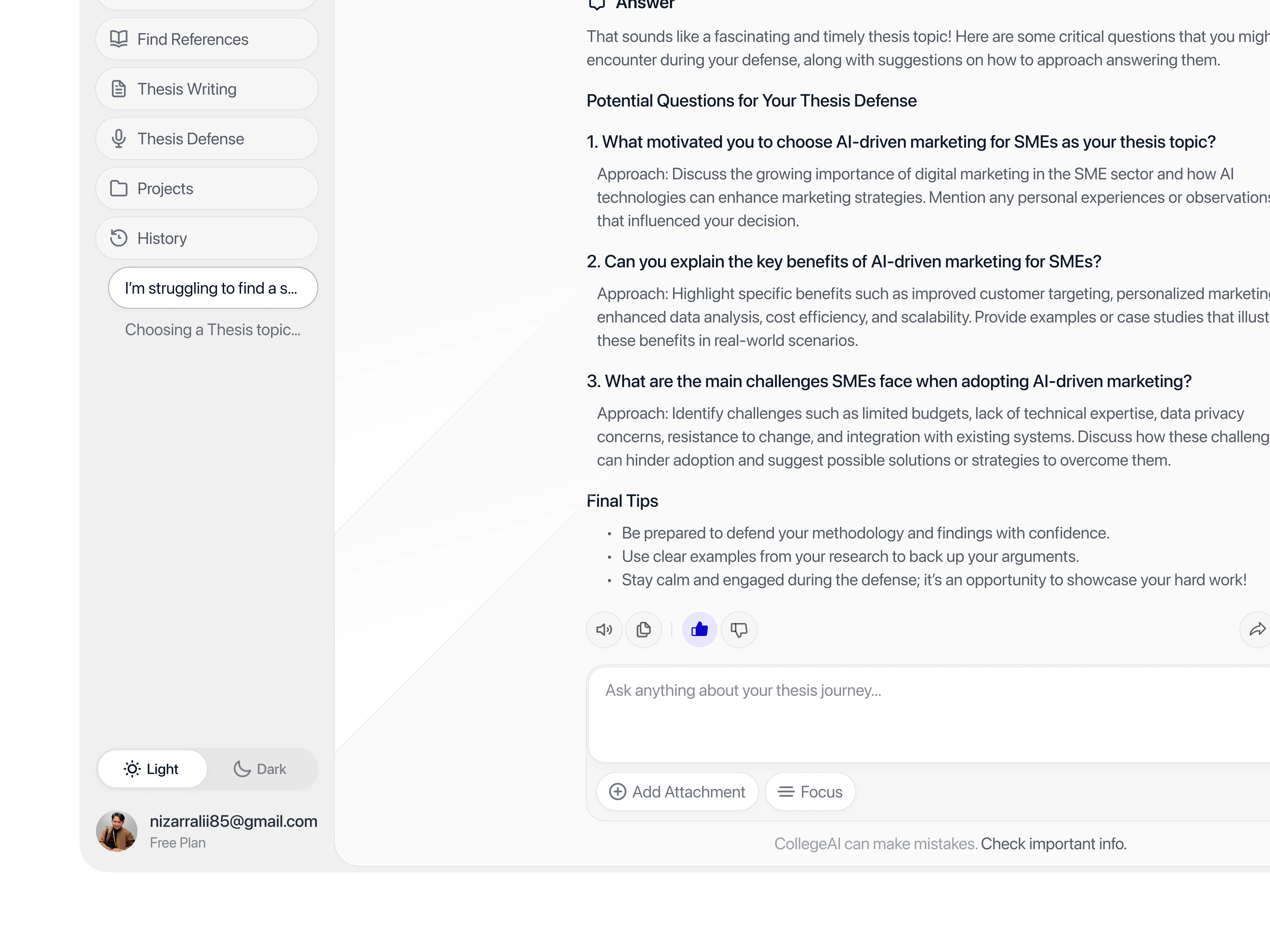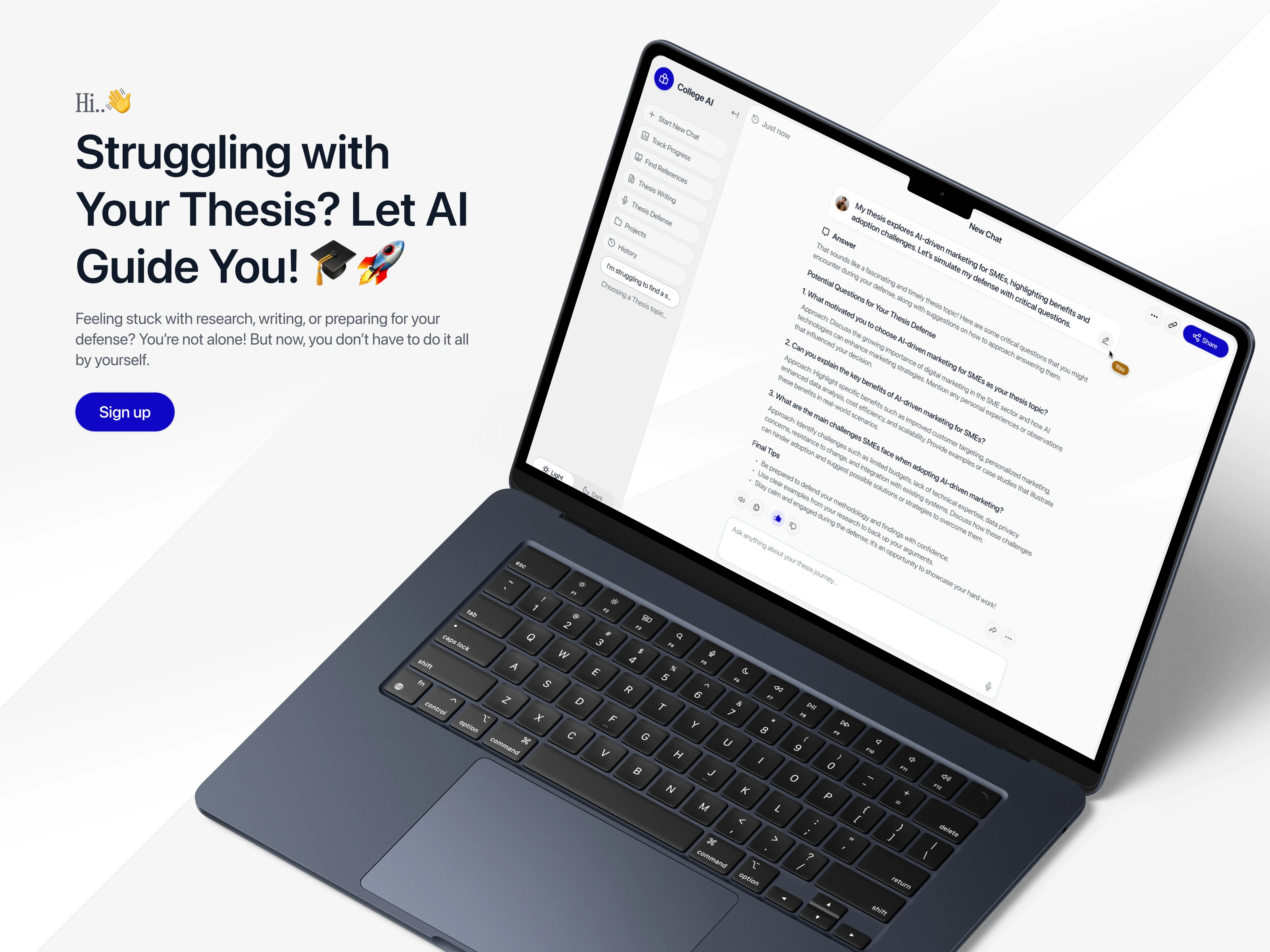 This is an improved version of my previous design, showcasing the conversation interface when students start interacting with the AI. The assistant is designed to guide students through every stage of their thesis journey—from brainstorming research topics to preparing for their final defense.