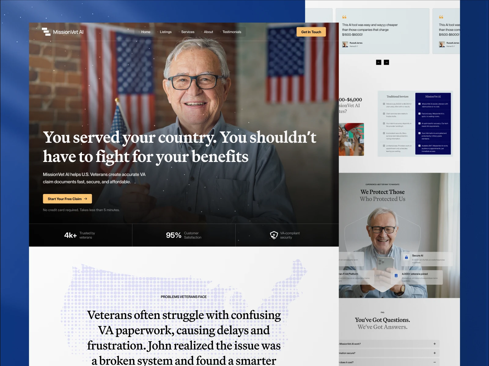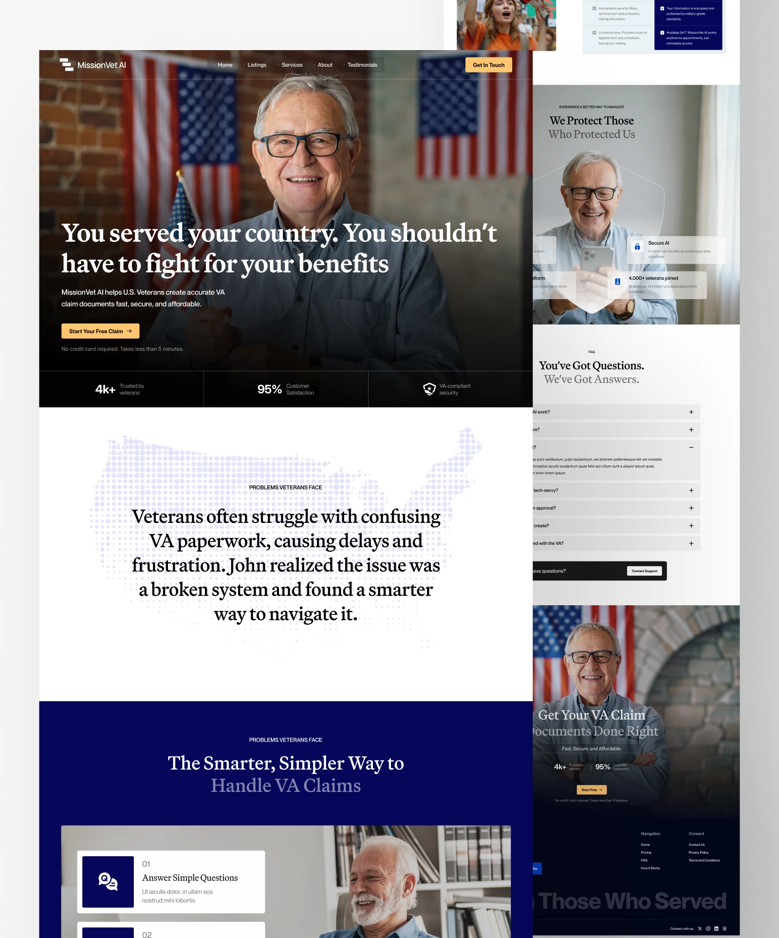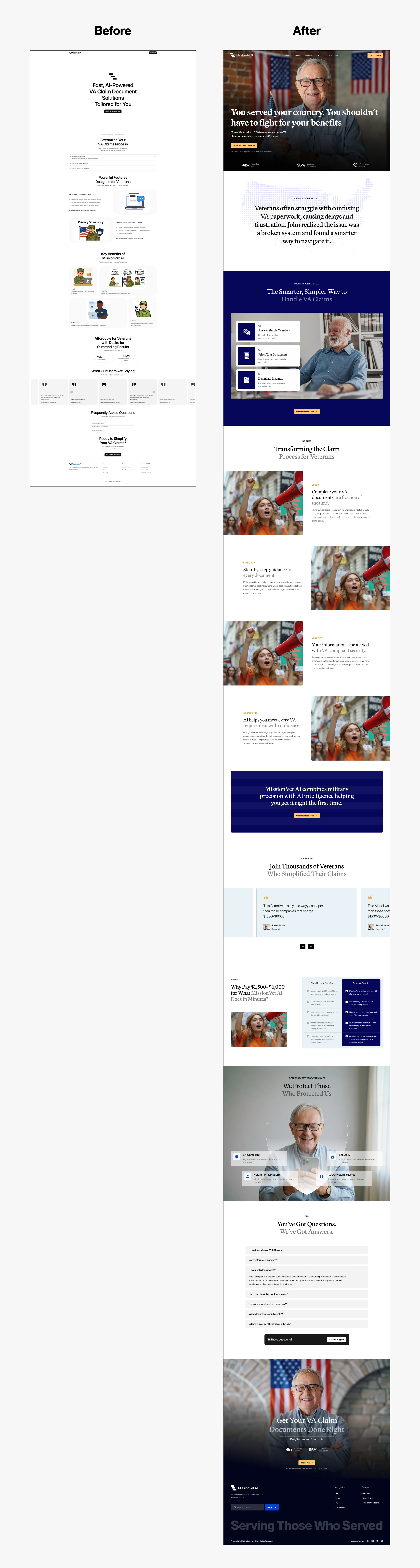 MissionVet AI helps U.S. veterans prepare and submit VA claim documents using AI-driven tools. While their technology was powerful, the website lacked emotional resonance and user clarity. Veterans — often navigating stressful claim processes — needed reassurance, not just features. The challenge was to create a conversion-driven site that communicates speed and simplicity while building trust through accessible design and clear storytelling.