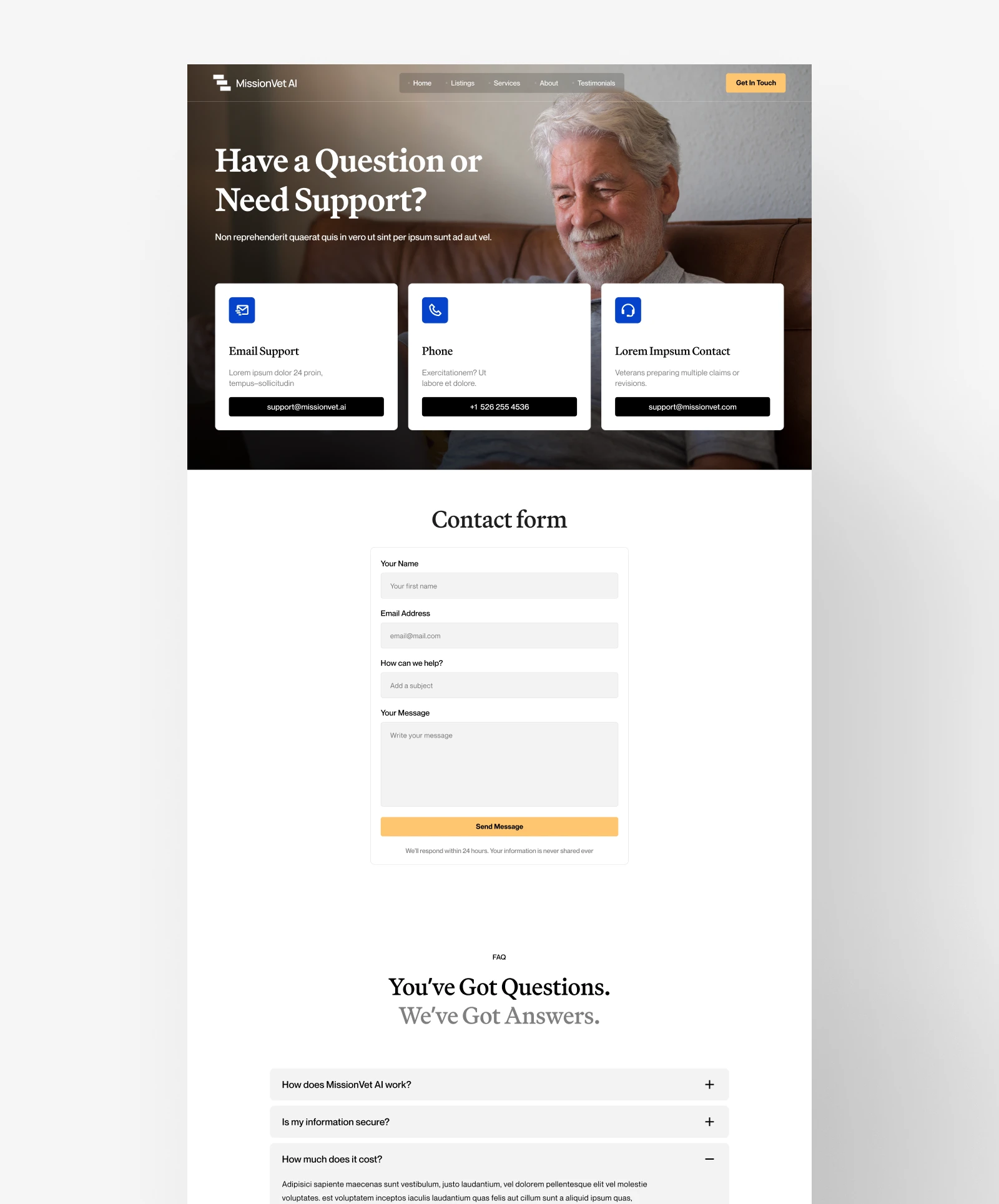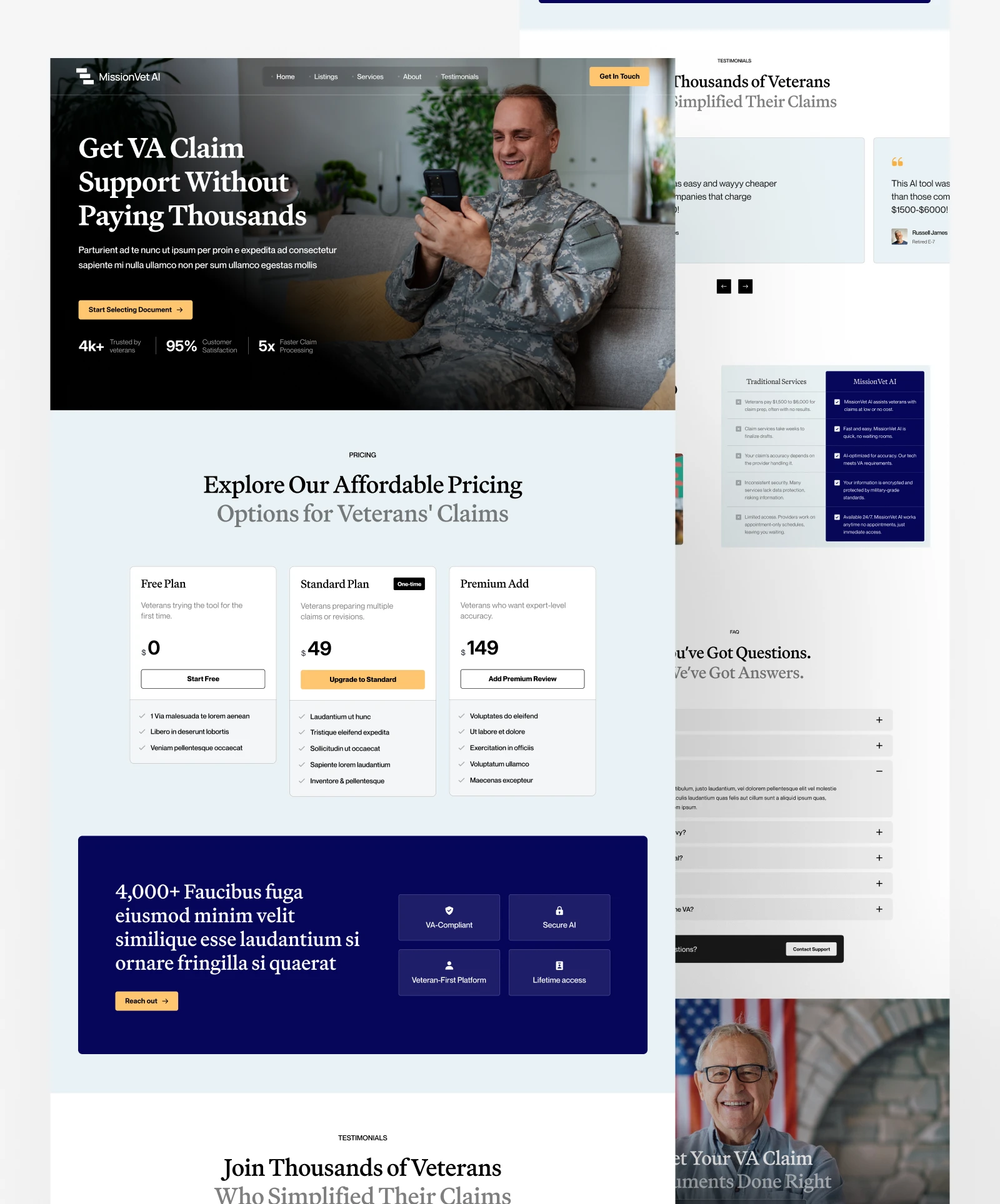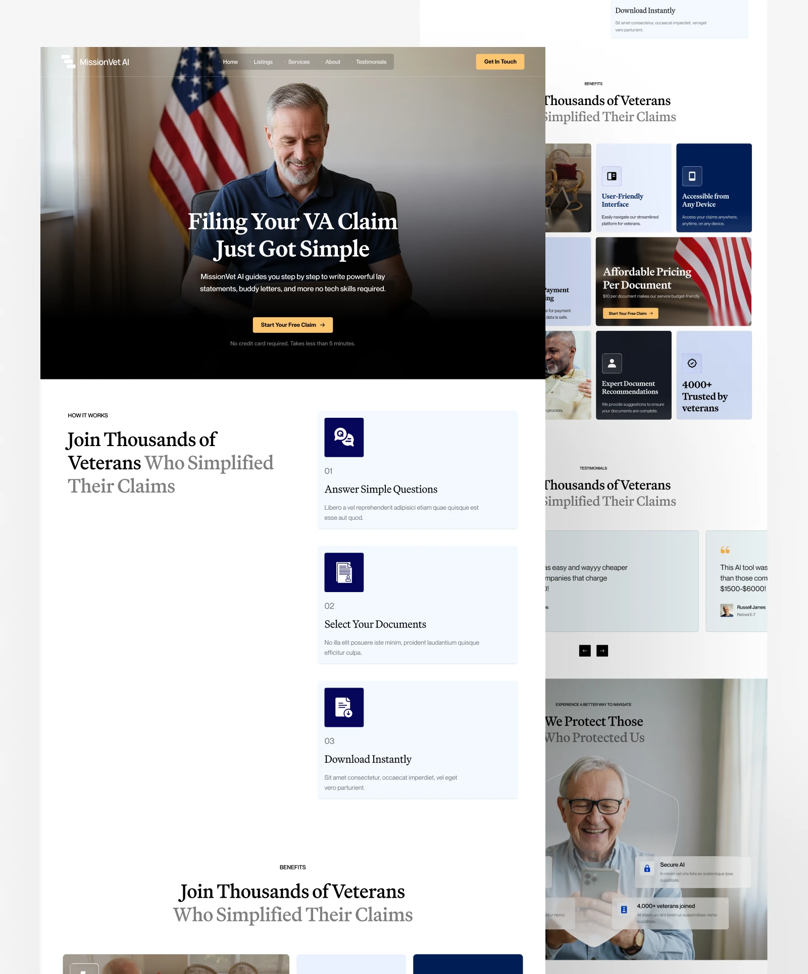MissionVet AI helps U.S. veterans prepare and submit VA claim documents using AI-driven tools. While their technology was powerful, the website lacked emotional resonance and user clarity. Veterans — often navigating stressful claim processes — needed reassurance, not just features. The challenge was to create a conversion-driven site that communicates speed and simplicity while building trust through accessible design and clear storytelling.