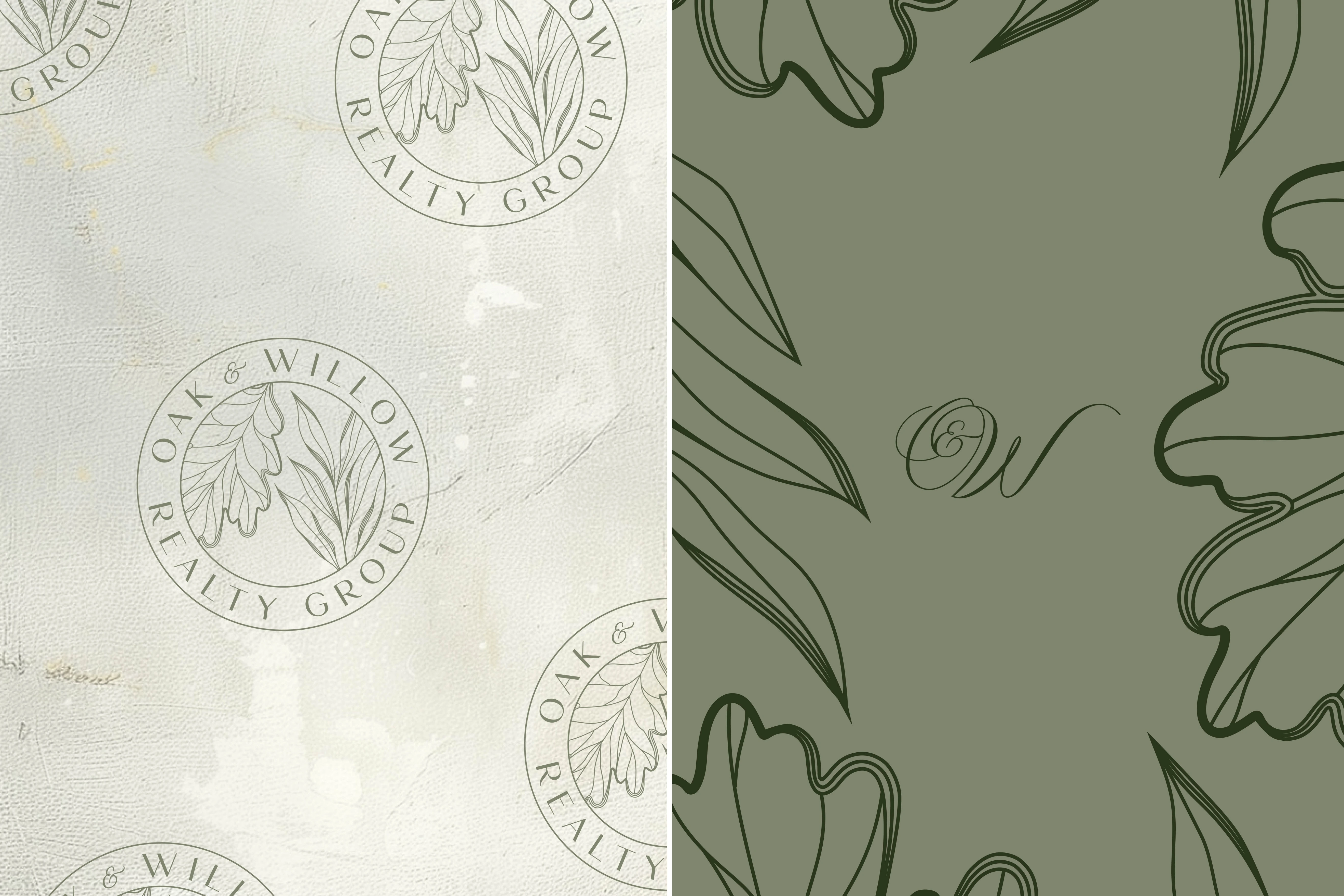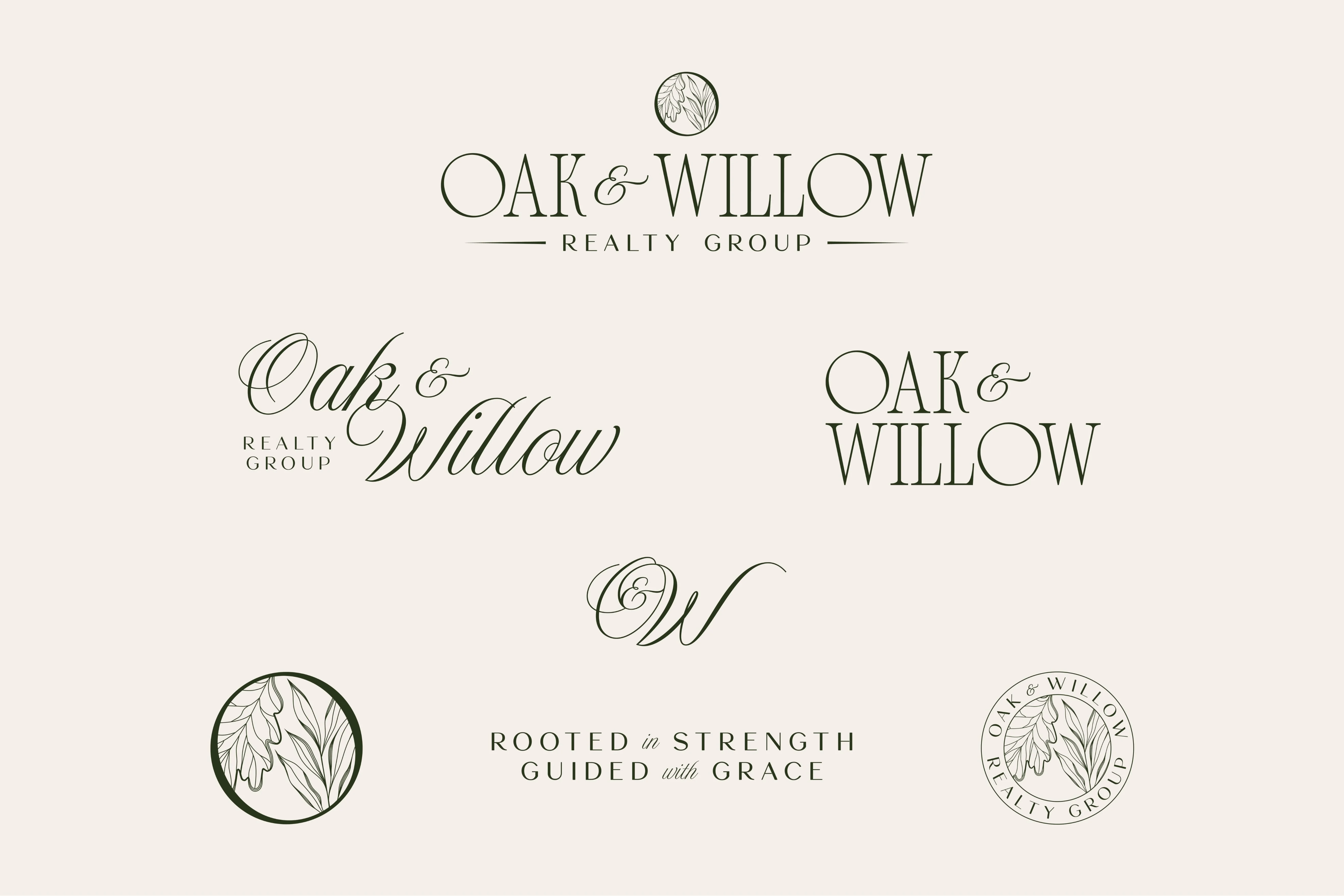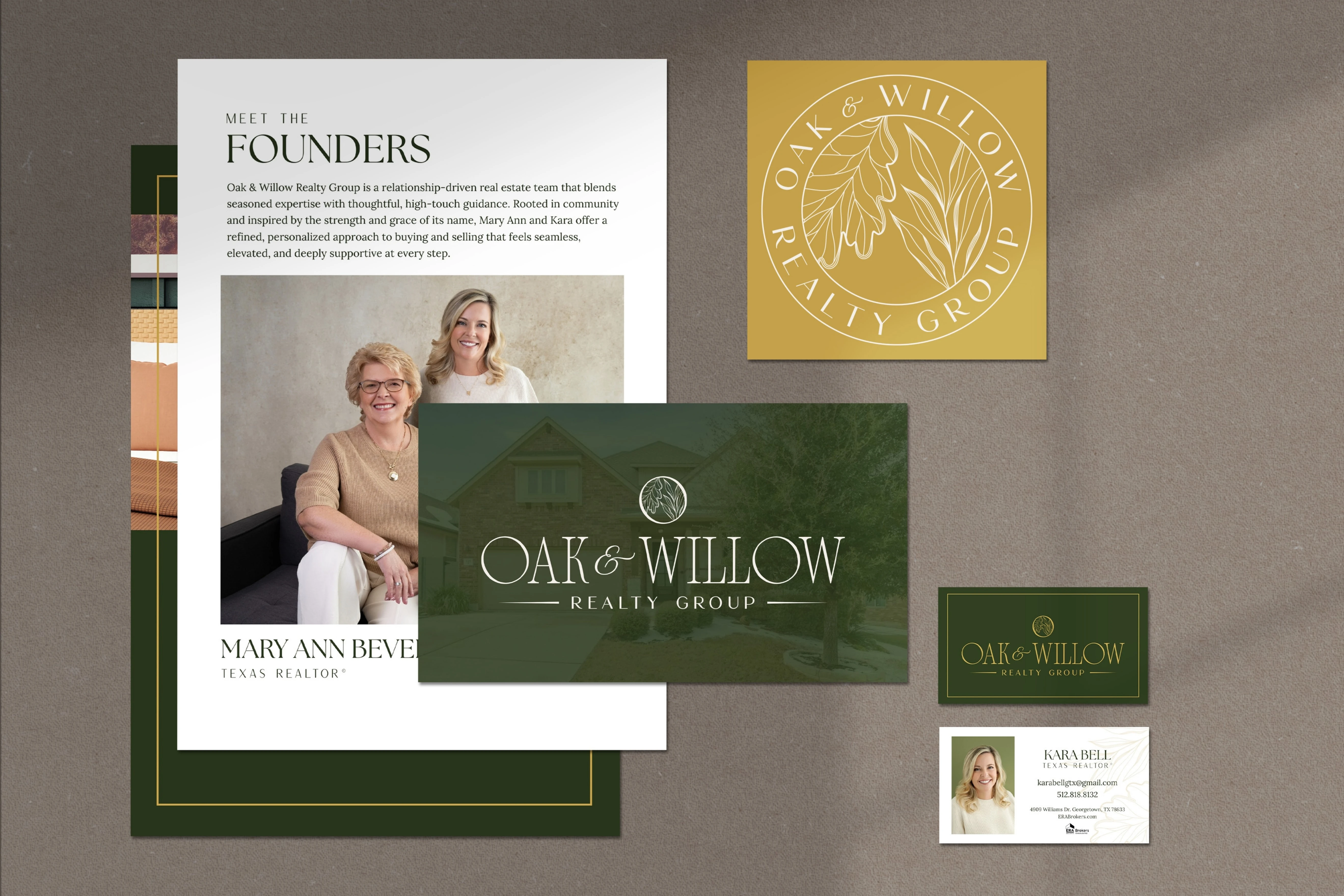I translated this insight into a luxury-inspired visual system rooted in nature and refined professionalism. Deep forest greens, soft neutrals, and warm gold accents were chosen to reflect trust, sophistication, and the Texas landscape. Elegant serif typography, custom botanical illustrations of oak and willow leaves, and timeless print pieces such as postcards and business cards helped bring the symbolism to life. Every design decision was made to create a brand that feels rooted in community, elevated in presentation, and deeply personal in its client experience.