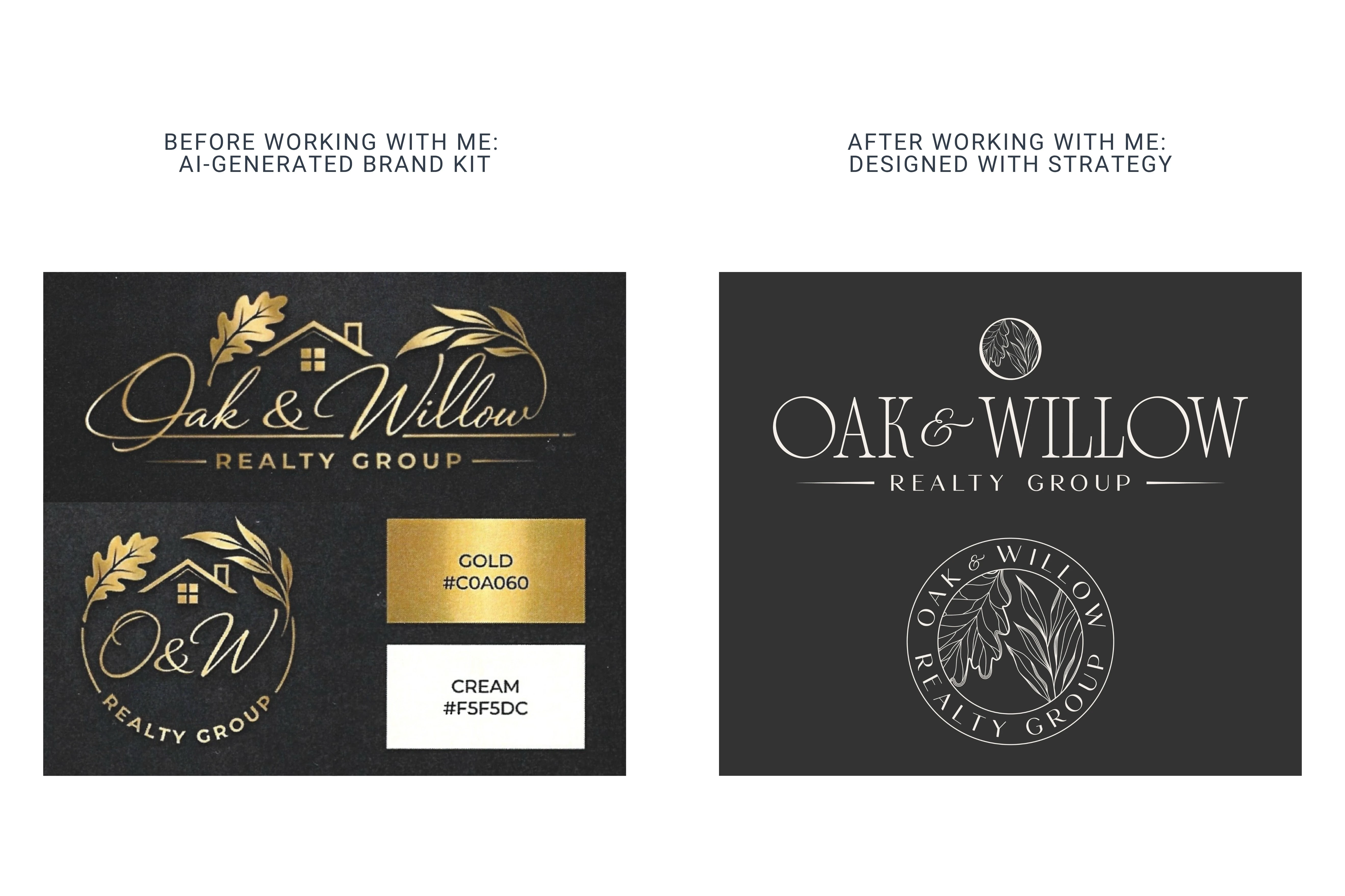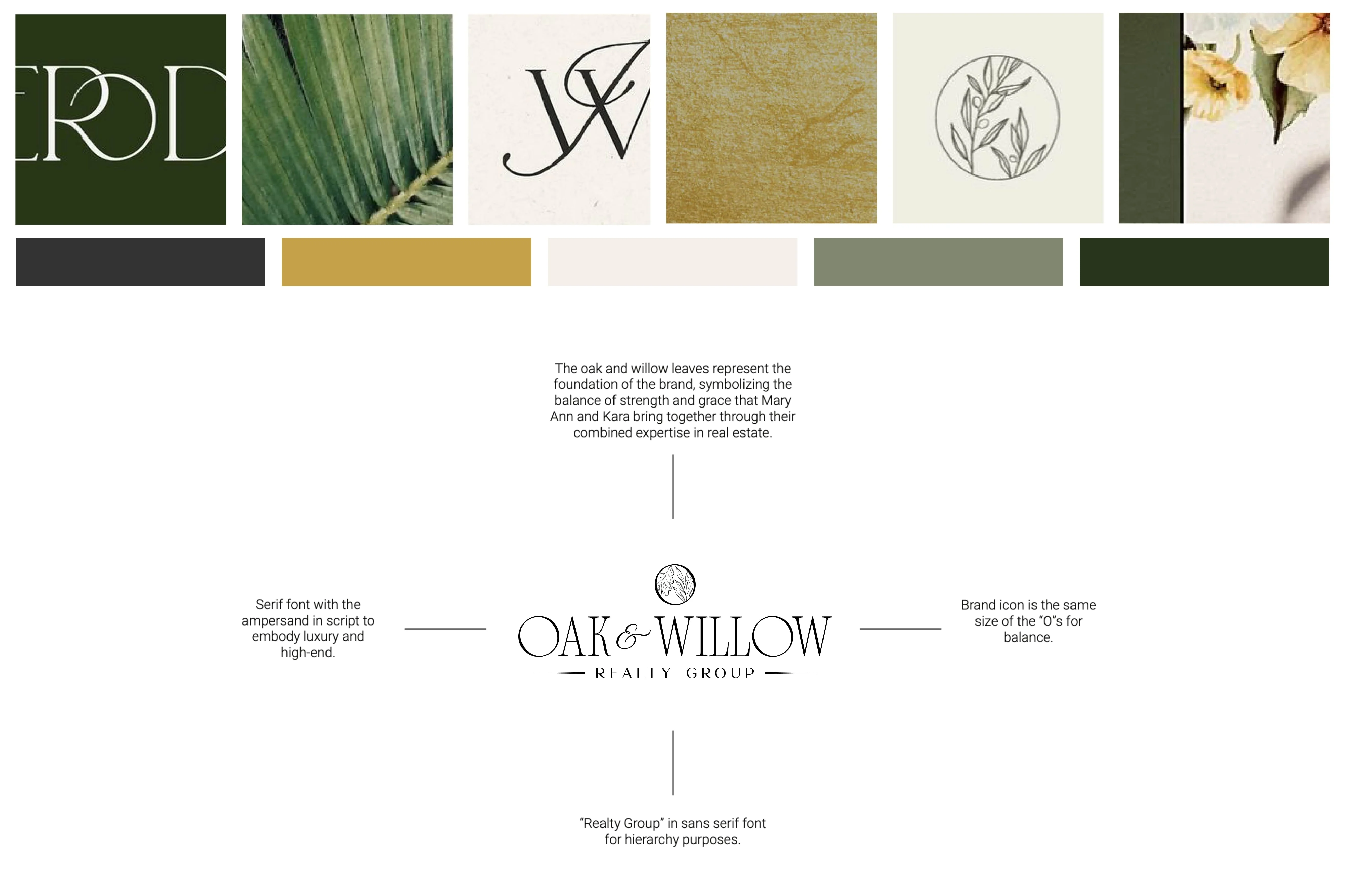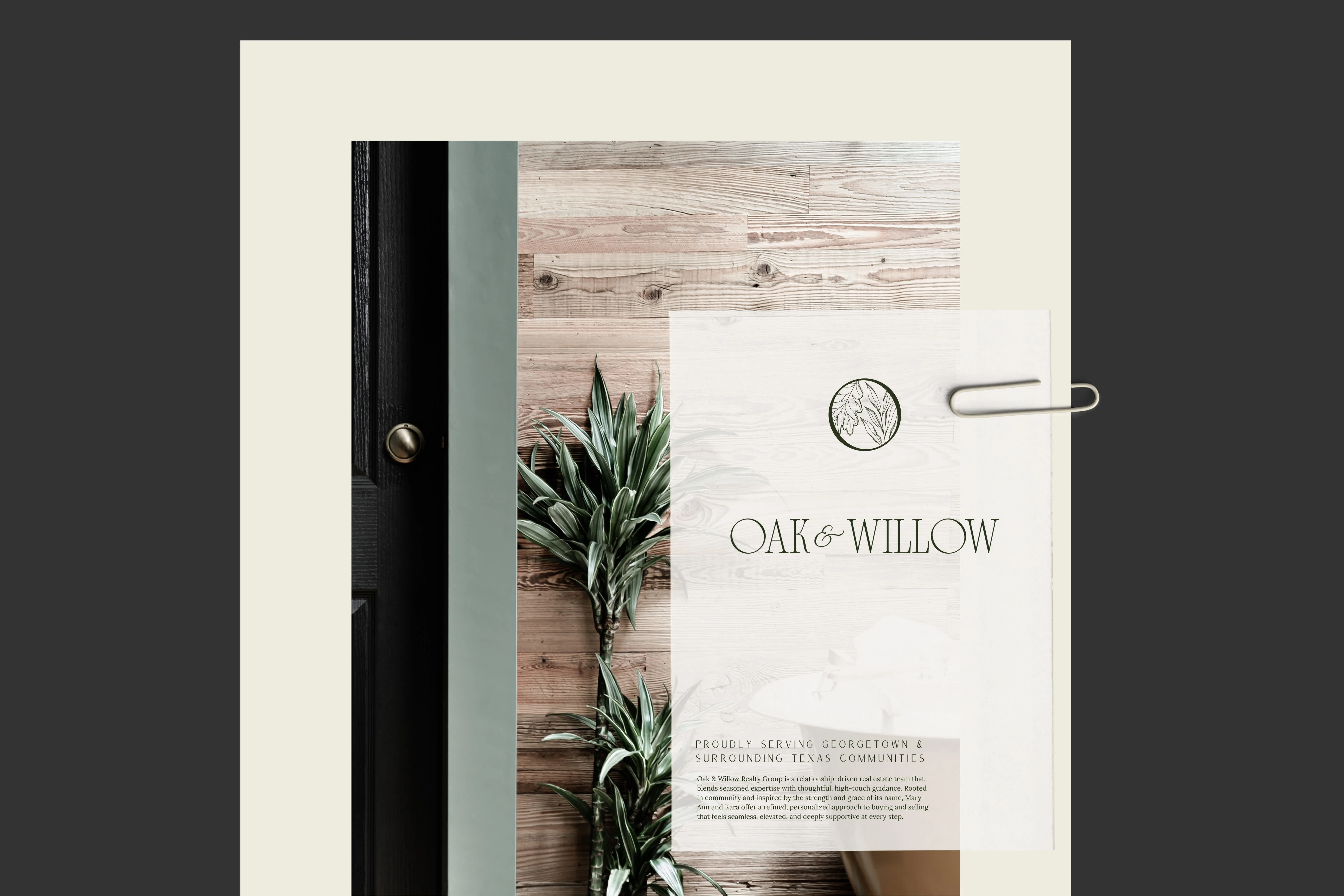 I translated this insight into a luxury-inspired visual system rooted in nature and refined professionalism. Deep forest greens, soft neutrals, and warm gold accents were chosen to reflect trust, sophistication, and the Texas landscape. Elegant serif typography, custom botanical illustrations of oak and willow leaves, and timeless print pieces such as postcards and business cards helped bring the symbolism to life. Every design decision was made to create a brand that feels rooted in community, elevated in presentation, and deeply personal in its client experience.