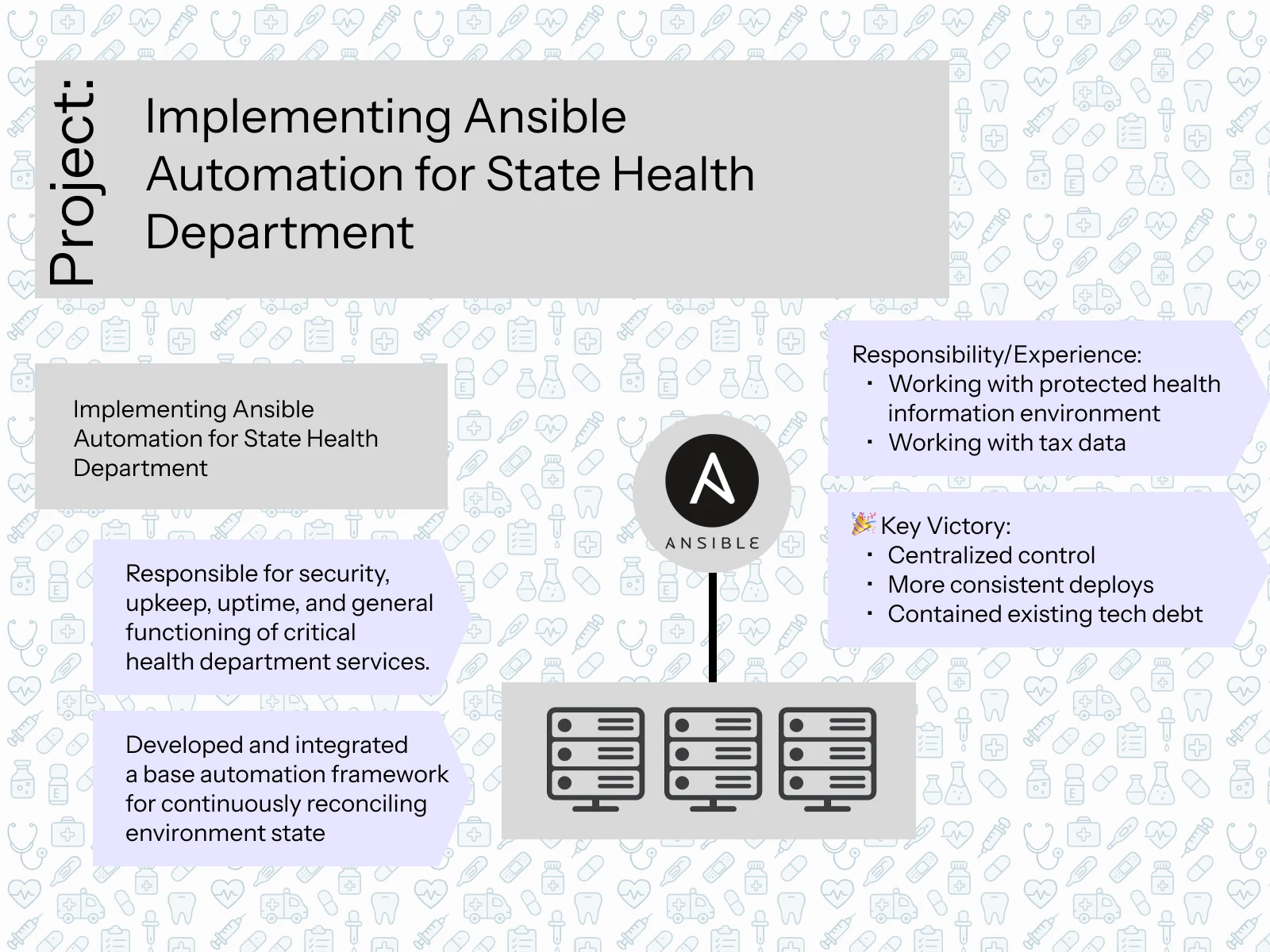 I was instrumental in the build out and utilization of Ansible for implementing proper GitOps and IAC at a State Health Department.