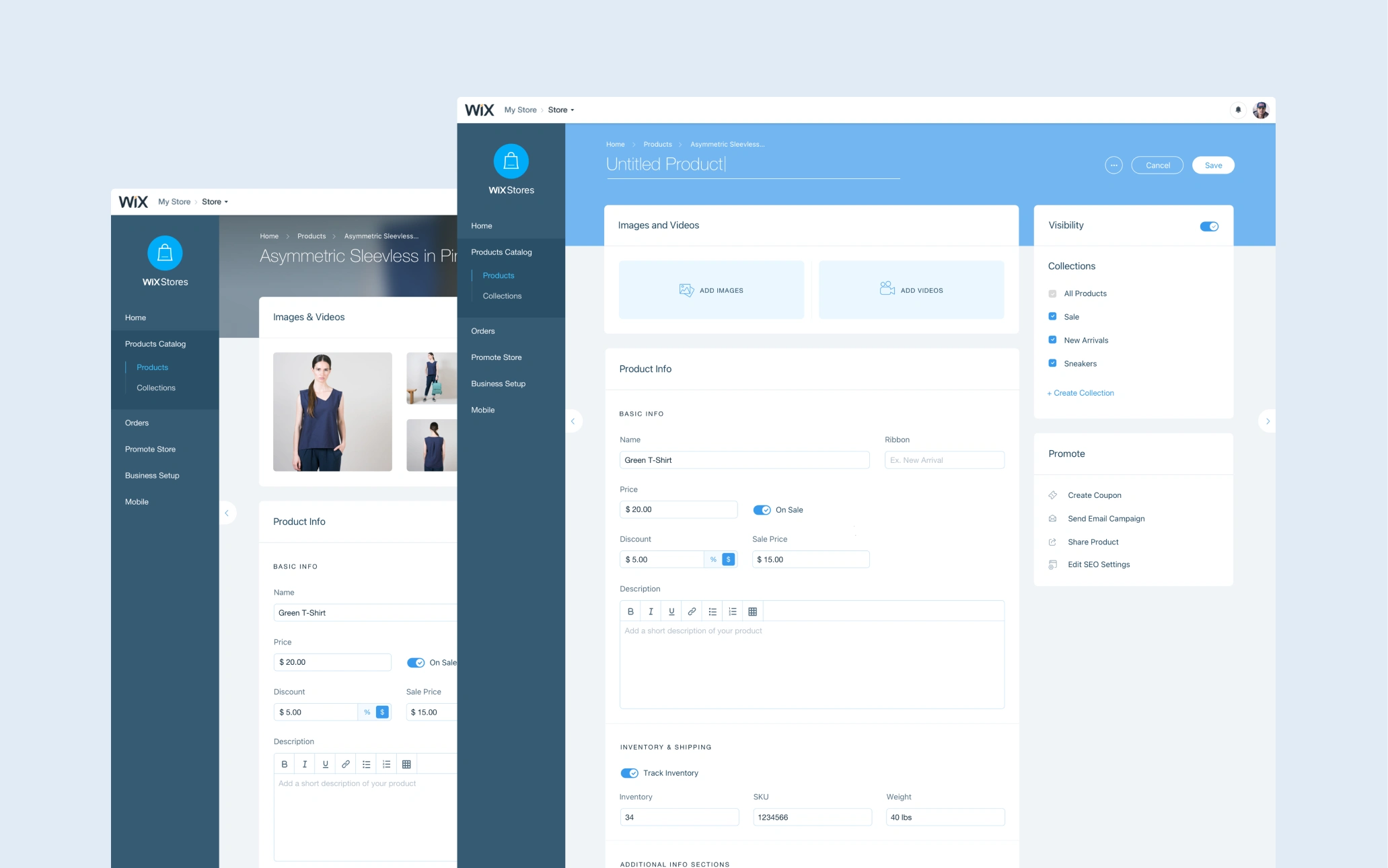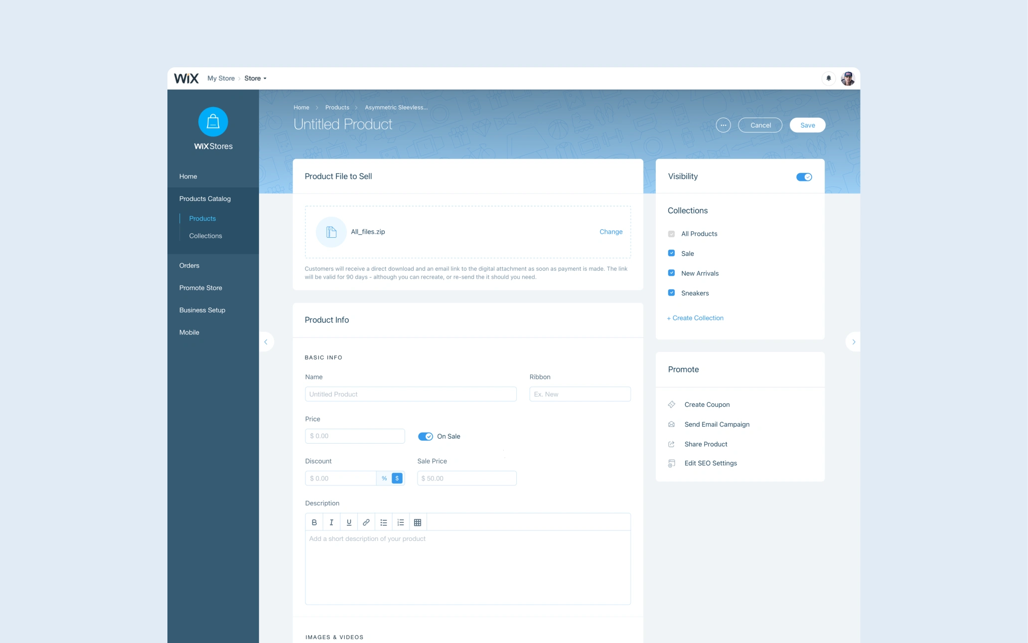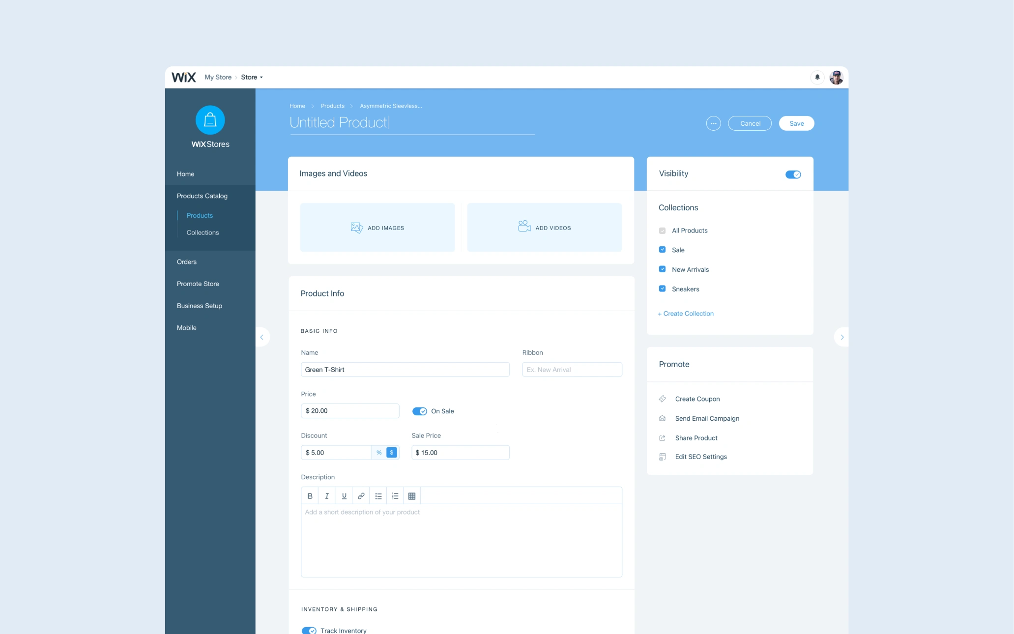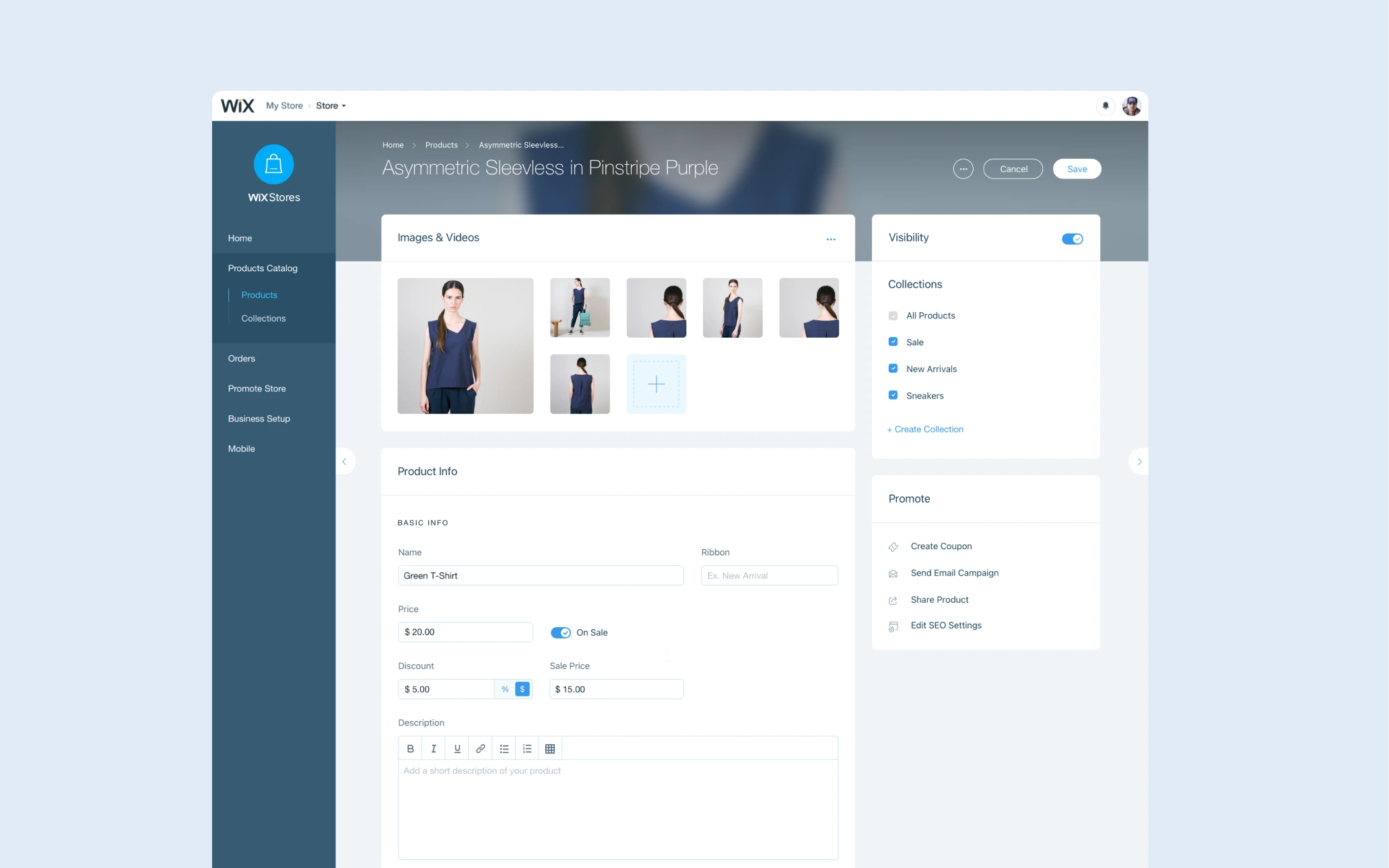 The Wix Stores Product Page shows product details—images, videos, price, description, and variants—helping customers decide what to buy.