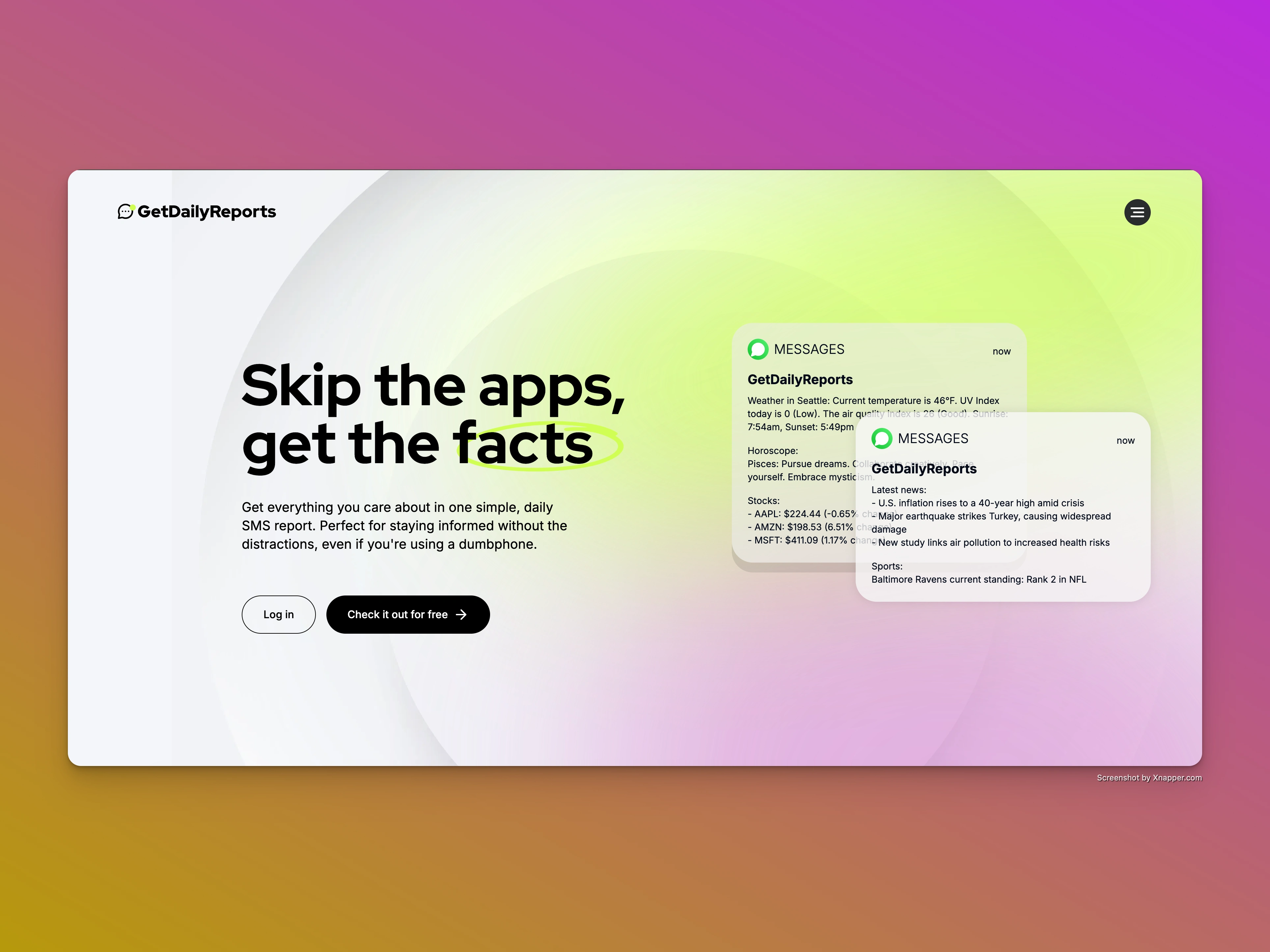 GetDailyReports.com is a smart, personalized SMS service that delivers customized daily reports straight to your phone, keeping you informed with the information that matters most to you—all in one convenient text message.
